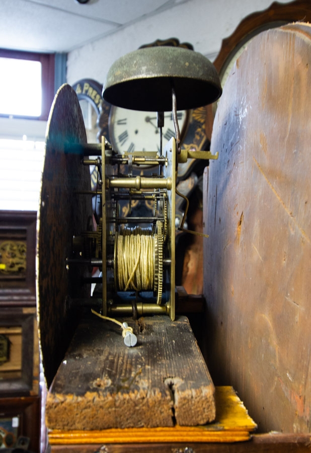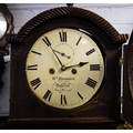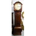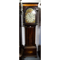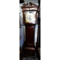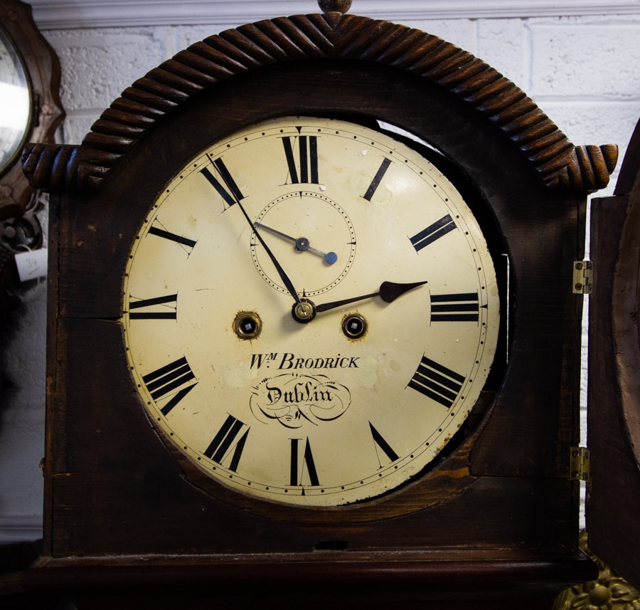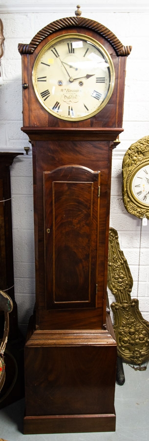 MAHOGANY CASED, ROUND PAINTED DIAL LONGCASE CLOCK CIRCA 1830 WITH WEIGHTS AND PENDULUM BY BRODERICK OF DUBLIN. SEE “IRISH CLOCK AND WATCHMAKERS” BOLES VOL 2 P. 88 FOR A REFERENCE TO THIS CLOCK.