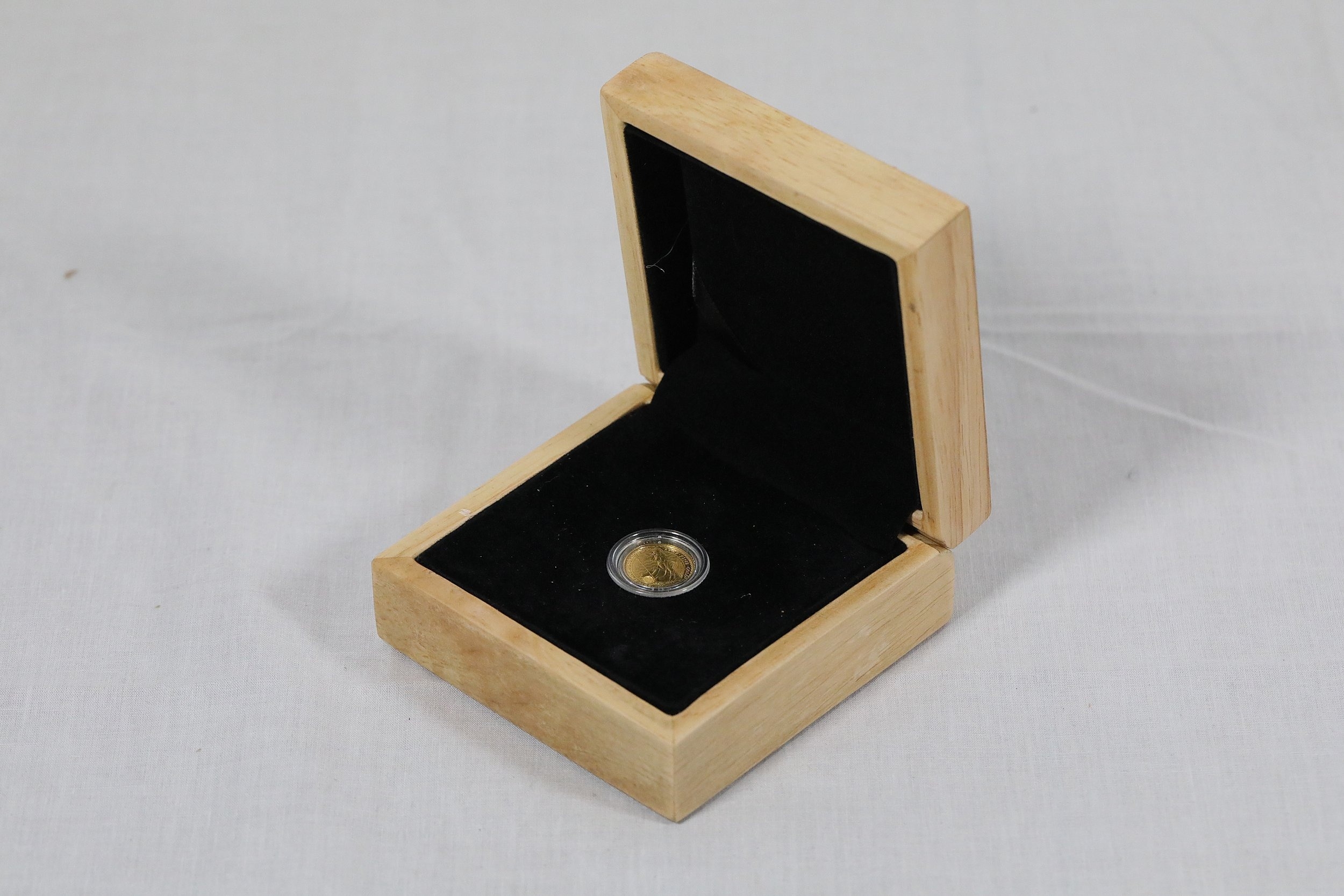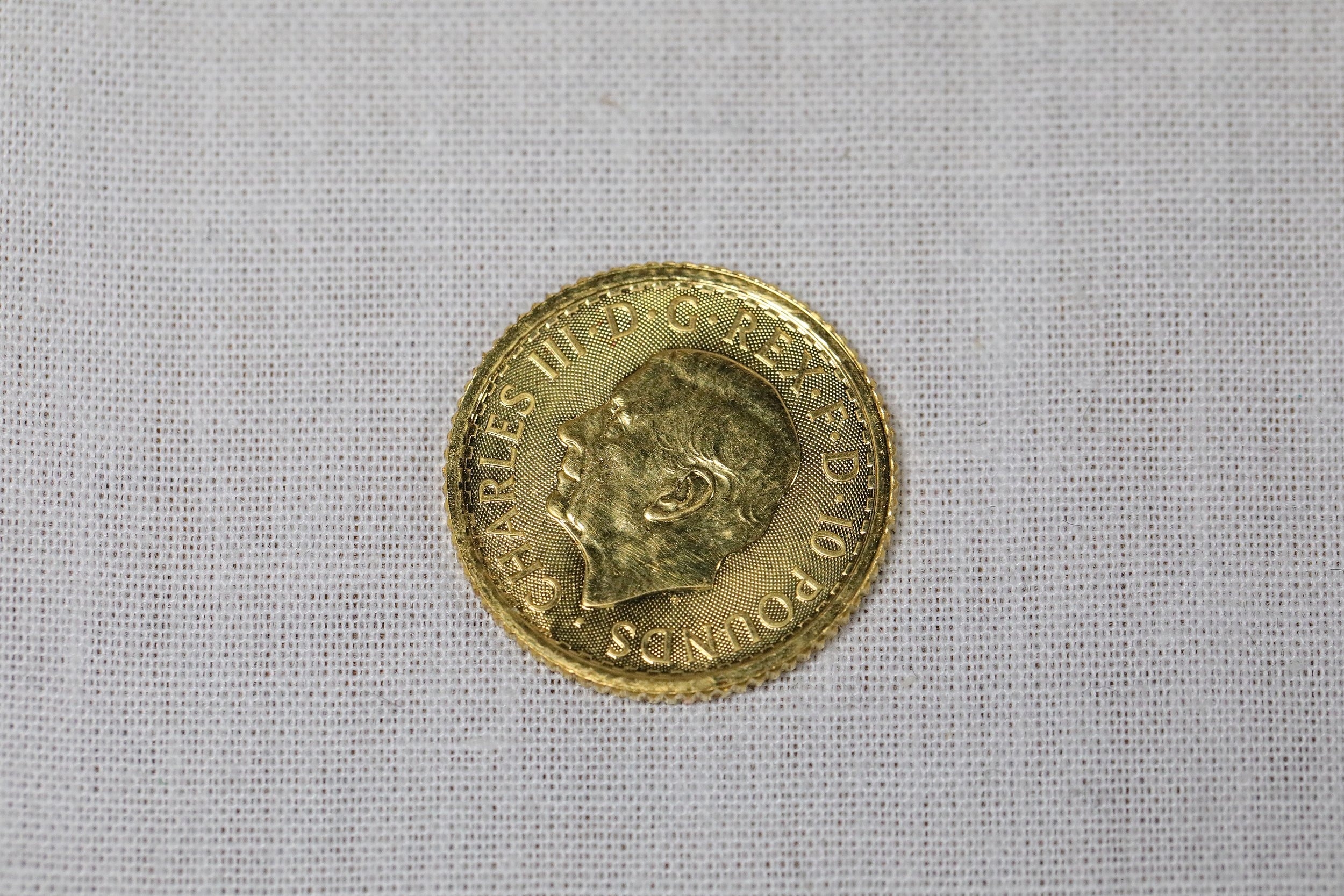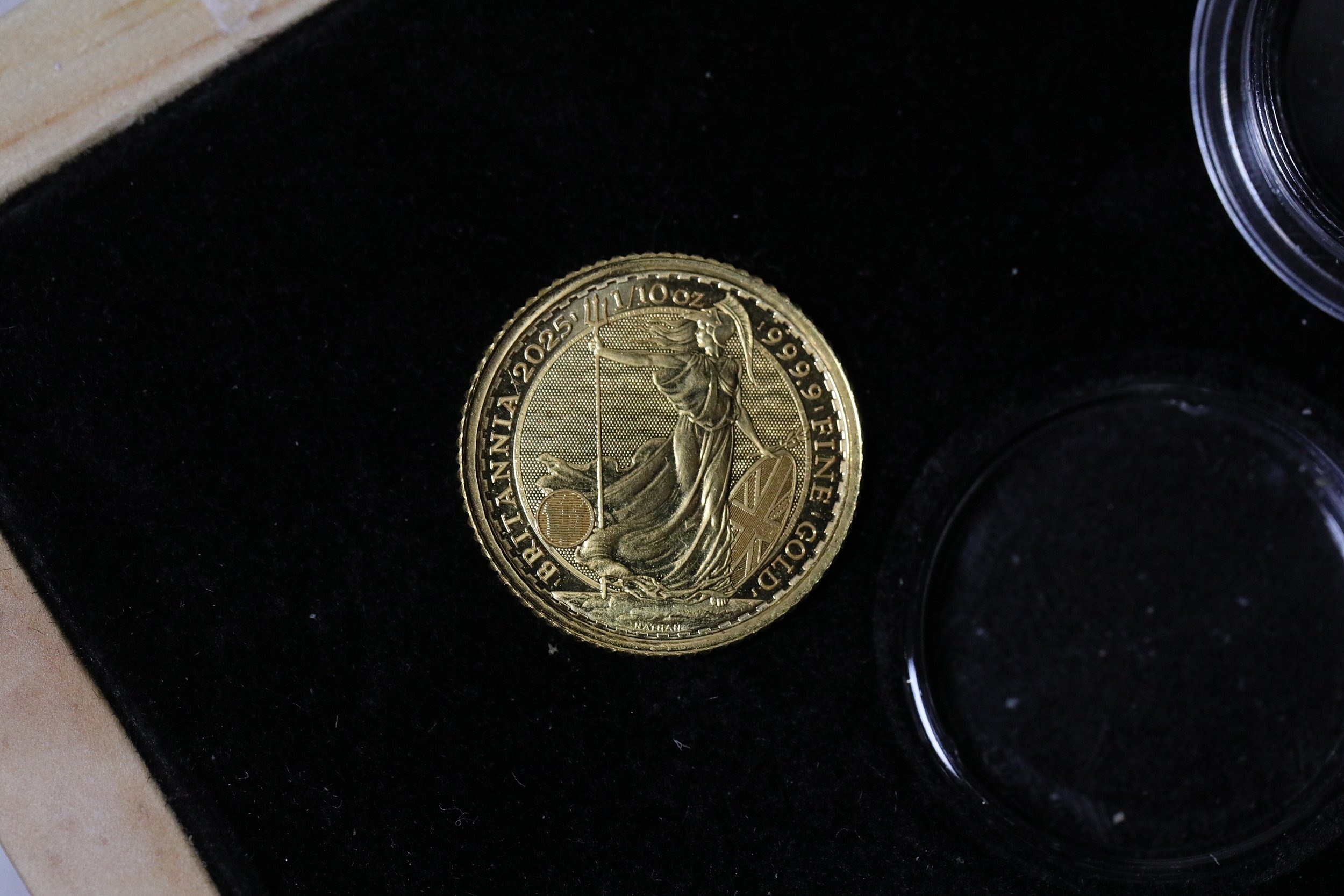 A 2025 Gold Britannia 1/10 ounce coin by The Royal Mint, struck in 999.9 fine gold, denomination 10 Pounds. Obverse with the left-facing portrait of King Charles III and legend CHARLES III D G REX F D 10 POUNDS. Reverse depicts Britannia with trident and Union Flag shield, with inscriptions BRITANNIA 2025 1/10 oz 999.9 FINE GOLD, security textured background and reeded edge. Weight 3.41 g and diameter 16.5 mm. Housed in a light wood hinged presentation box with black velvet interior and protective clear capsule. The Britannia is the official gold bullion coin of the United Kingdom, first issued in 1987.