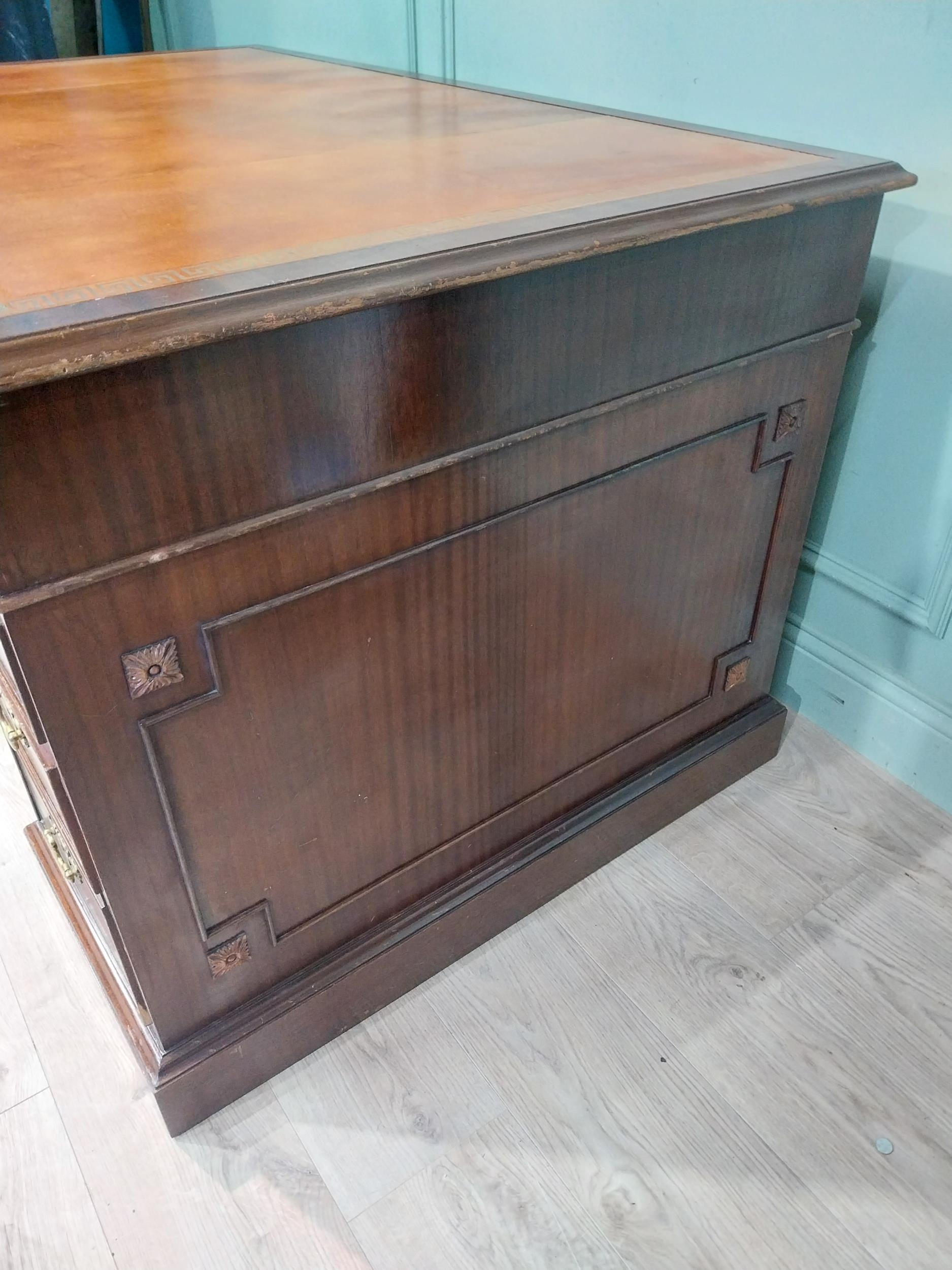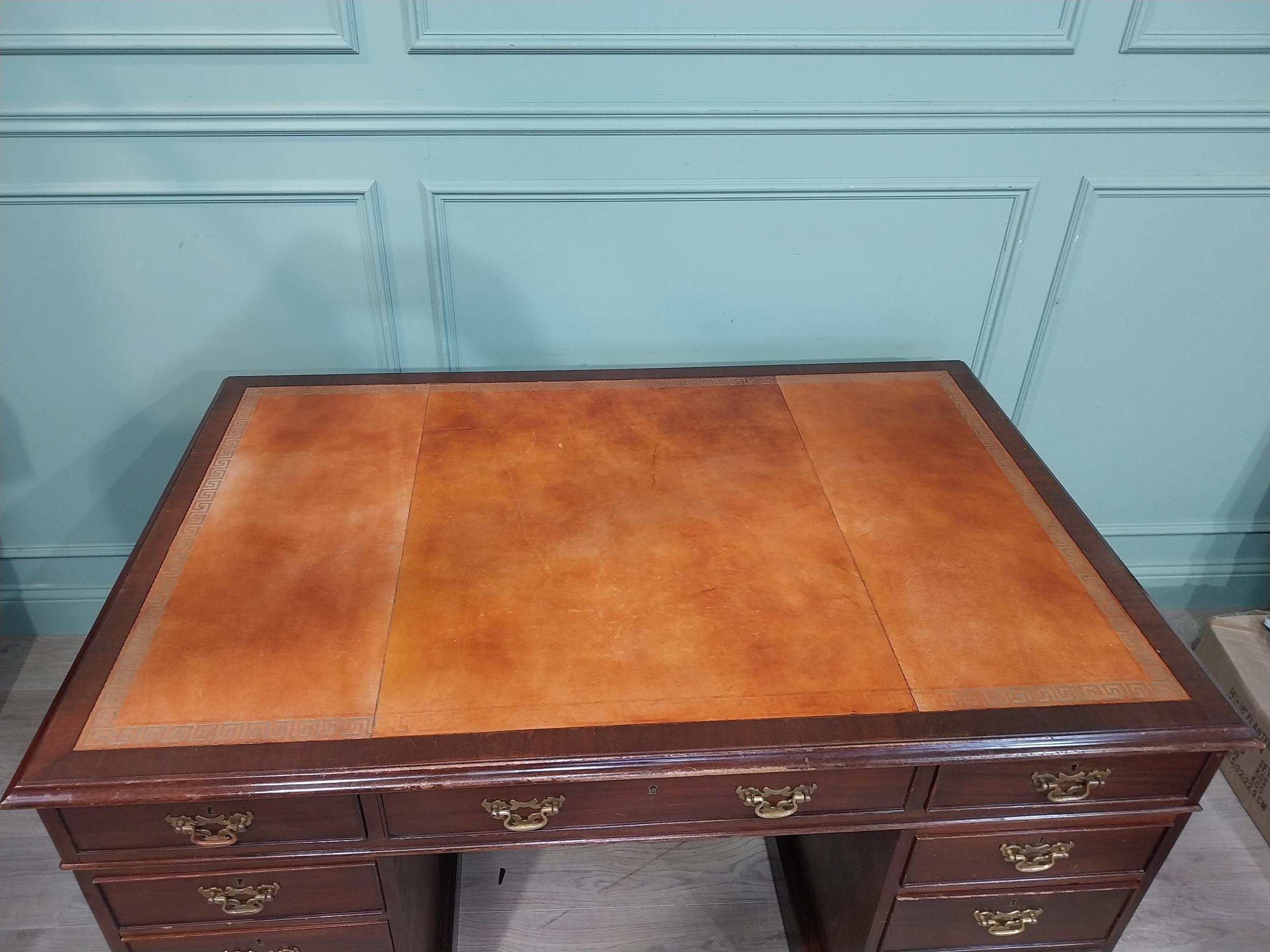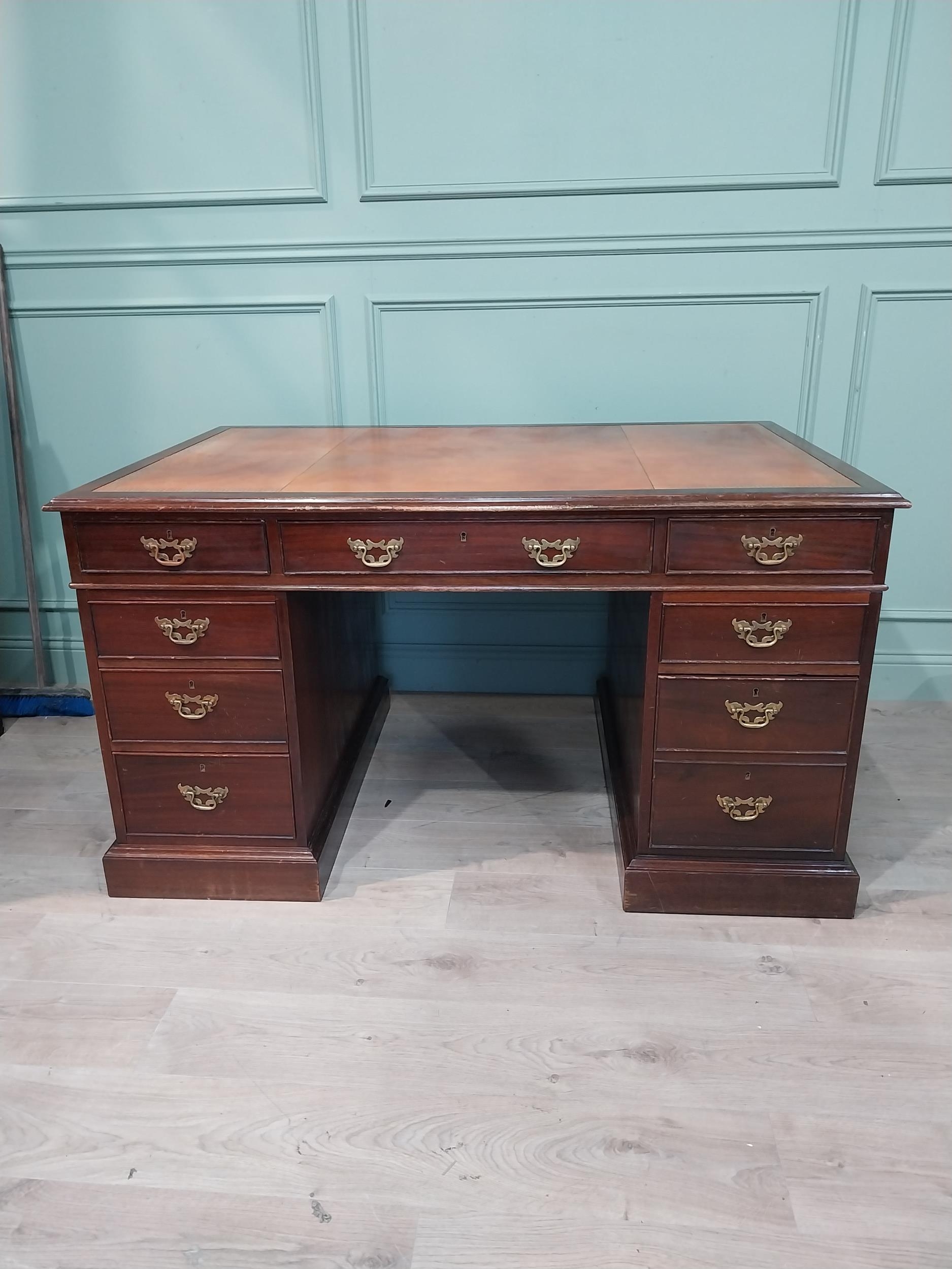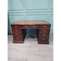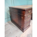 Mahogany pedestal desk with inset leather top in the 19th C. style. {79 cm H x 140 cm W x 93 cm D}.