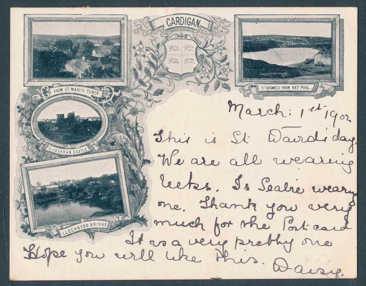 Wales. Misc. coln. filed in 20 flip top photo albums. Tresaith mainly general views but better cards noted. Gwbert-on-Sea, Poppit, salmon fishing general views etc. Aberporth general views, beach scenes, better RP and ptd. street scenes, Penbryn, Tanygroes, Sarnau, Brynmoriah Brynhoffnant, Llangranog with better RP and ptd. street scenes noted, beach and general views. Newquay mainly general views, Nanternis, SynodInn, Caerwedros etc. Early and court size cards incl. Aberystwyth, Cardiff, Tenby, Penarth, Swansea, Raglan, Chepstow, Newport , Cardigan and Lampeter. Few photos noted. Qty. approx. 1700 (B)