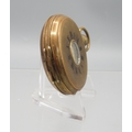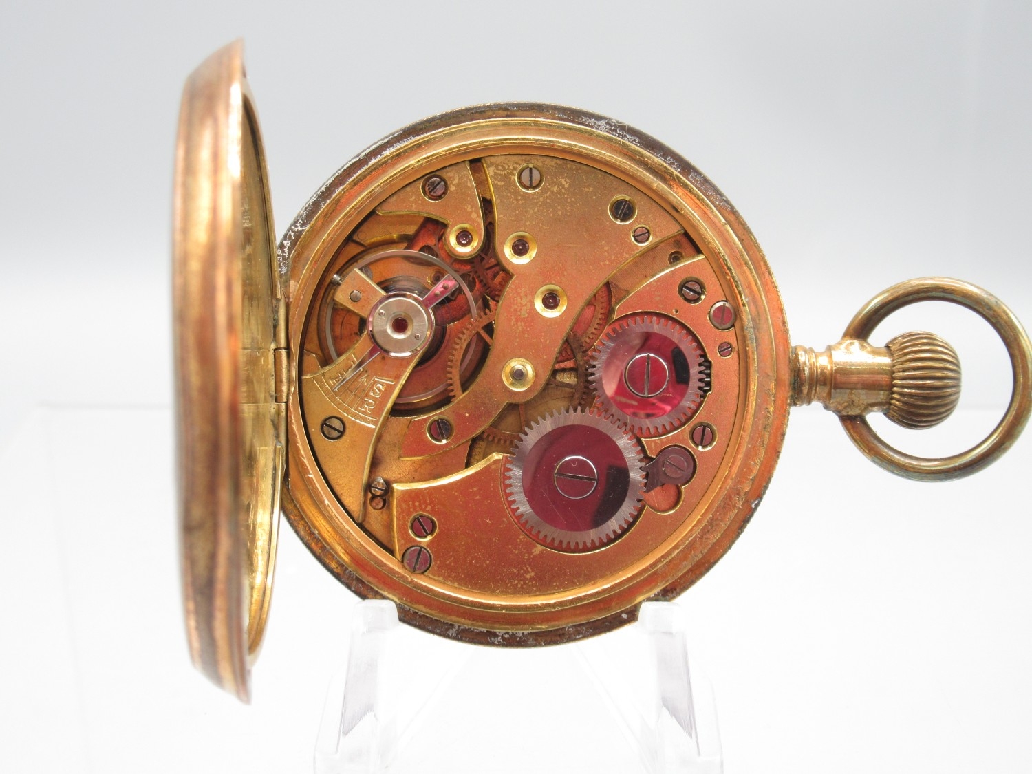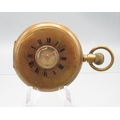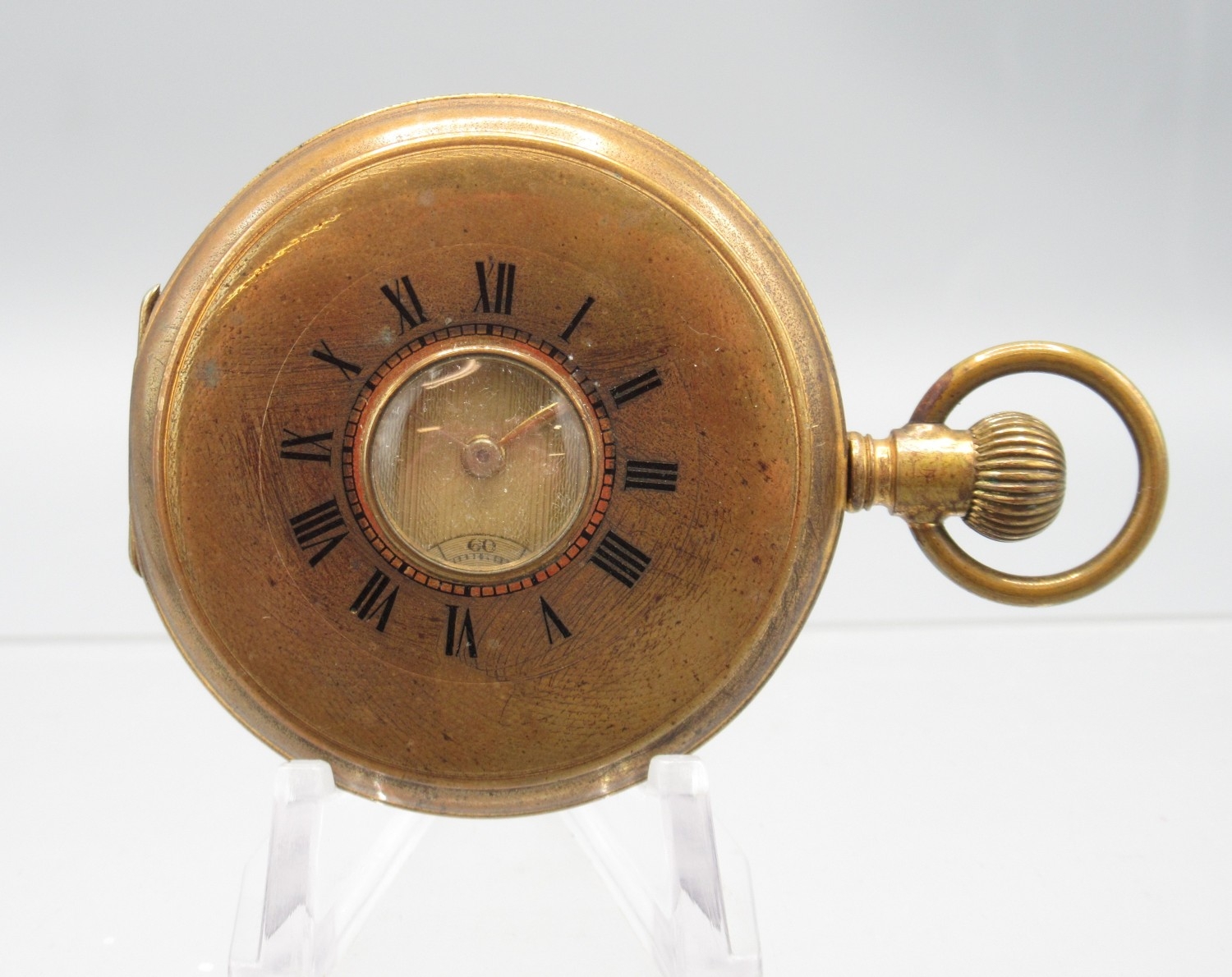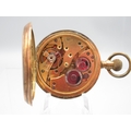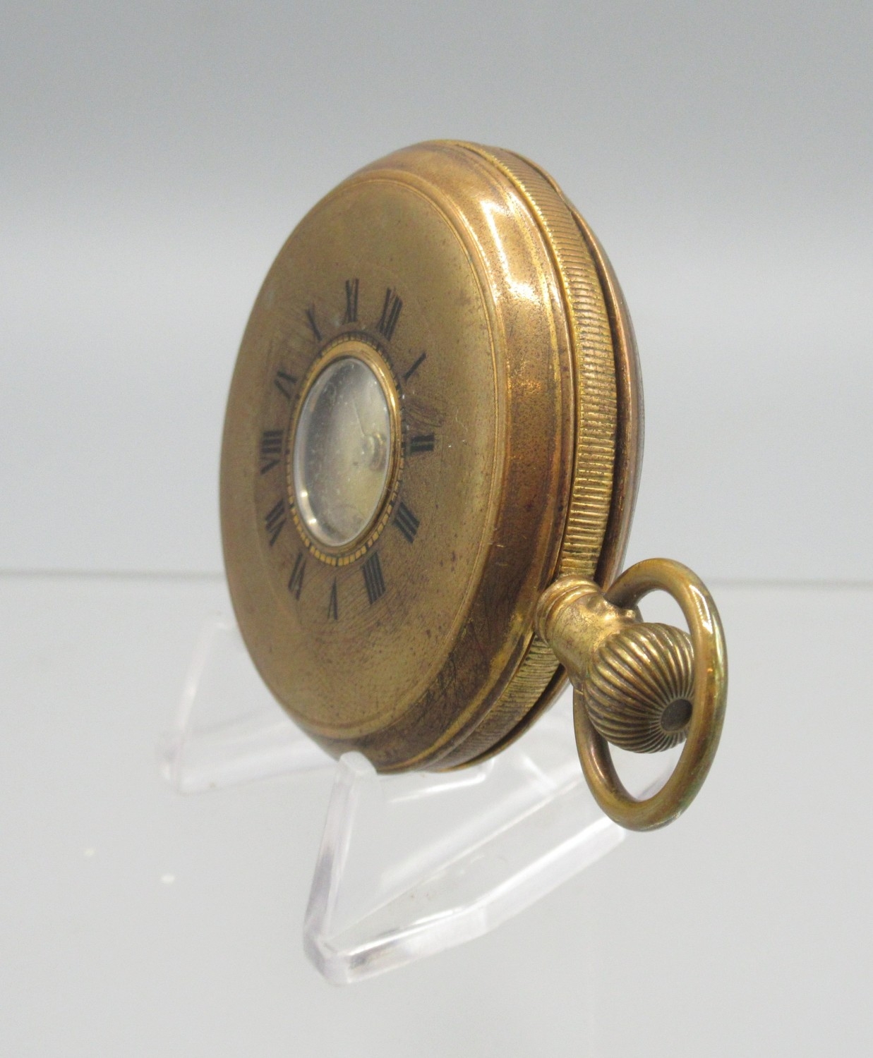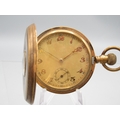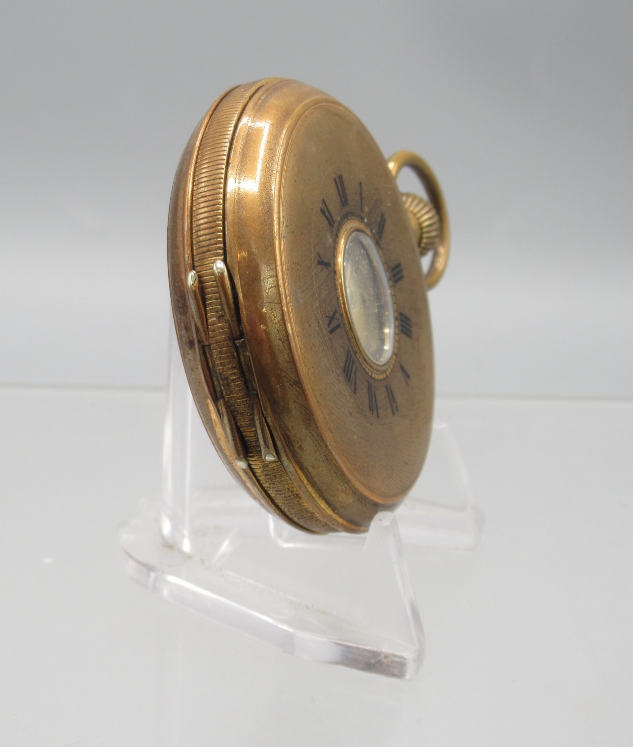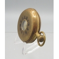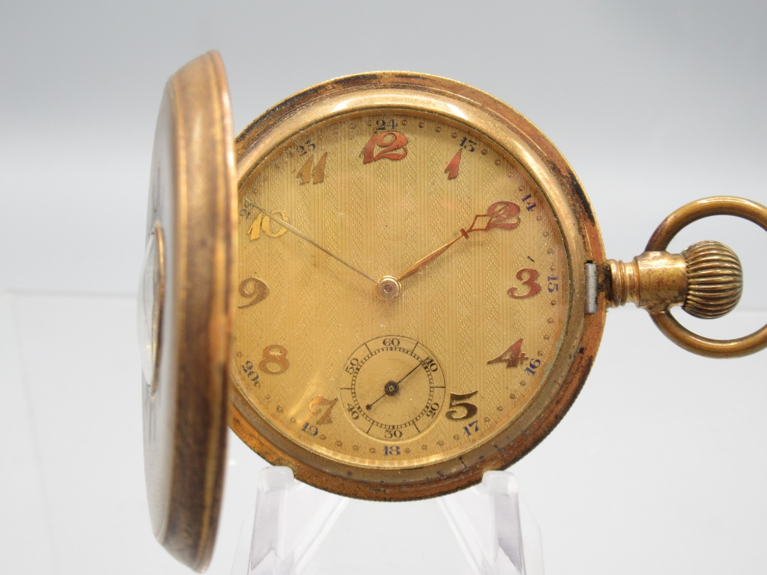 Swiss gold plated keyless half hunter pocket watch, gold engine turned striped Arabic dial with subsidiary seconds, engraved coin edge case, Swiss bridge plate movement, D50.7mm