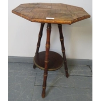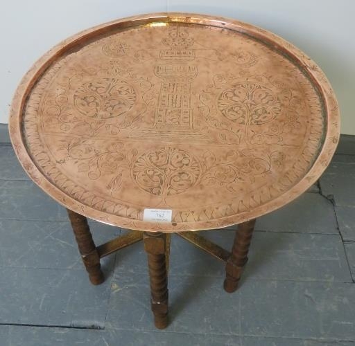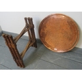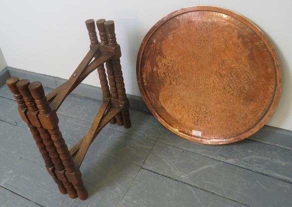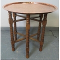 An Islamic brass topped Benares style table, featuring hand tooled designs, on folding ball turned oak stand.