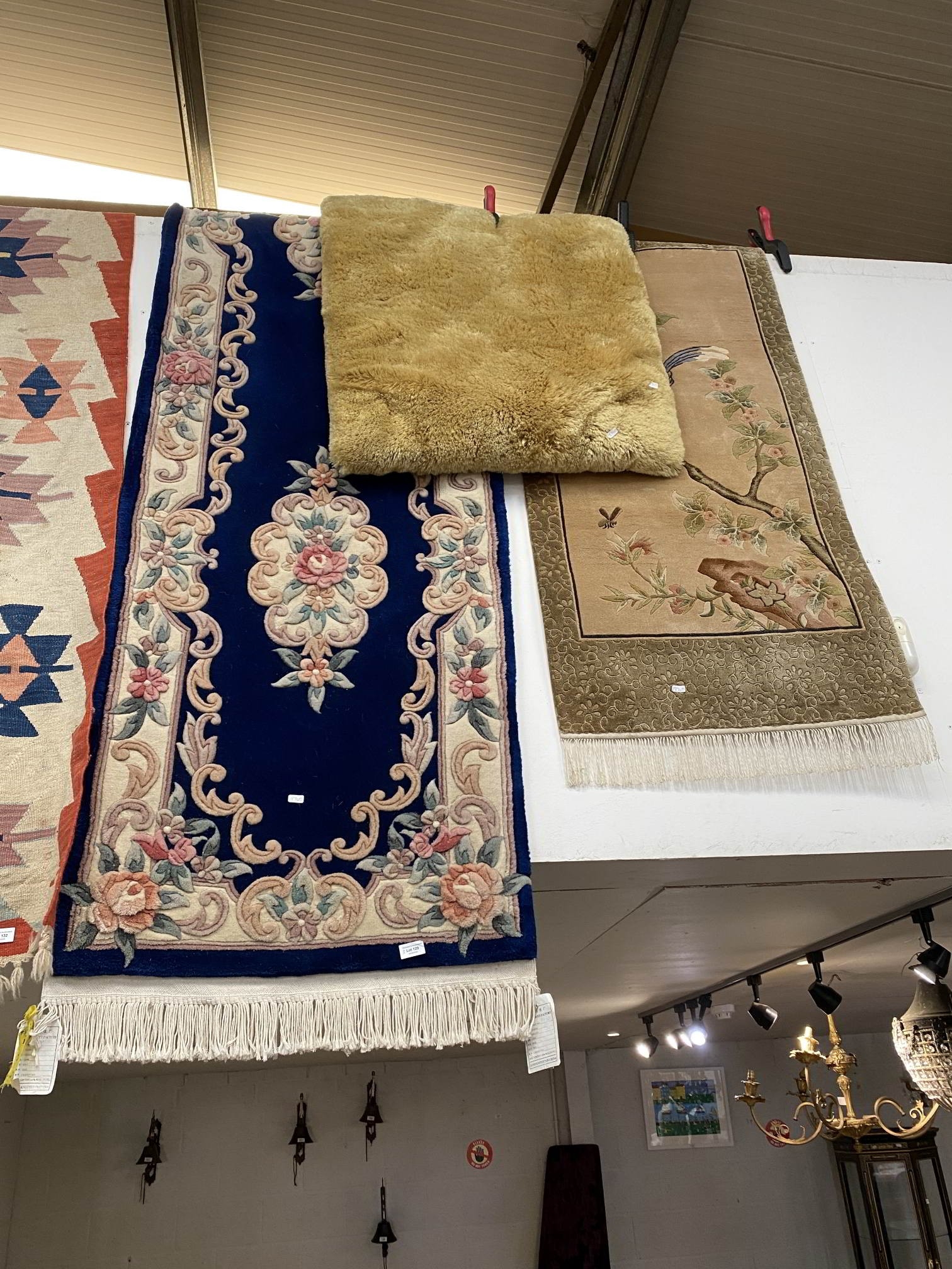 Pure mohair rug in honey 97 x 71cm, blue Chinese inspired runner 242 x 74cm & a Chinese silk carpet/wall hanging 143 x 68cm