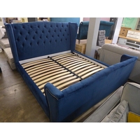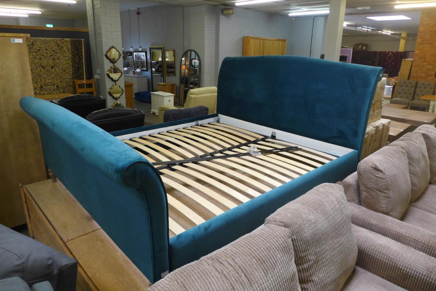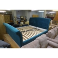 A teal blue upholstered superking bed frame
