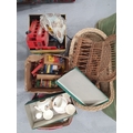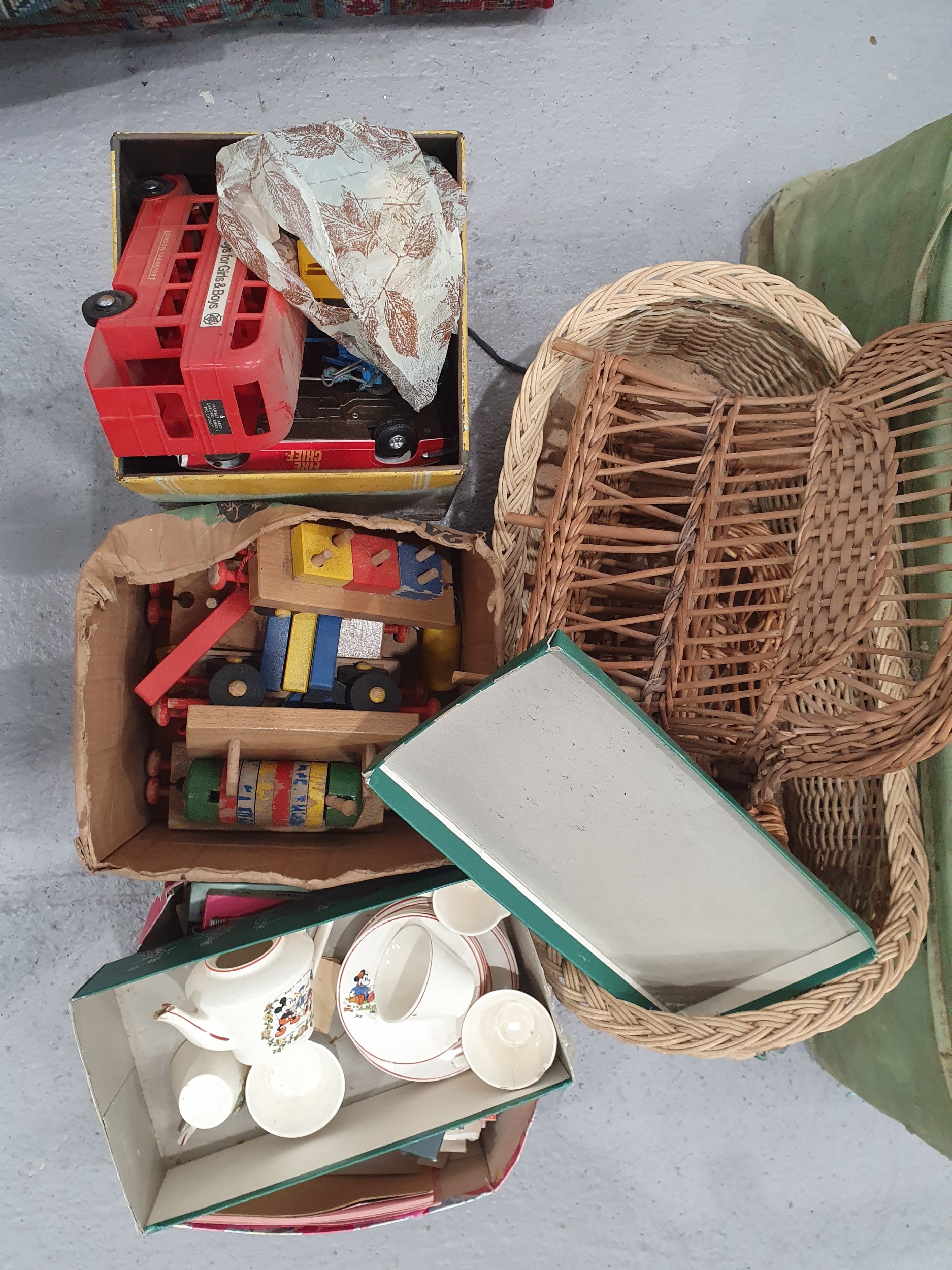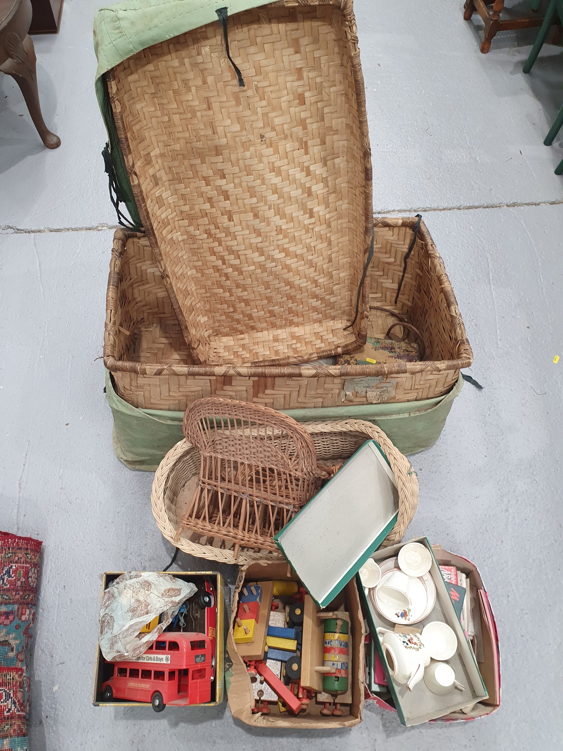 A canvas covered Wicker Basket containing a box of playworn Diecast Models to include a Corgi Massey Ferguson 165 Tractor, a Dolls Wicker Settee, Chair and Crib, a quantity of Games, etc. (R2).