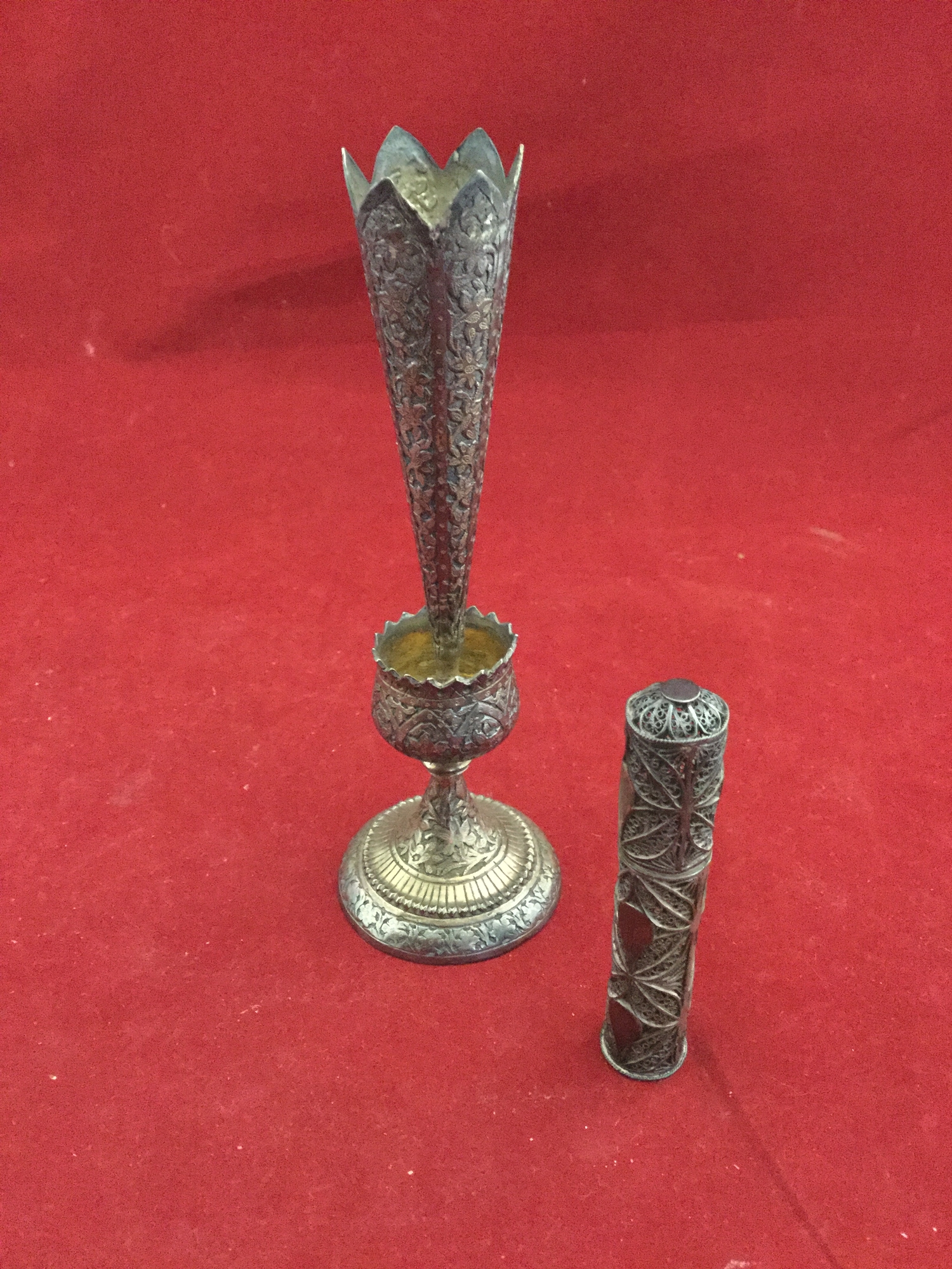 A white metal bud vase, together with a filigree work box and cover (2) -