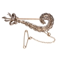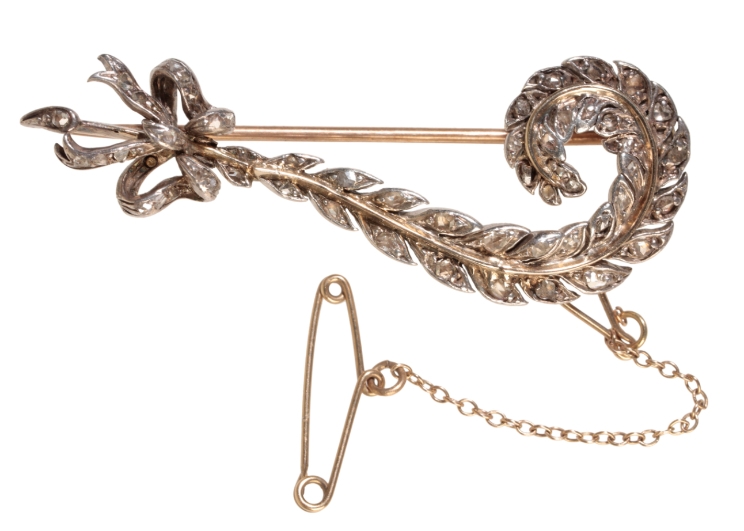 A VICTORIAN DIAMOND BROOCH, old-cut diamonds set to a curved leaf, with bow terminal, on unmarked yellow metal with attached safety chain, 4.7cm long
