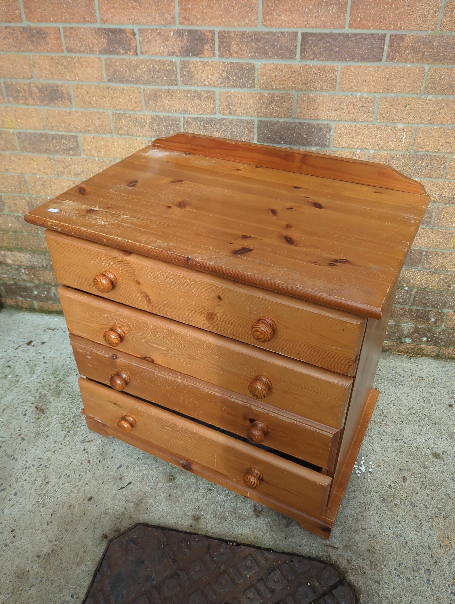 This is a pine chest of drawers featuring four spacious drawers, each with round wooden knobs. The design is simple and functional, ideal for bedroom or storage use. The wood displays a warm finish with visible grain patterns typical of pine.