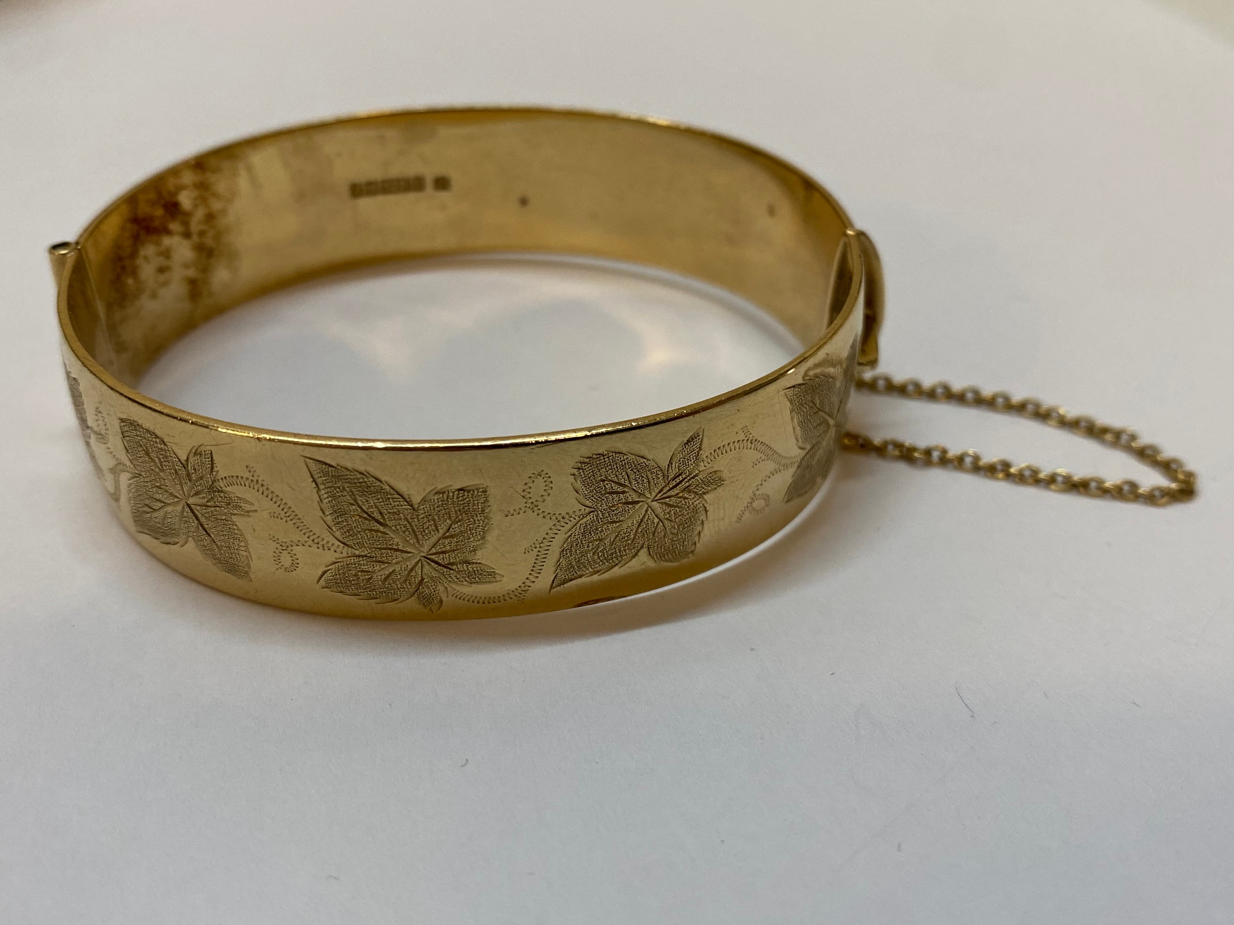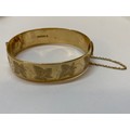 A heavy 9ct. gold hinged bangle with engraved decoration to ...