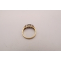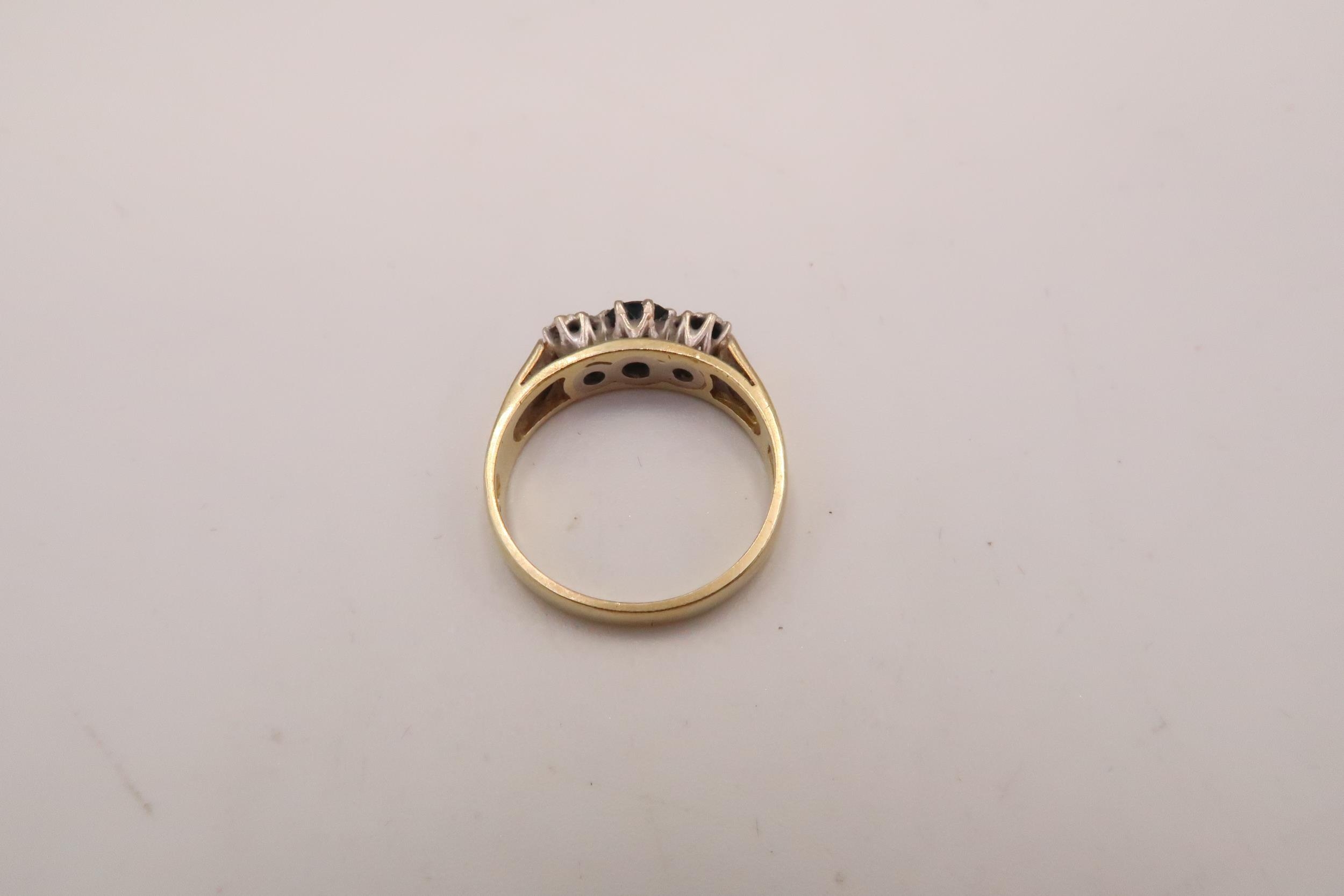 An 18ct gold, sapphire and diamond three stone ring, the central dark blue sapphire of approximately 4.8mm diameter, with an illusion set diamond either side, ring size M/N, 3.7g.