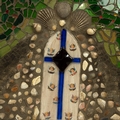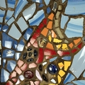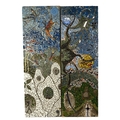 Two Architectural designer mosaic panels constructed from porcelain and glass with futuristic/abstract scenes, each 60cm x 183cm.