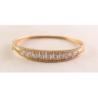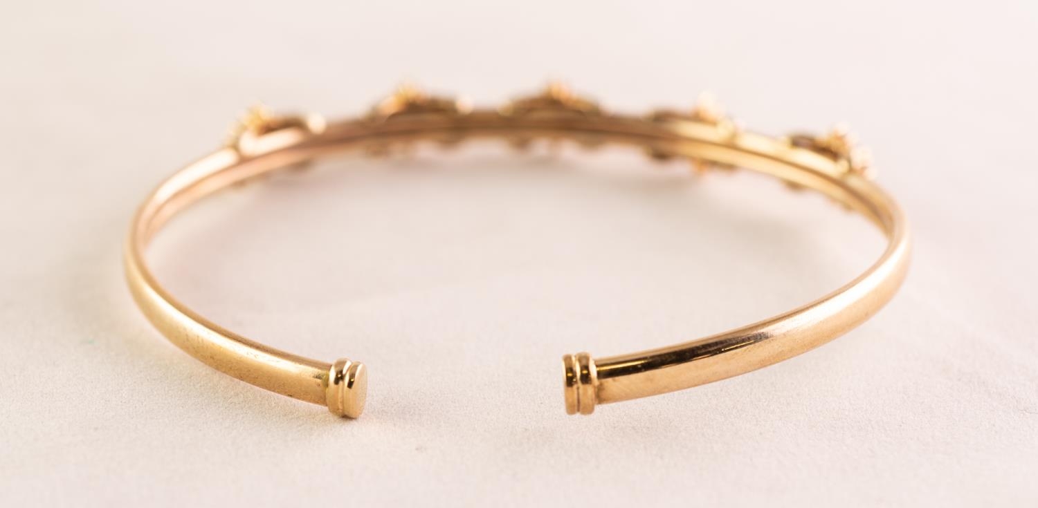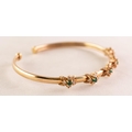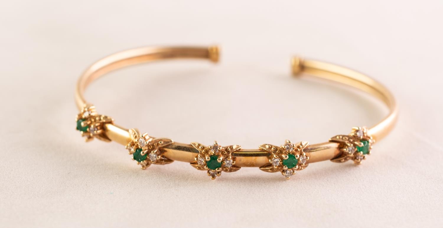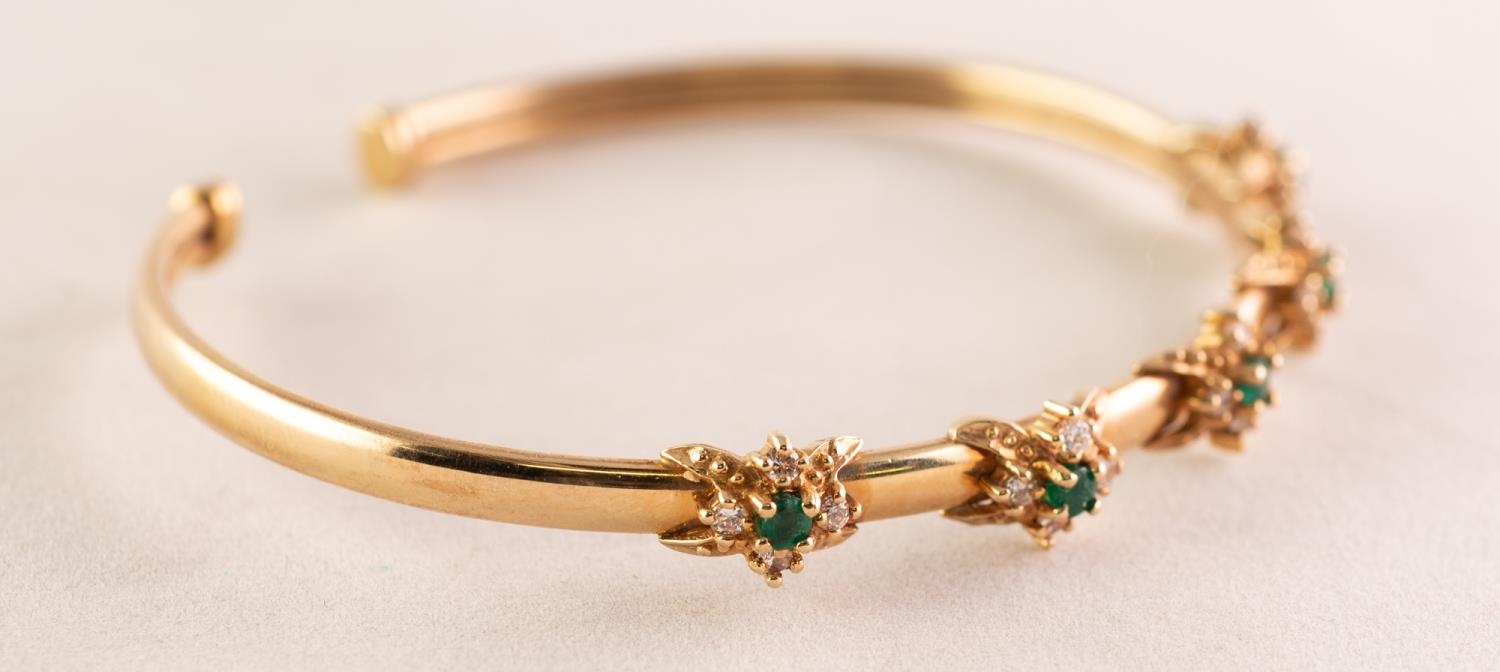9ct GOLD NARROW TORQUE BANGLE, the top set with five clusters each with a small centre emerald and surround of four small white stones, Birmingham 1999, 8.8 gms