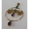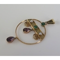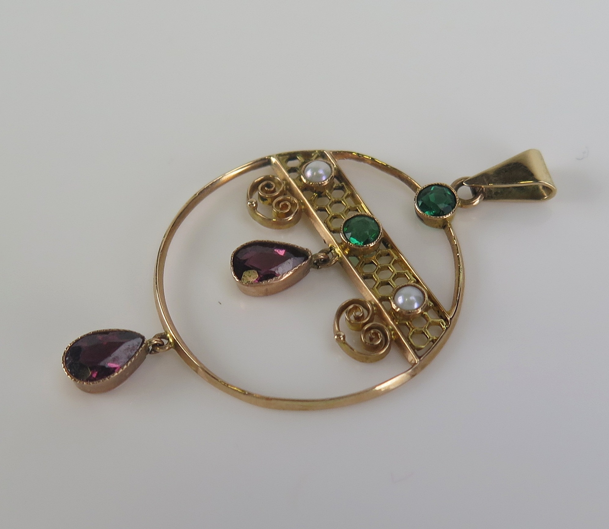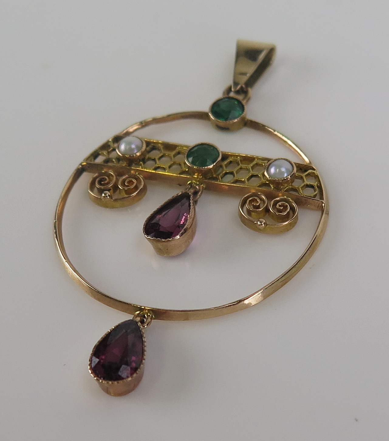A garnet, seed pearl and paste pendant in a precious yellow metal setting, 47mm drop, KEE tests as 9ct, 2.76g. UNLESS OTHERWISE STATED, THE KEE TEST IS A SURFACE TEST ONLY AND IS NOT A GUARANTEE OF GOLD PURITY.