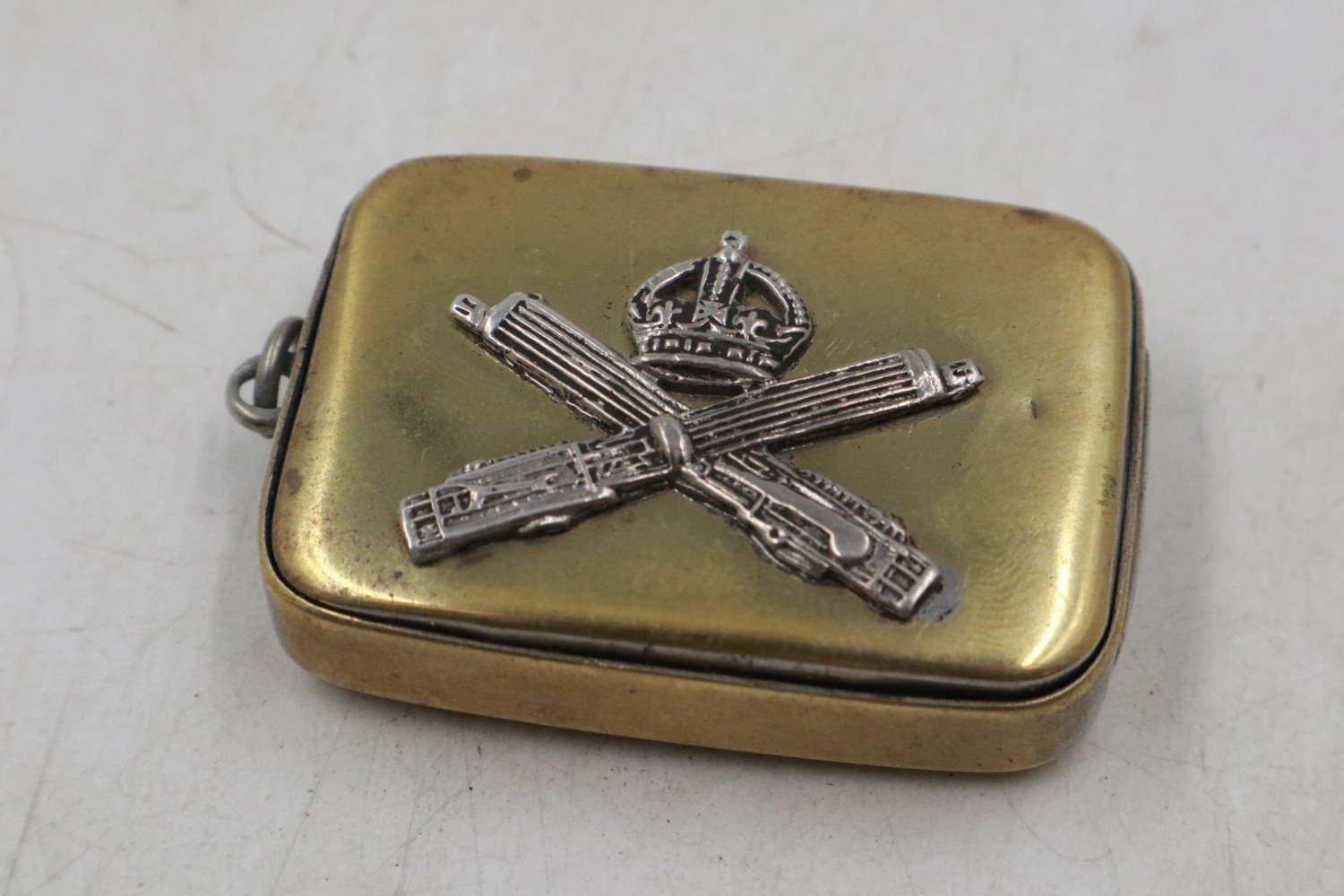 MGC interest: WWI period vesta case surmounted with a Silver Officers Collar Badge of the Machine Gun Corps. UK P&P Group 1 (£18+VAT for the first lot and £2+VAT for subsequent lots)