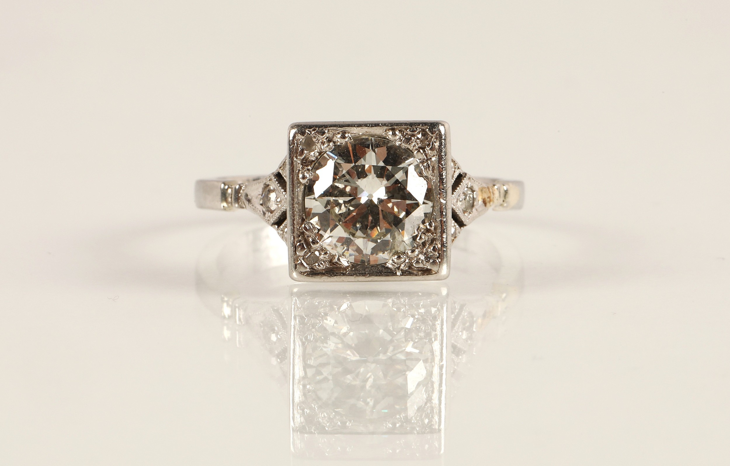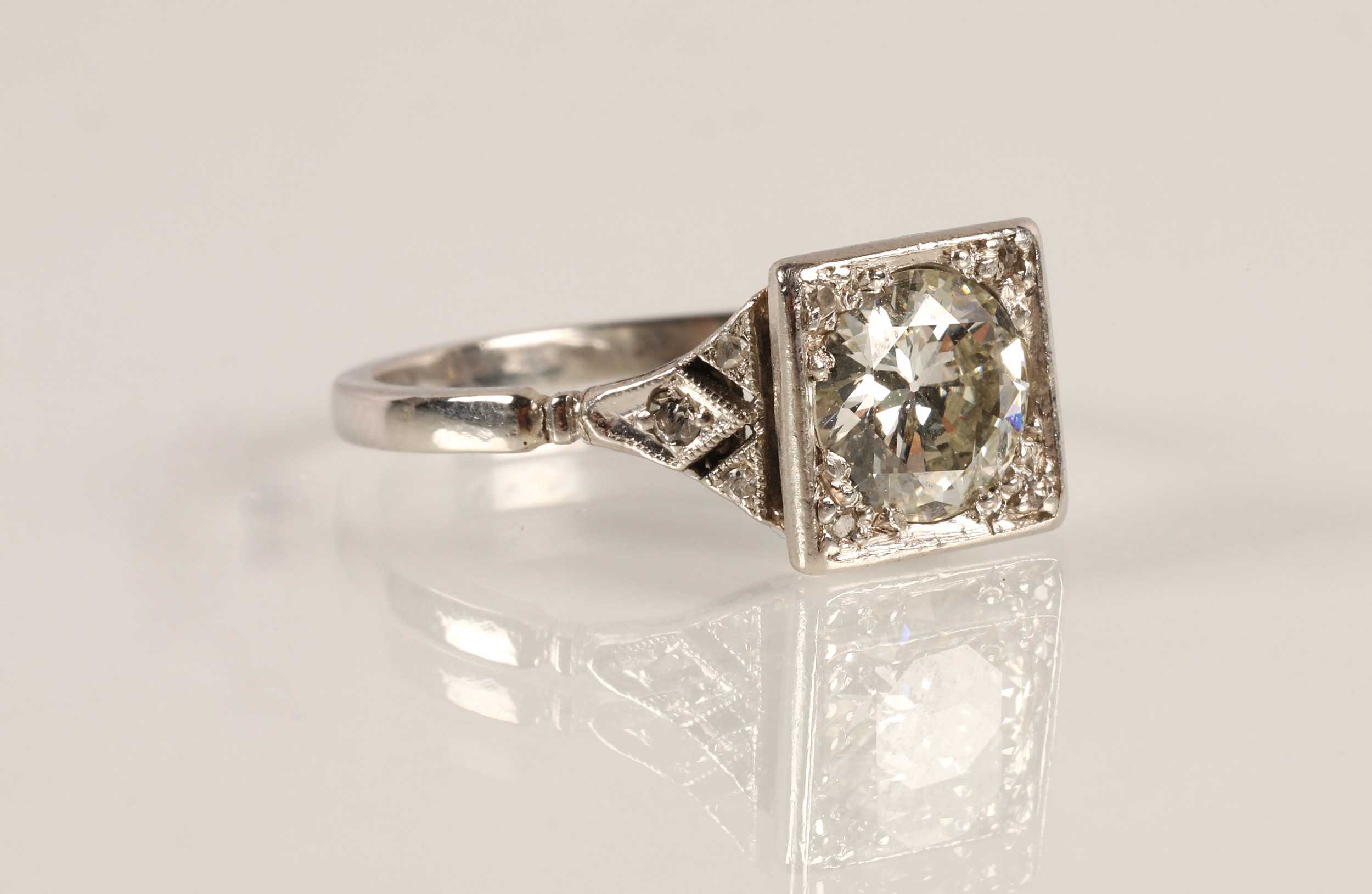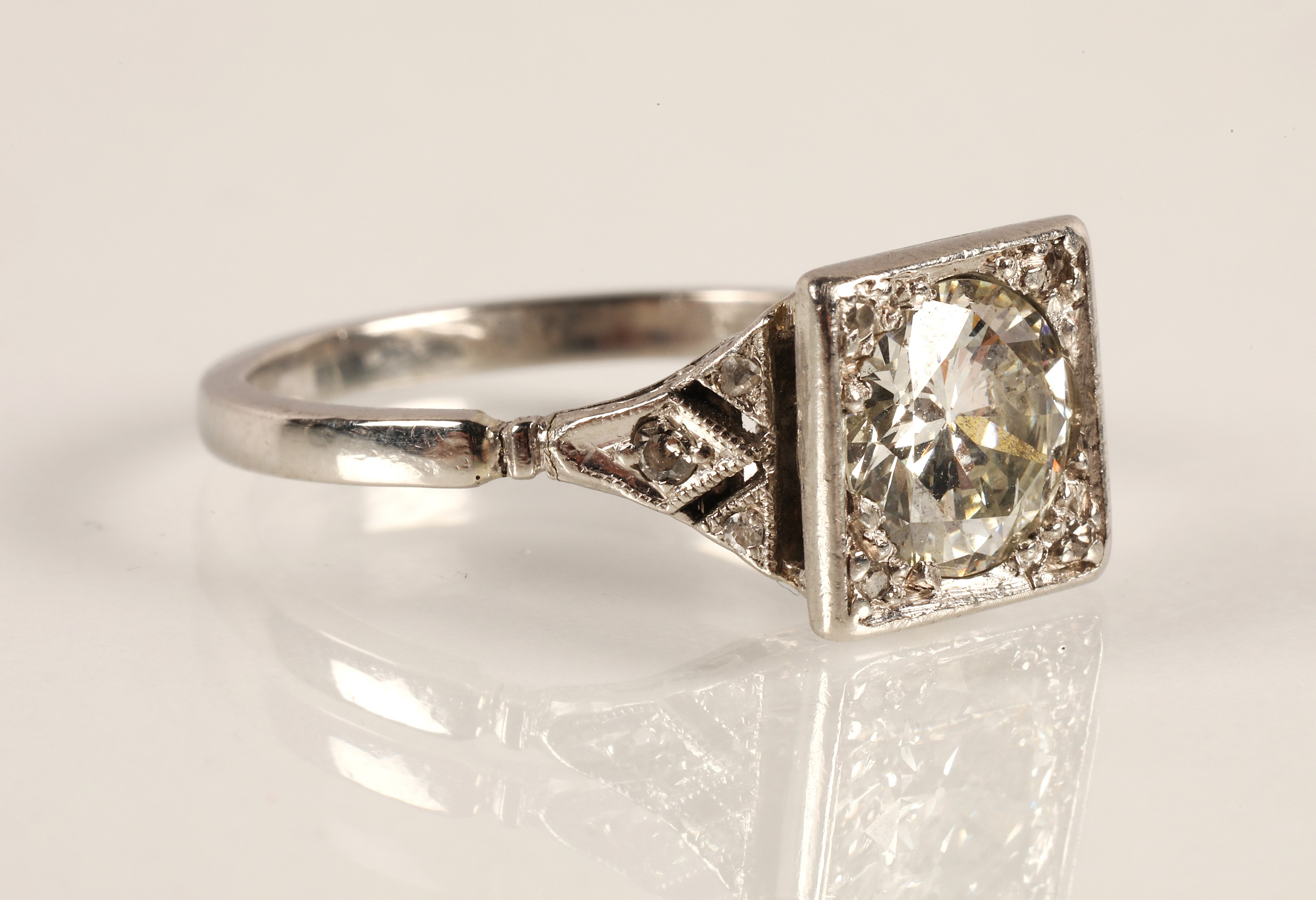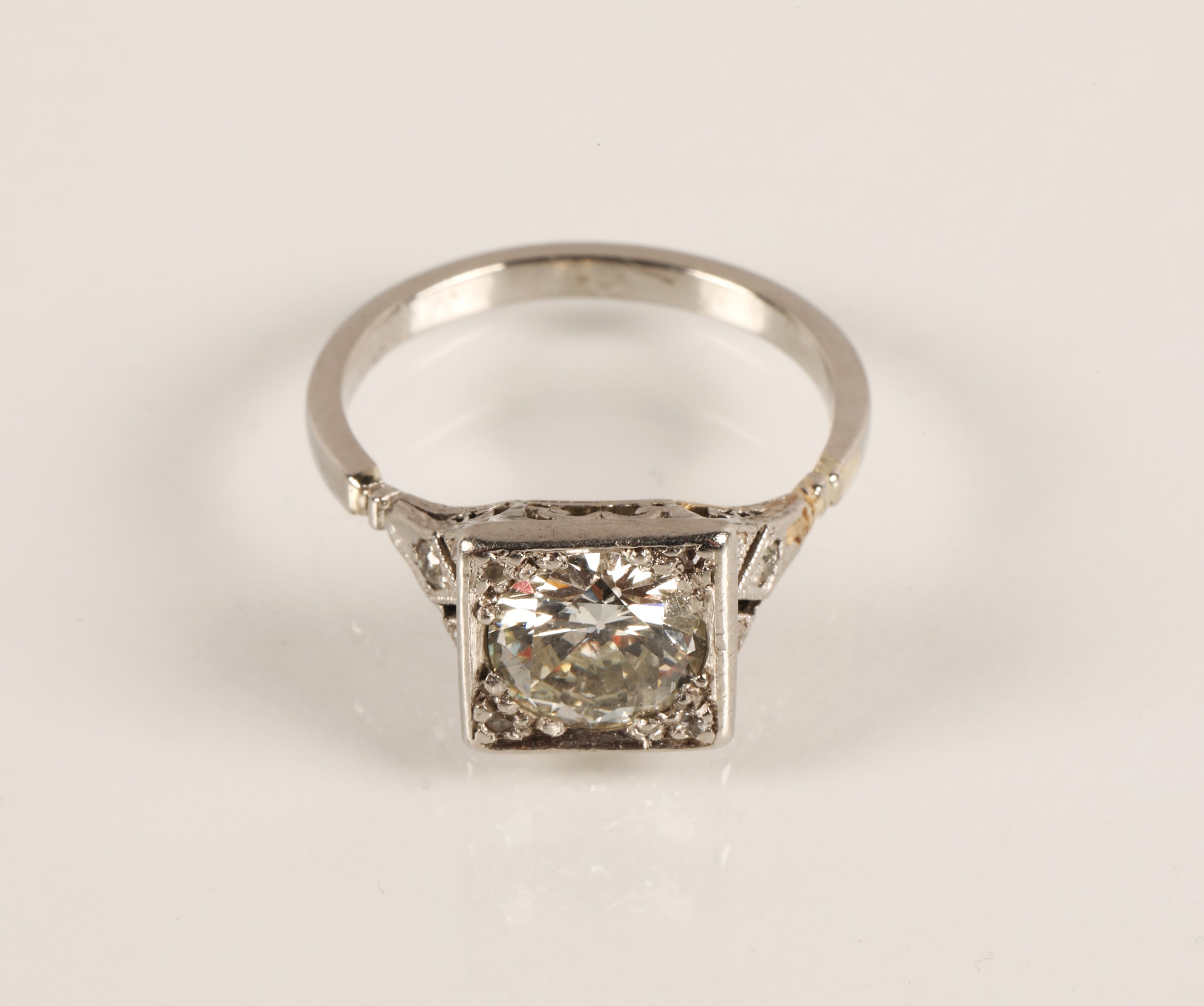 Ladies Art Deco style diamond ring, central brilliant cut diamond approximately two carats, with a small diamond chip set to each corner, set on unmarked white metal shank with diamond chip shoulders, ring size N/O