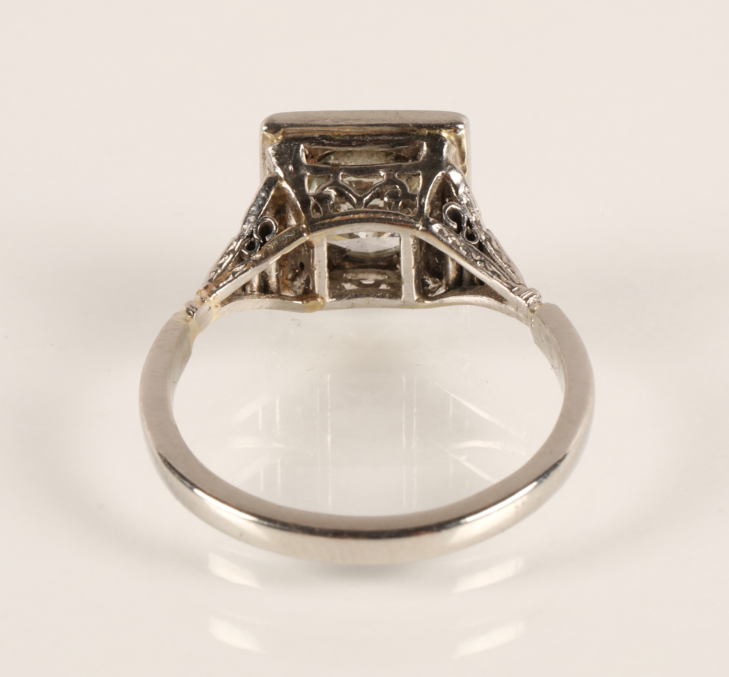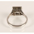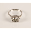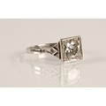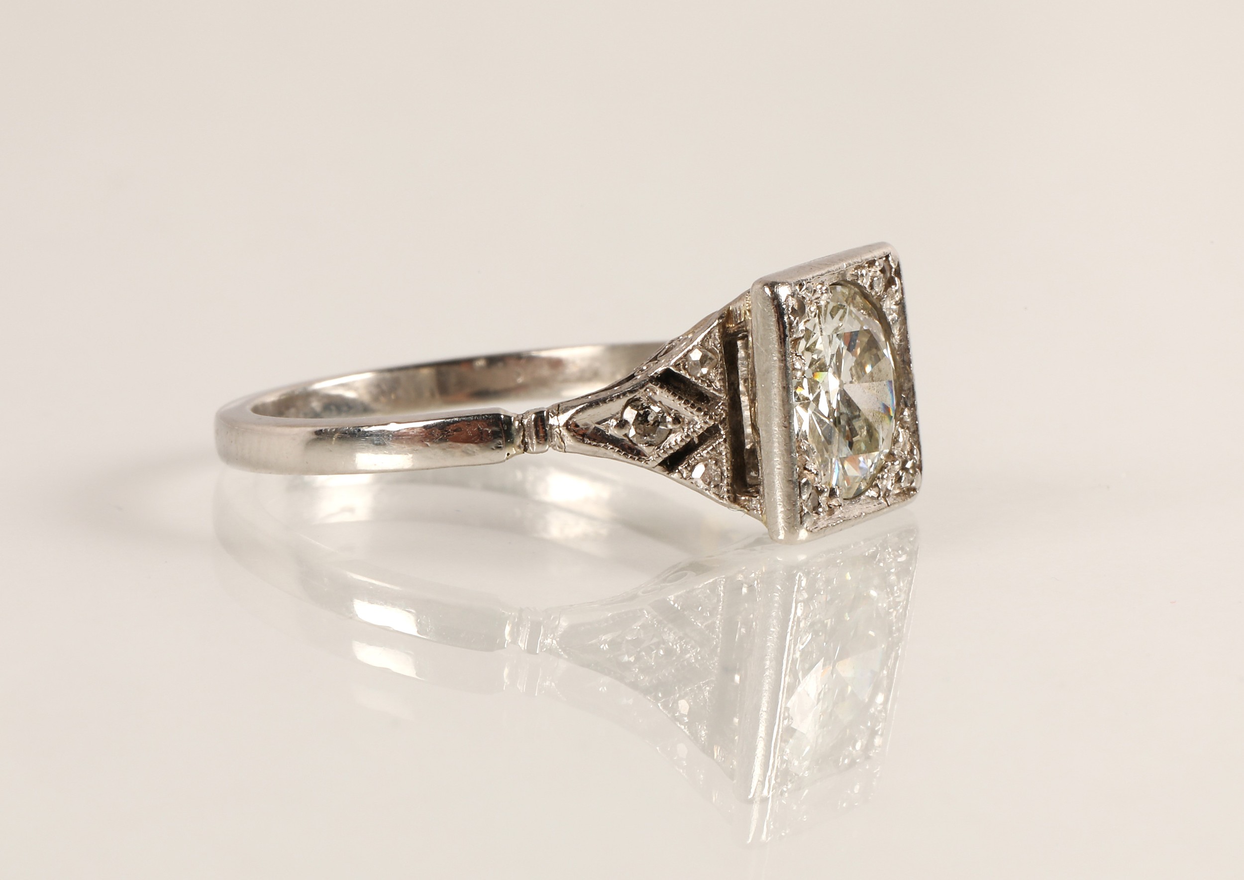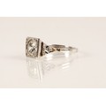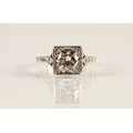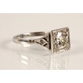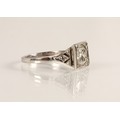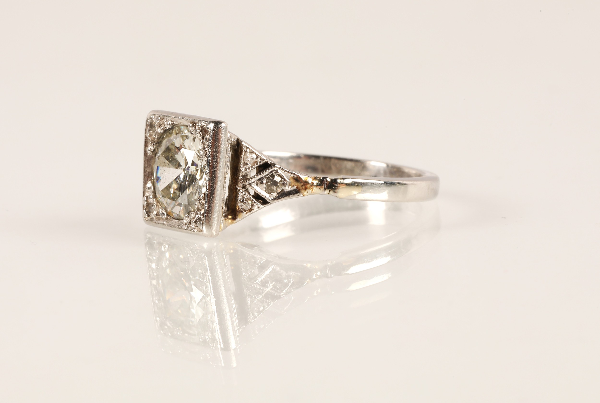 Ladies Art Deco style diamond ring, central brilliant cut diamond approximately two carats, with a small diamond chip set to each corner, set on unmarked white metal shank with diamond chip shoulders, ring size N/O