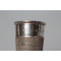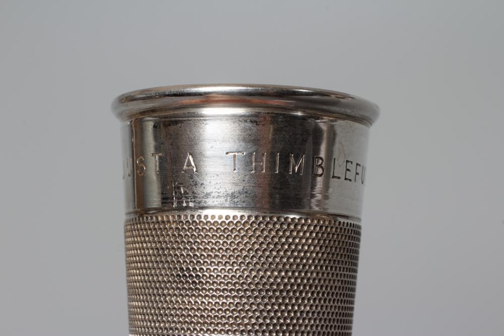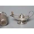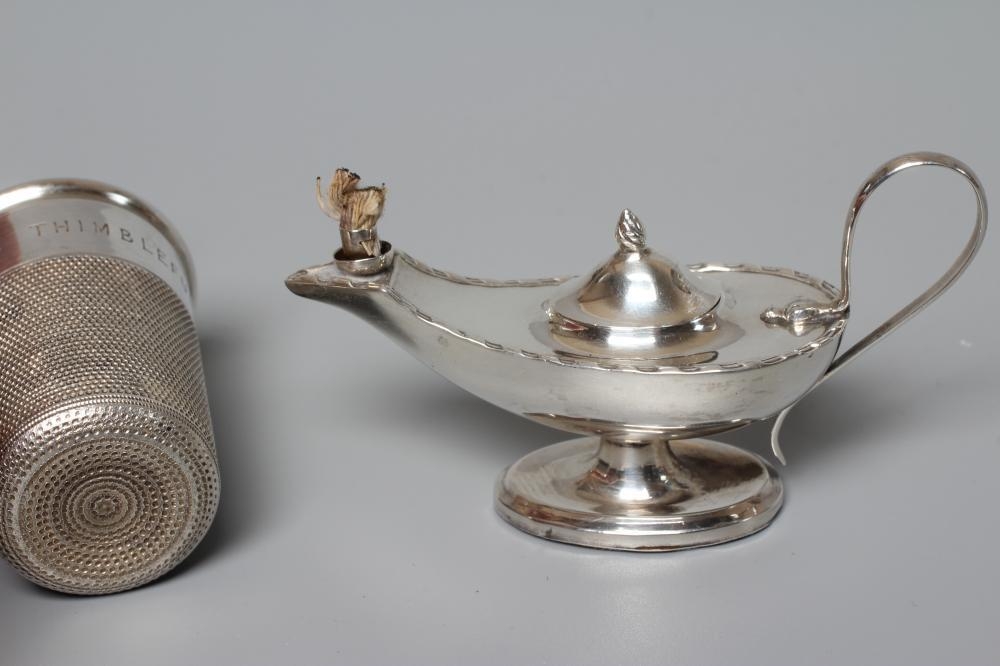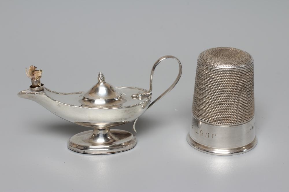 AN ELIZABETH II NOVELTY SILVER THIMBLE TOT by Charles Horner, Chester 1950, engraved 'Just a Thimbleful', 2" high, 1oz 6dwts, together with an early George V silver small table lighter by Levi & Salaman, Birmingham 1913, as Aladdin's lamp, 3 1/2" long, loaded (2)
