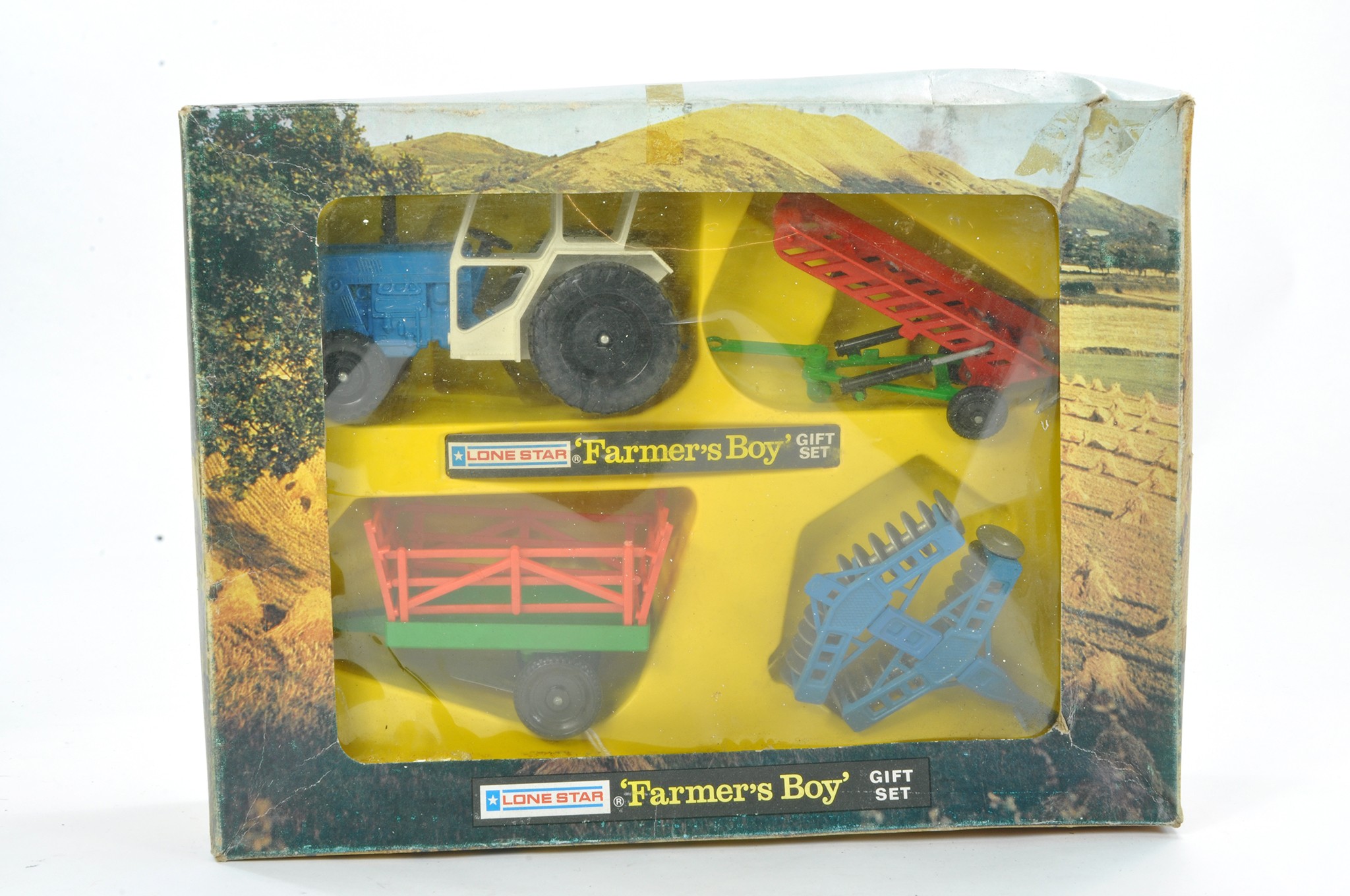 Lone Star Farmer's Boy Series comprising Gift set inc Tractor and trio of implements. Contents excellent, box has storage wear and would benefit from careful clean.