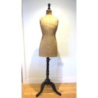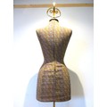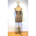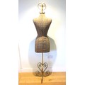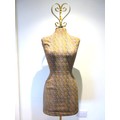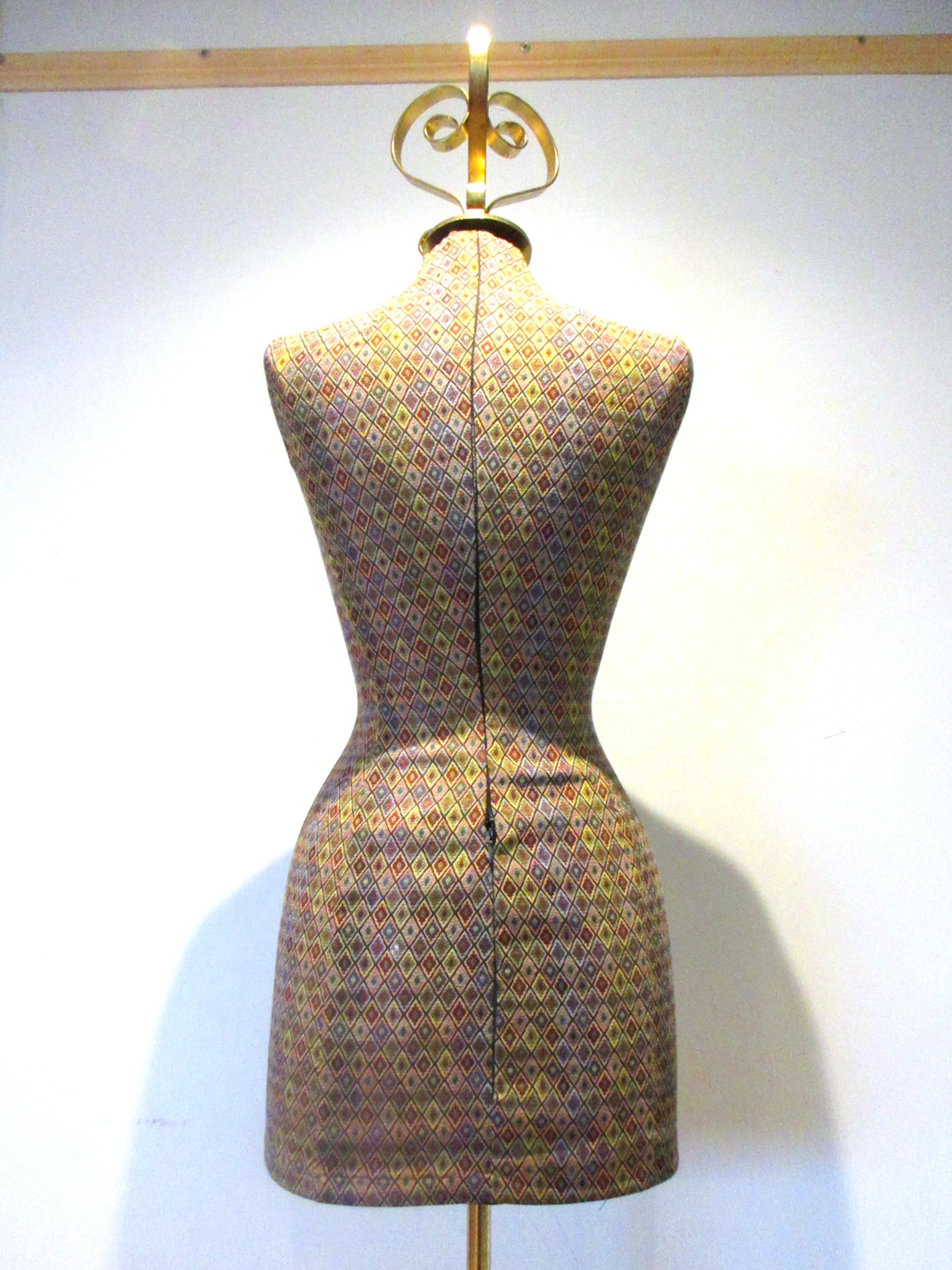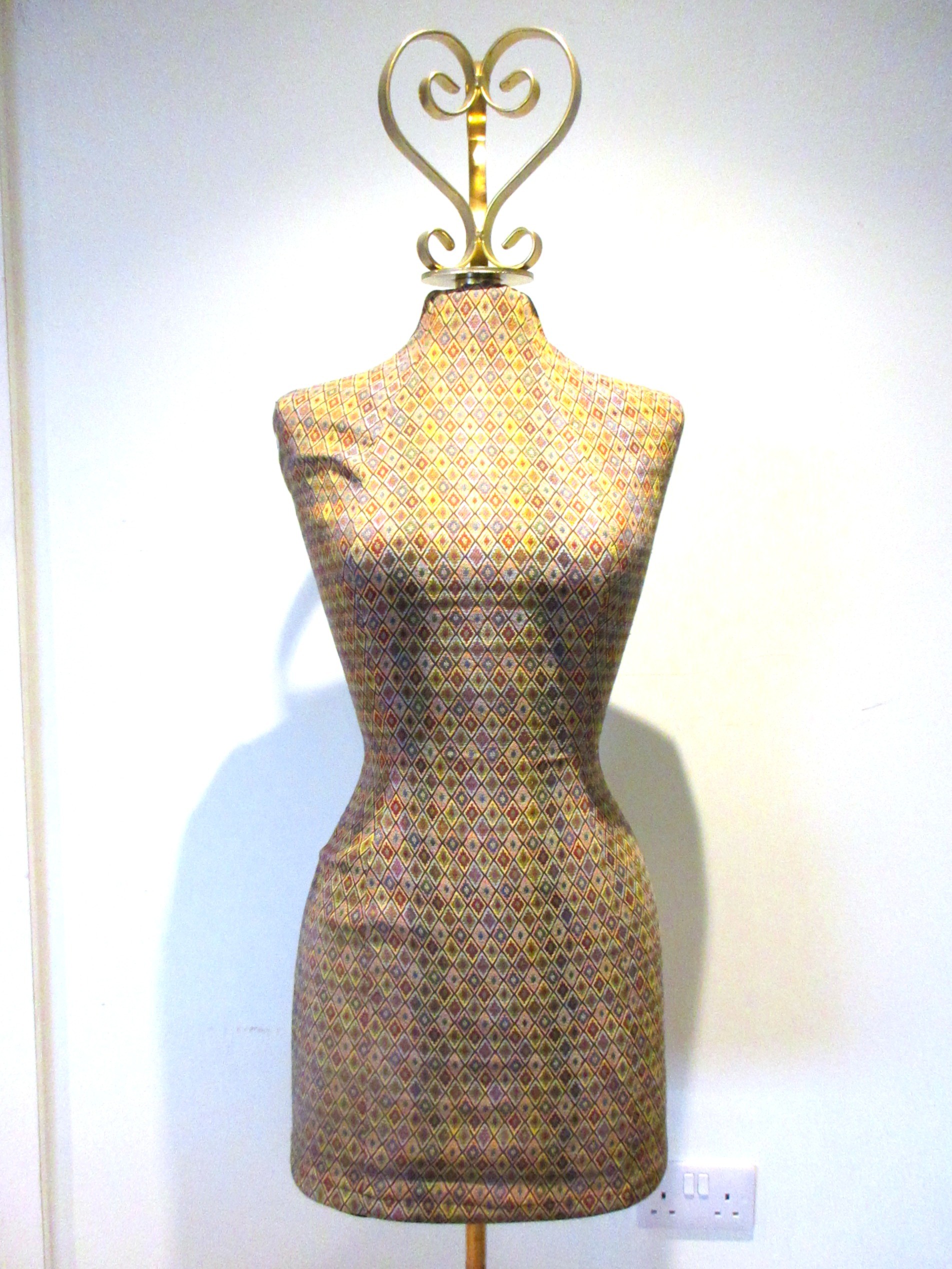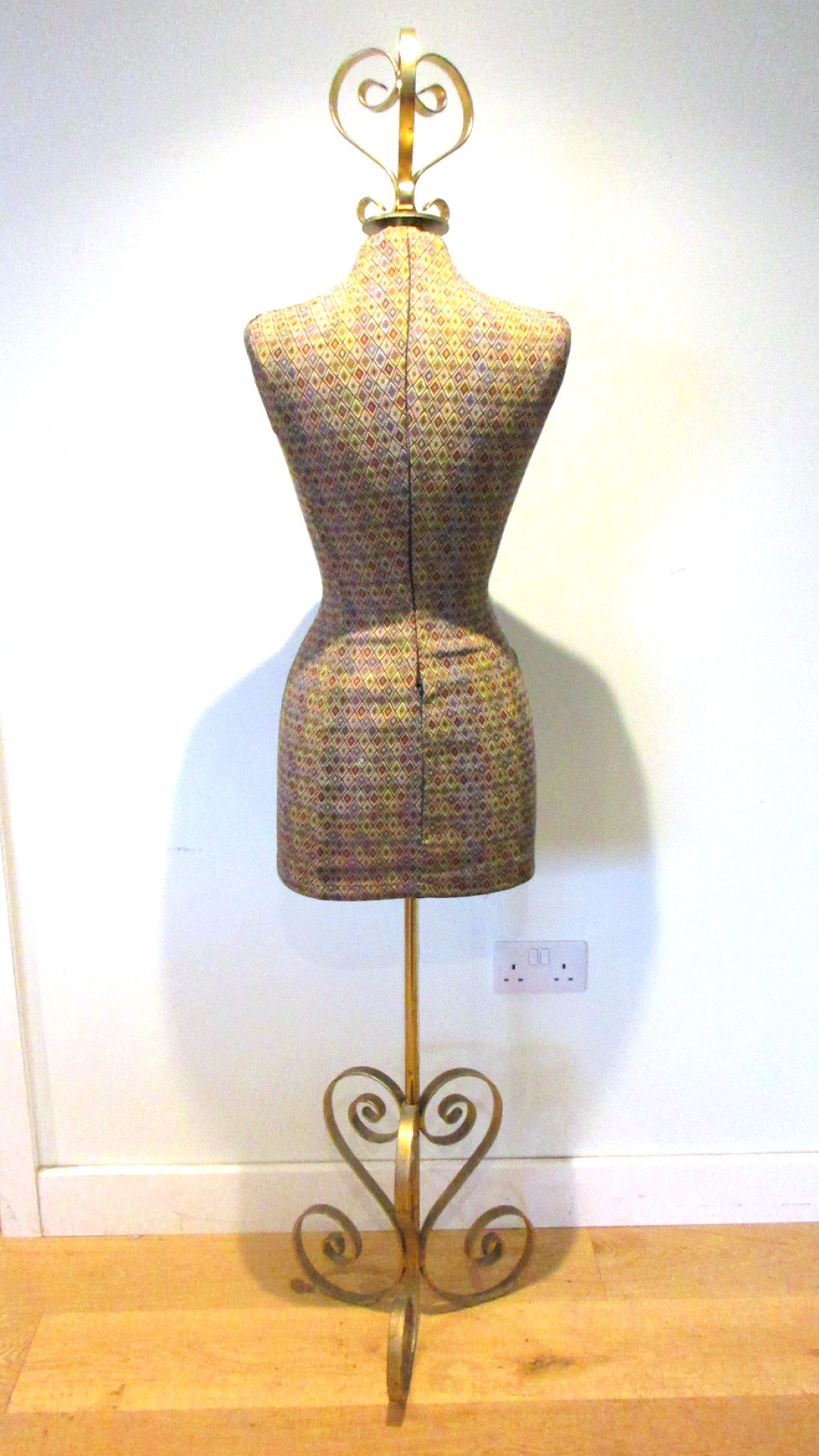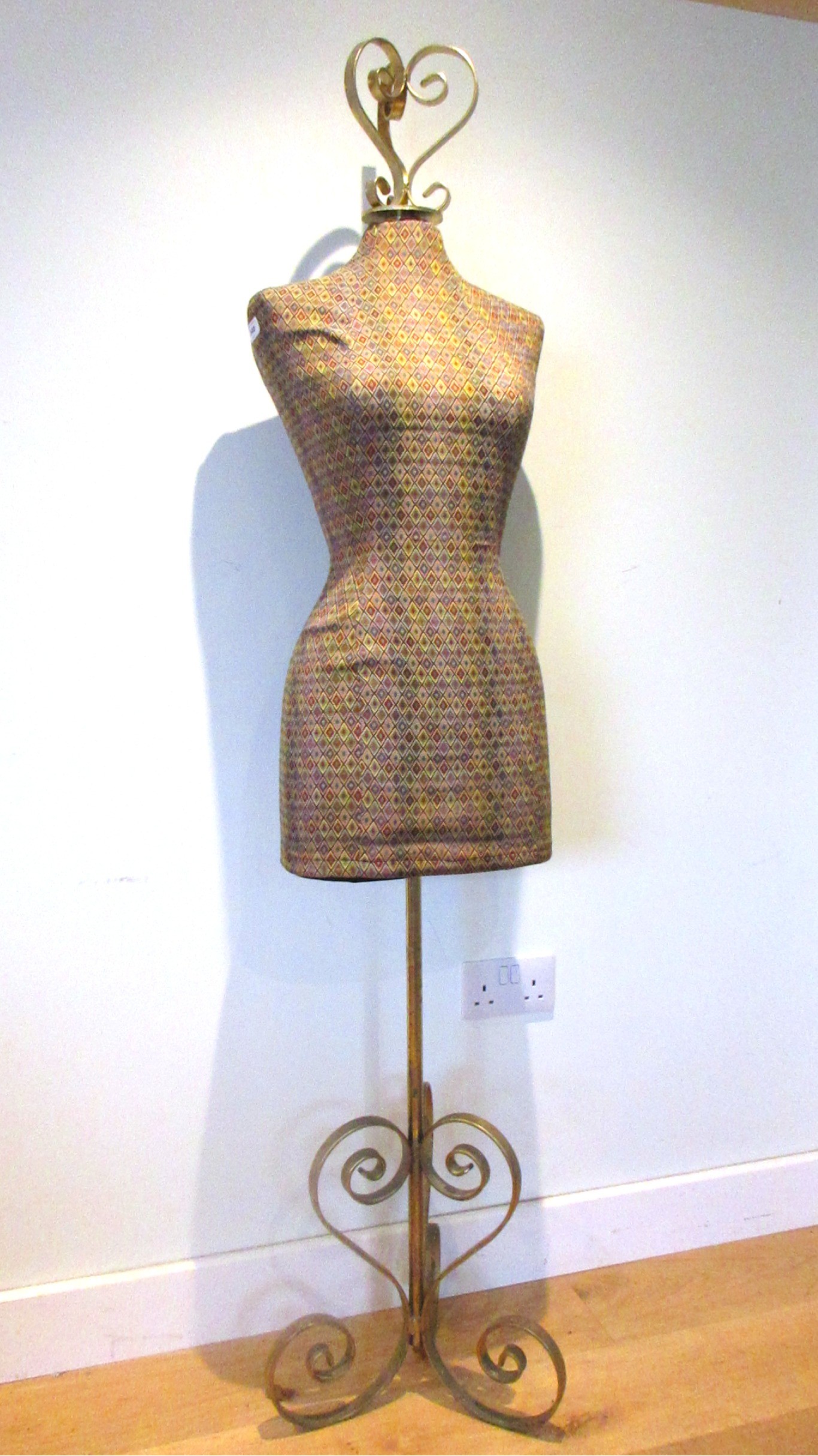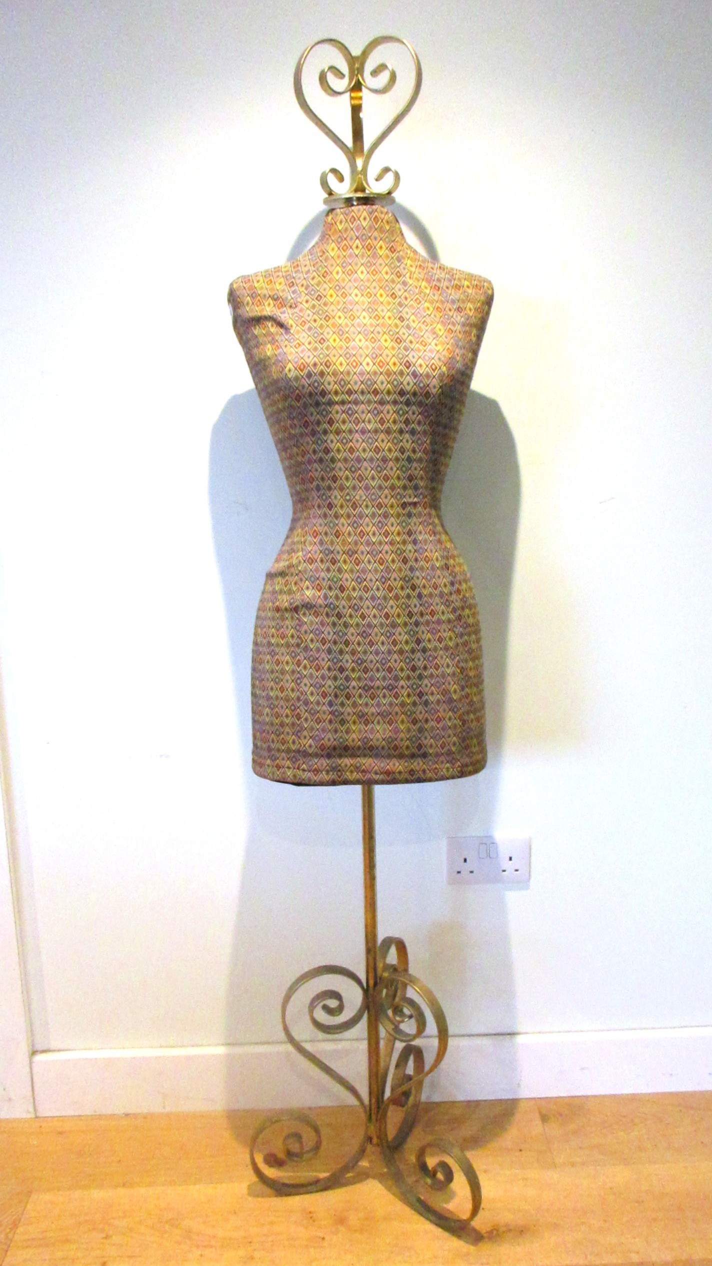 Contemporary dressmaker's dummy or display mannequin in dress form featuring colourful diamond-patterned fabric, female hourglass-shape & brass-coloured scrolls forming the head mount and lower tripod stand; approx. H 170cm x L 77cm (torso) x 36" (bust) x 25" (waist) x 36" (hips), Qty. 1