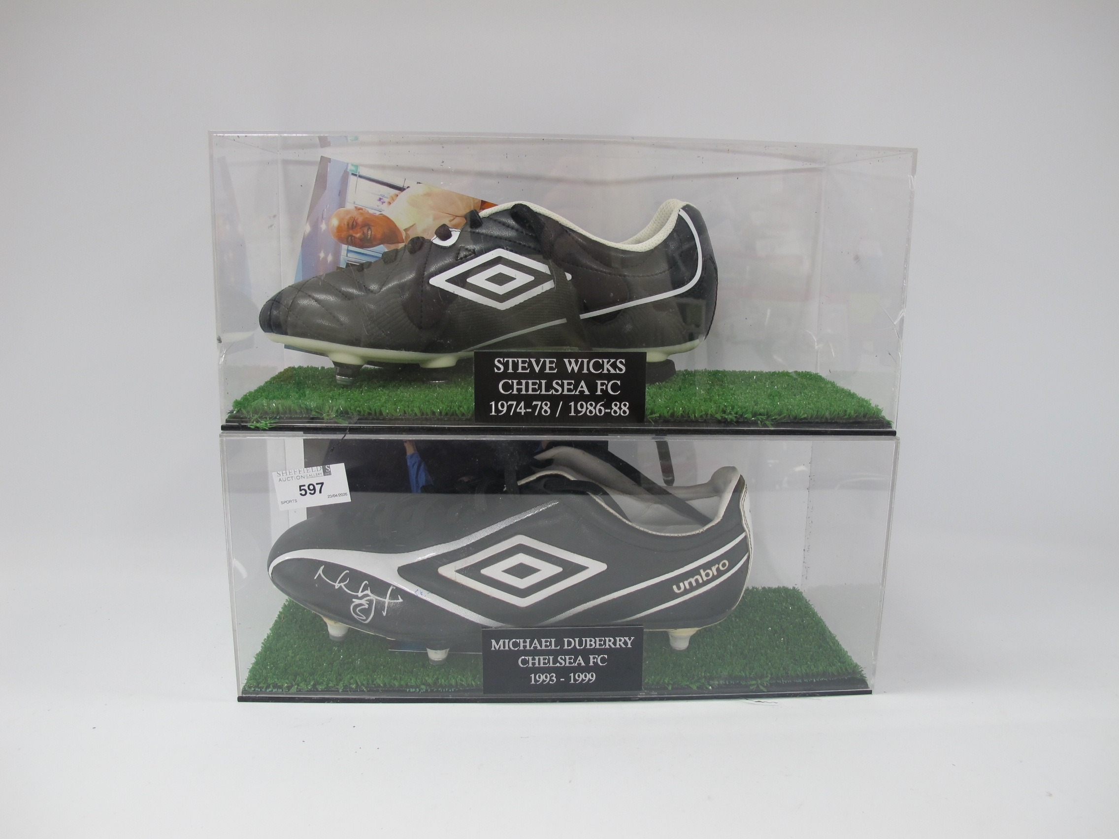Chelsea Autographed Umbro Boots - Steve Wicks & Michael Duberry, each silver pen signed (unverified) with image, under plastic display box. (2).