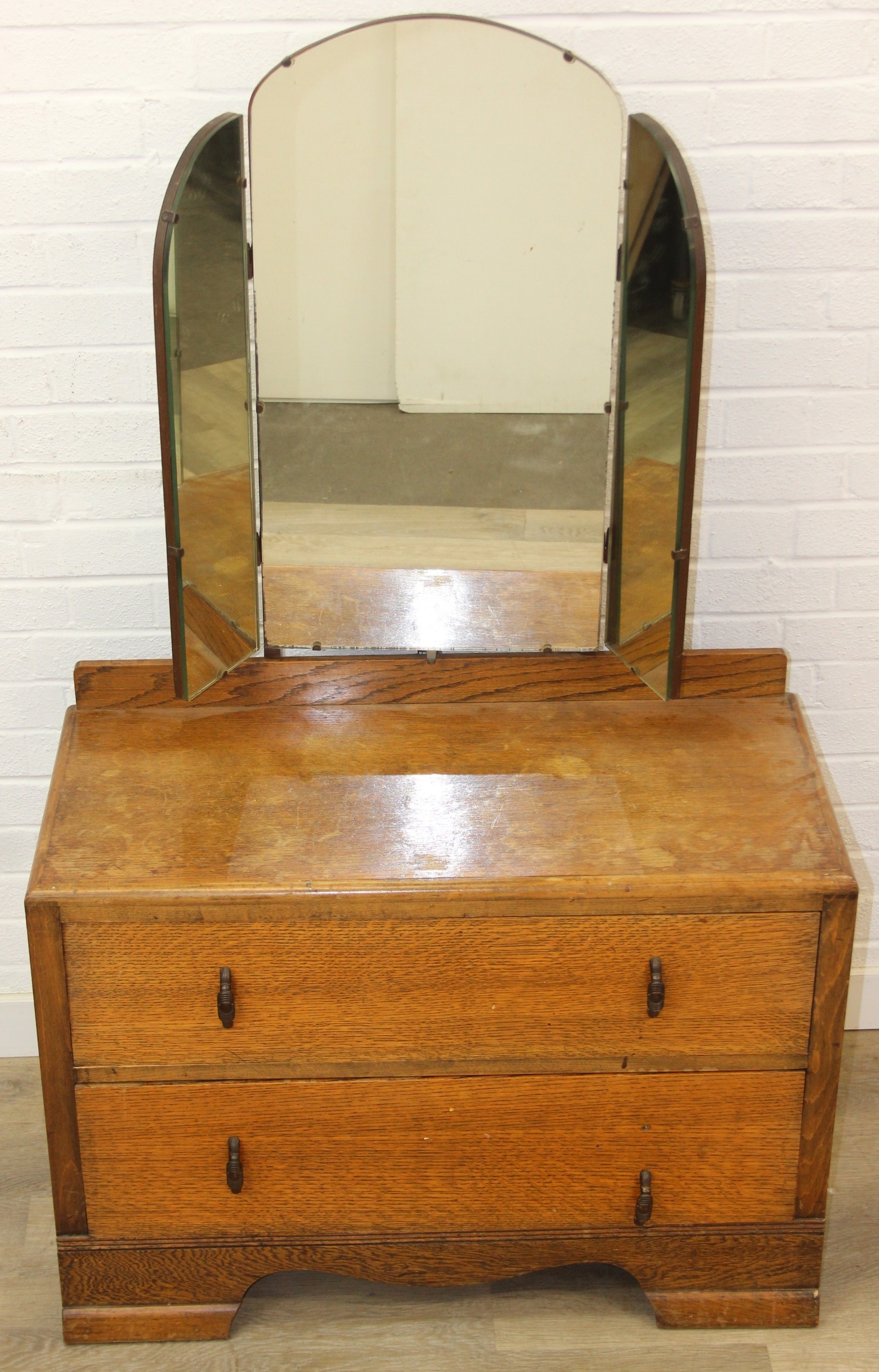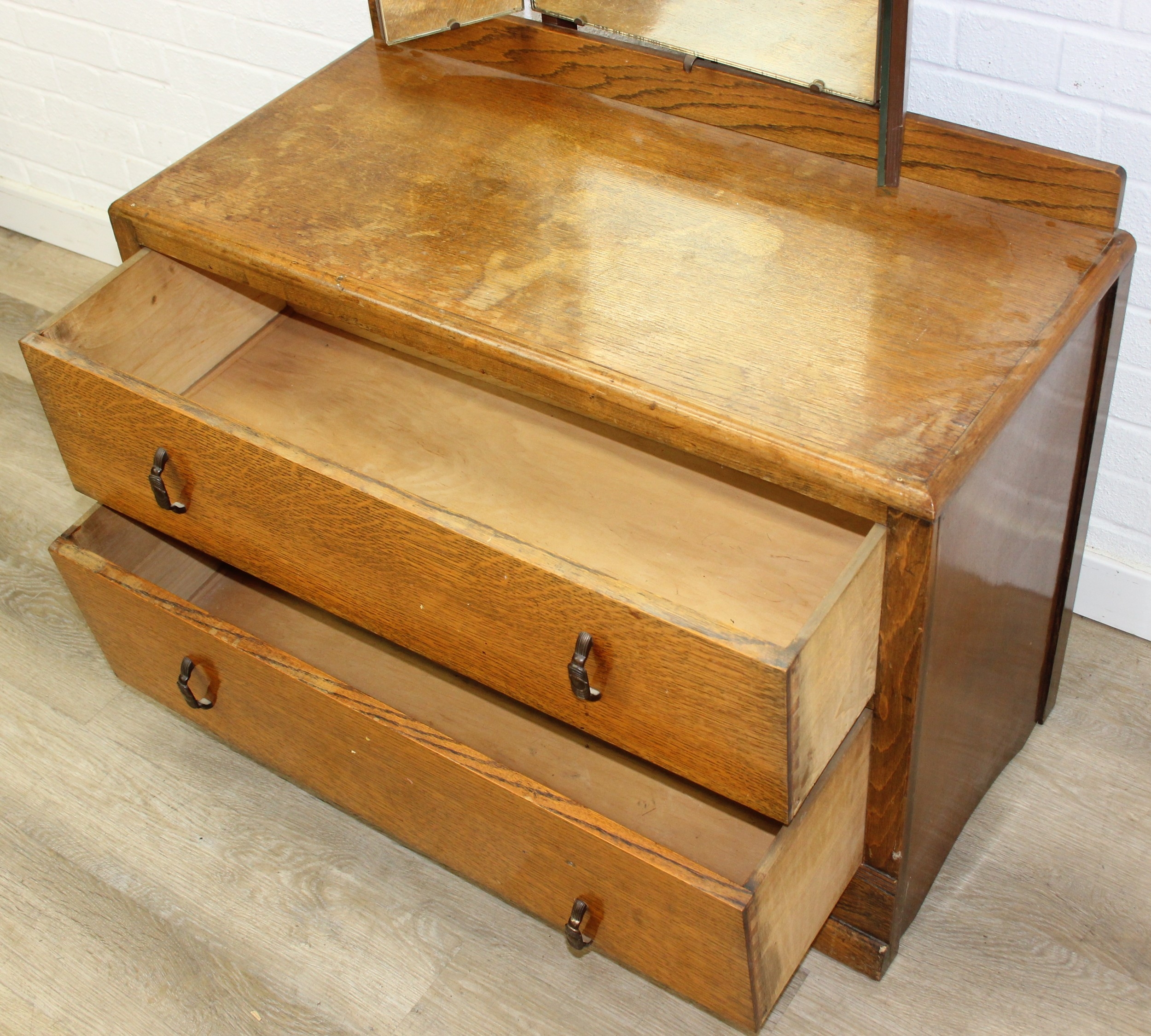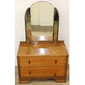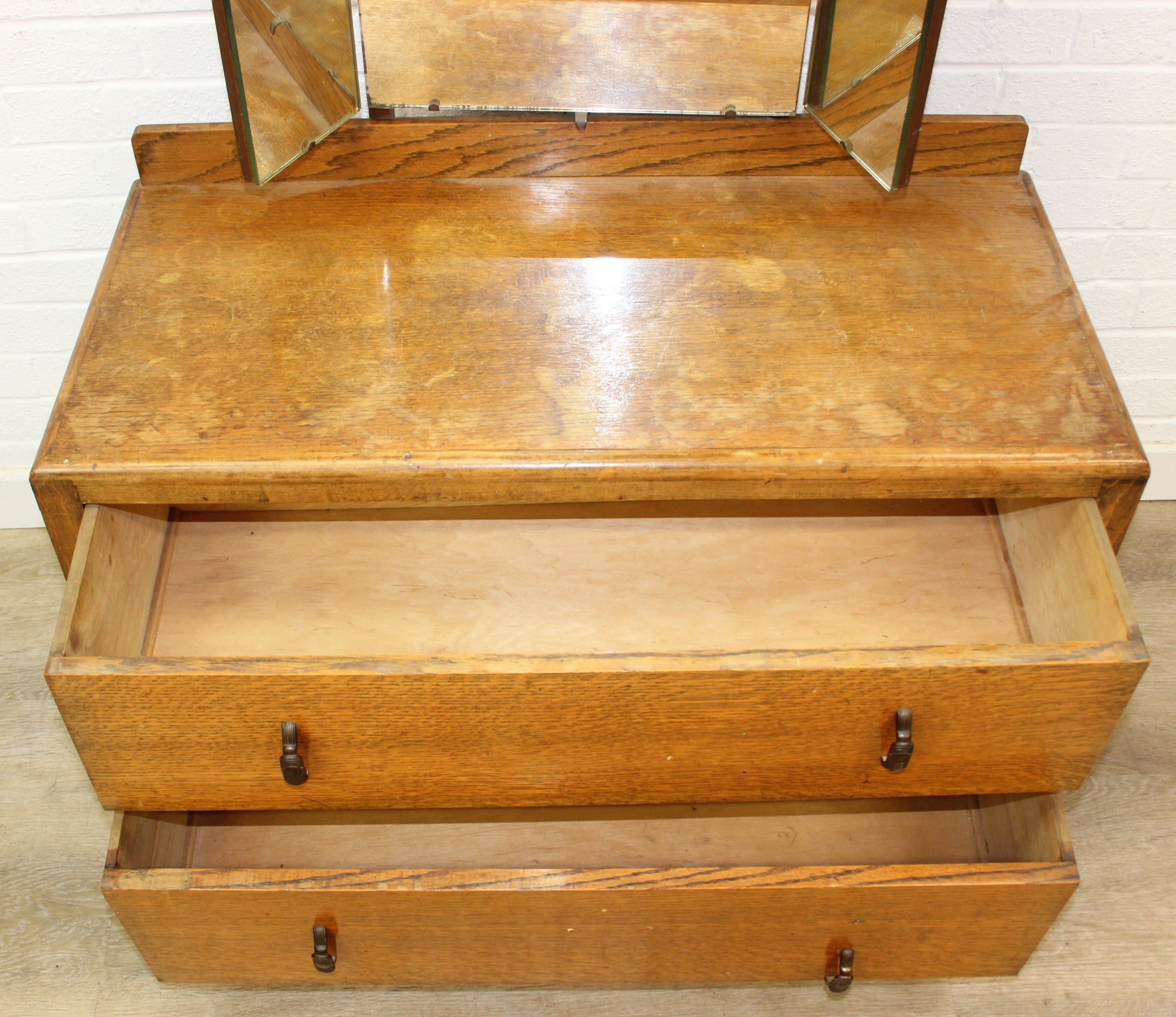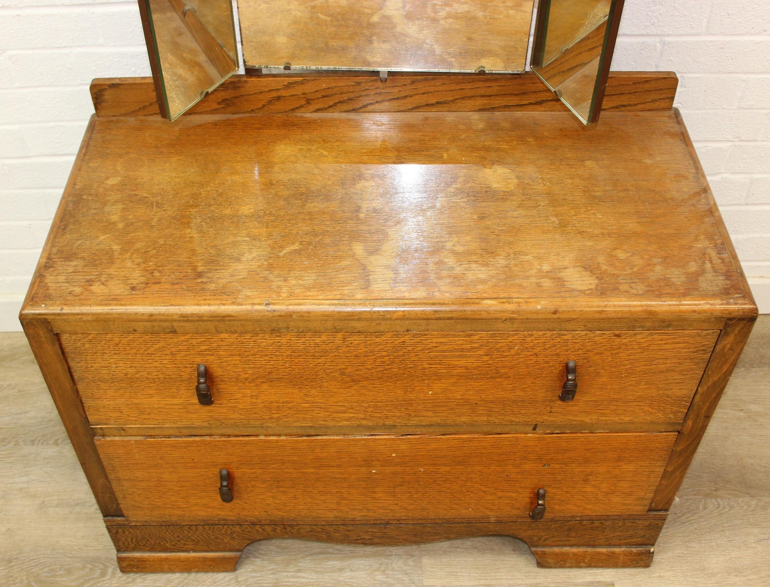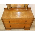 An Art Deco period oak dressing table with triple mirror and two drawers, to match the previous chest of drawers, 91cm x 45cm x 151cm