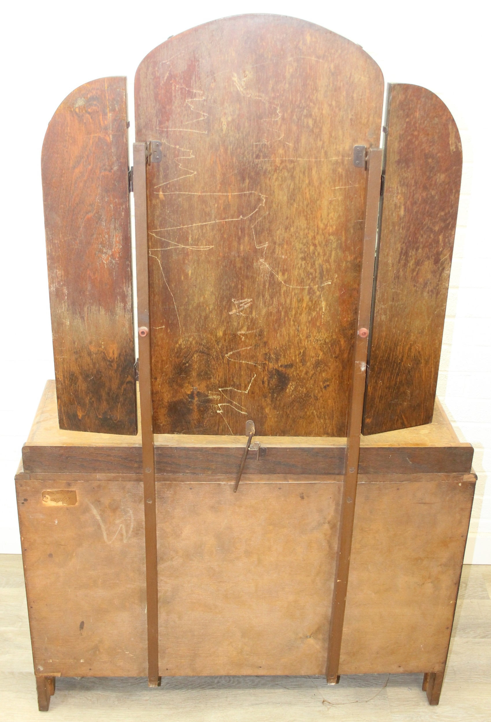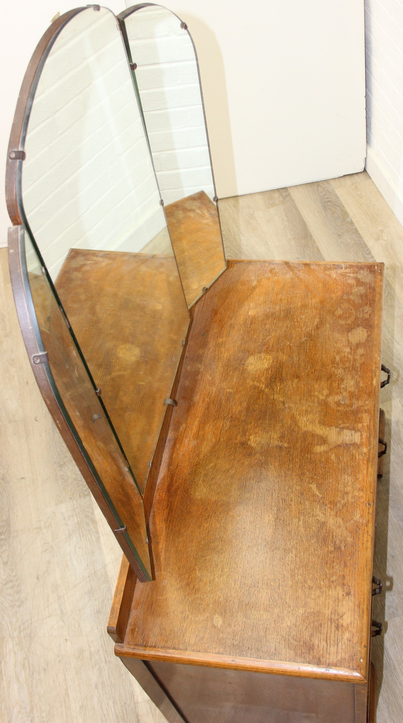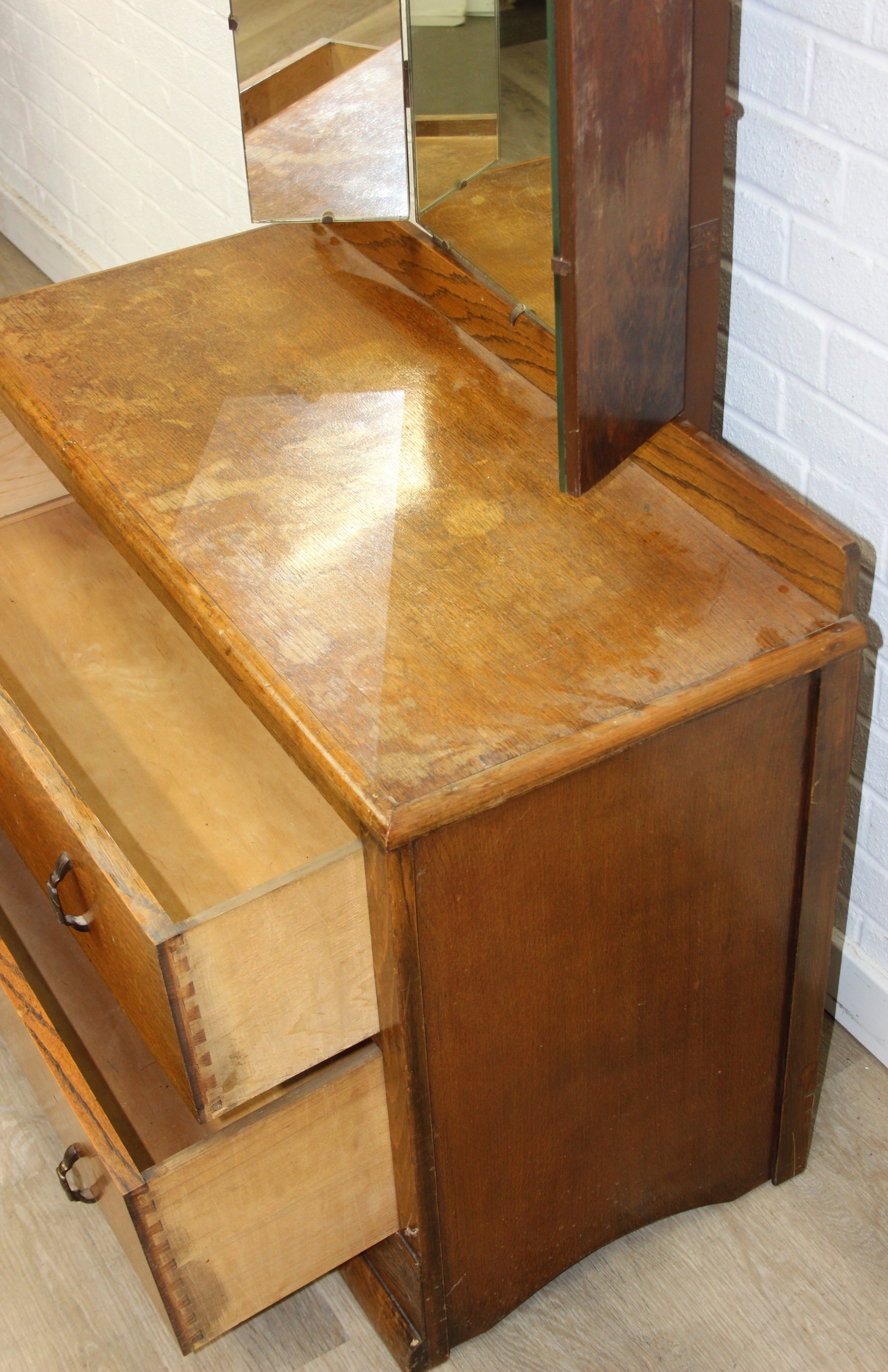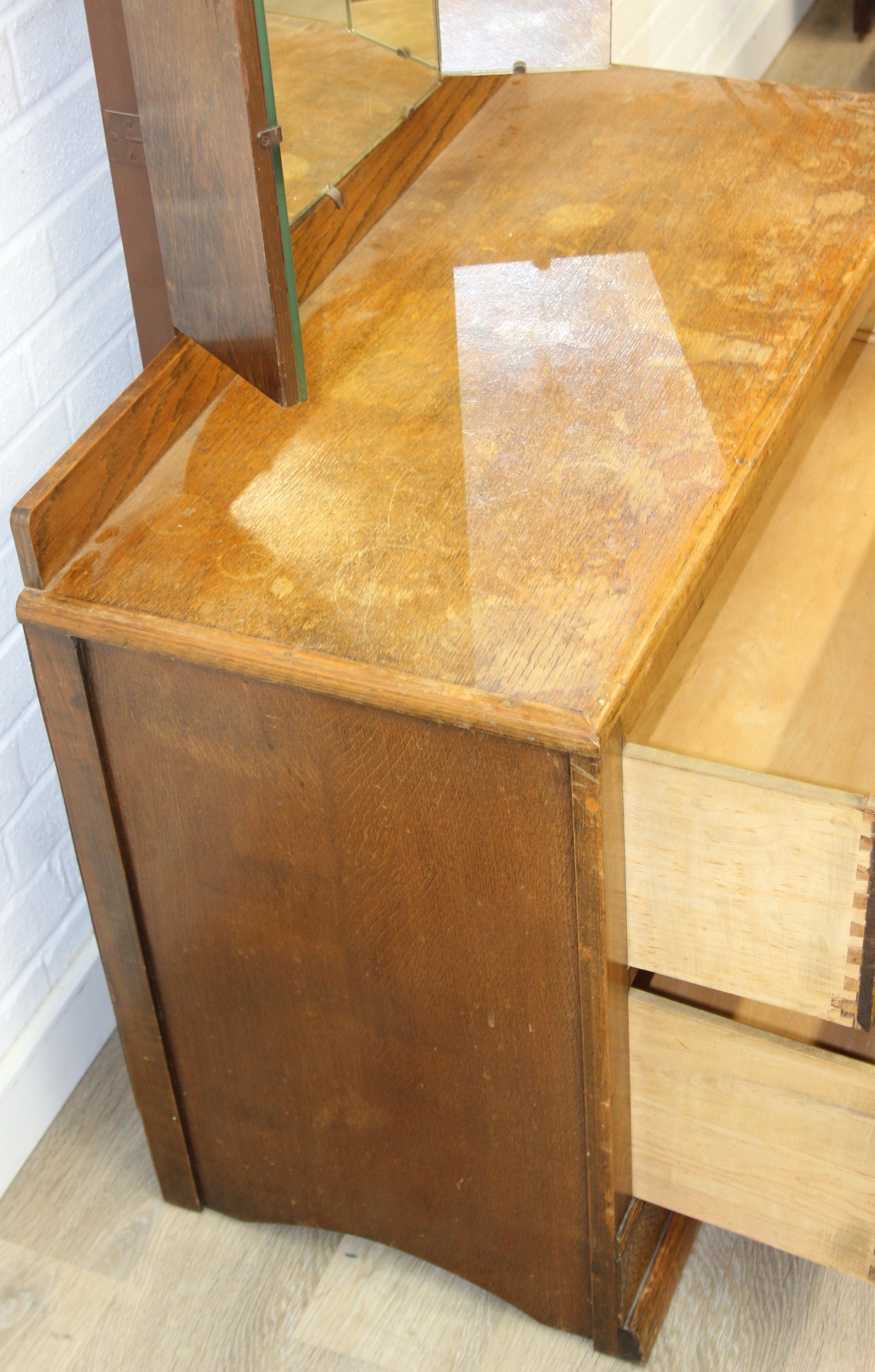 An Art Deco period oak dressing table with triple mirror and two drawers, to match the previous chest of drawers, 91cm x 45cm x 151cm