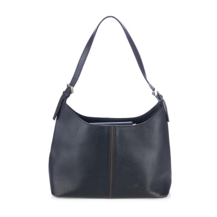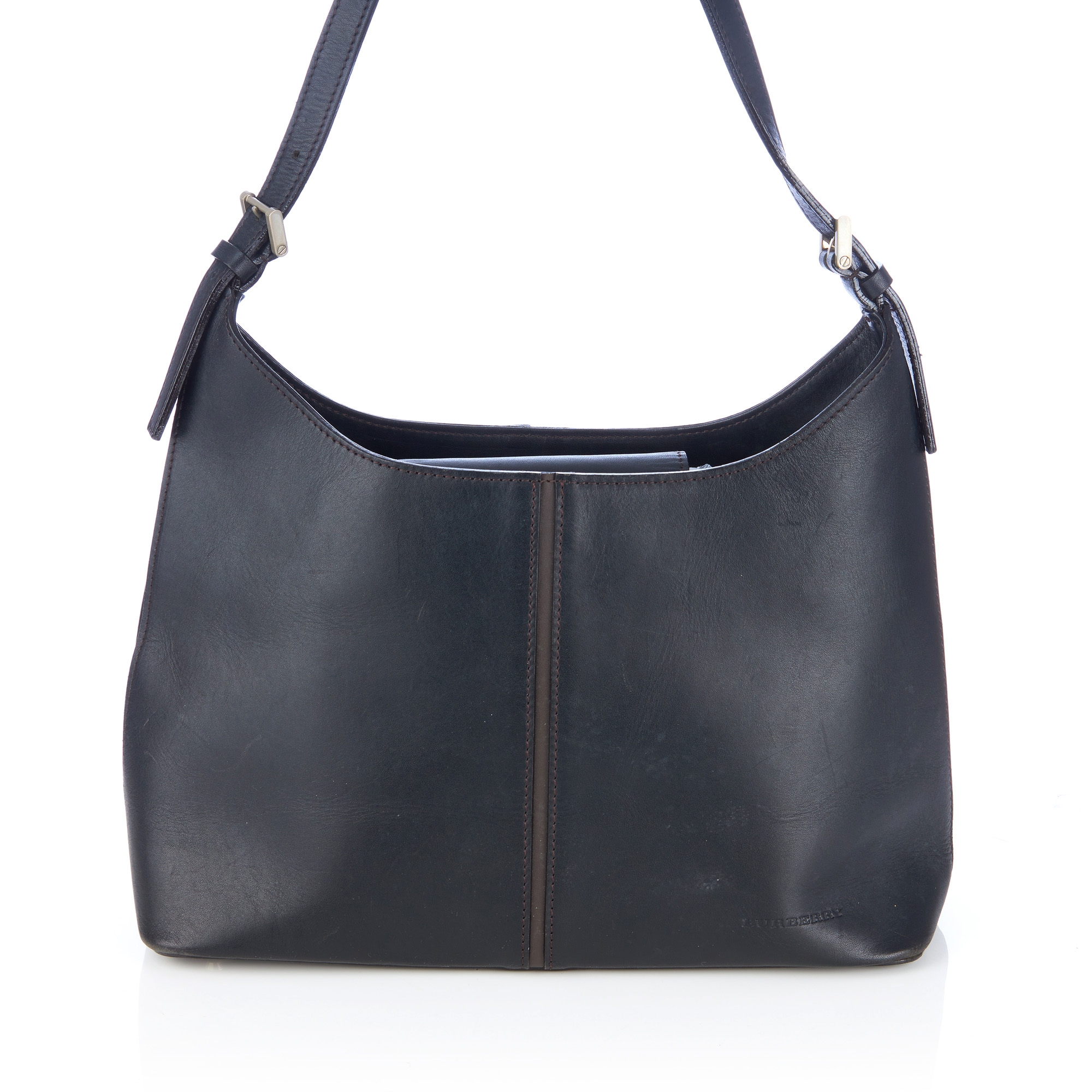 Burberry, a hobo handbag, crafted from black calf leather, featuring a single leather shoulder strap with buckle details at either end, a magnetic snap button fastening and maker's classic Nova check interior lining, measuring 12 by 21 by 33cm