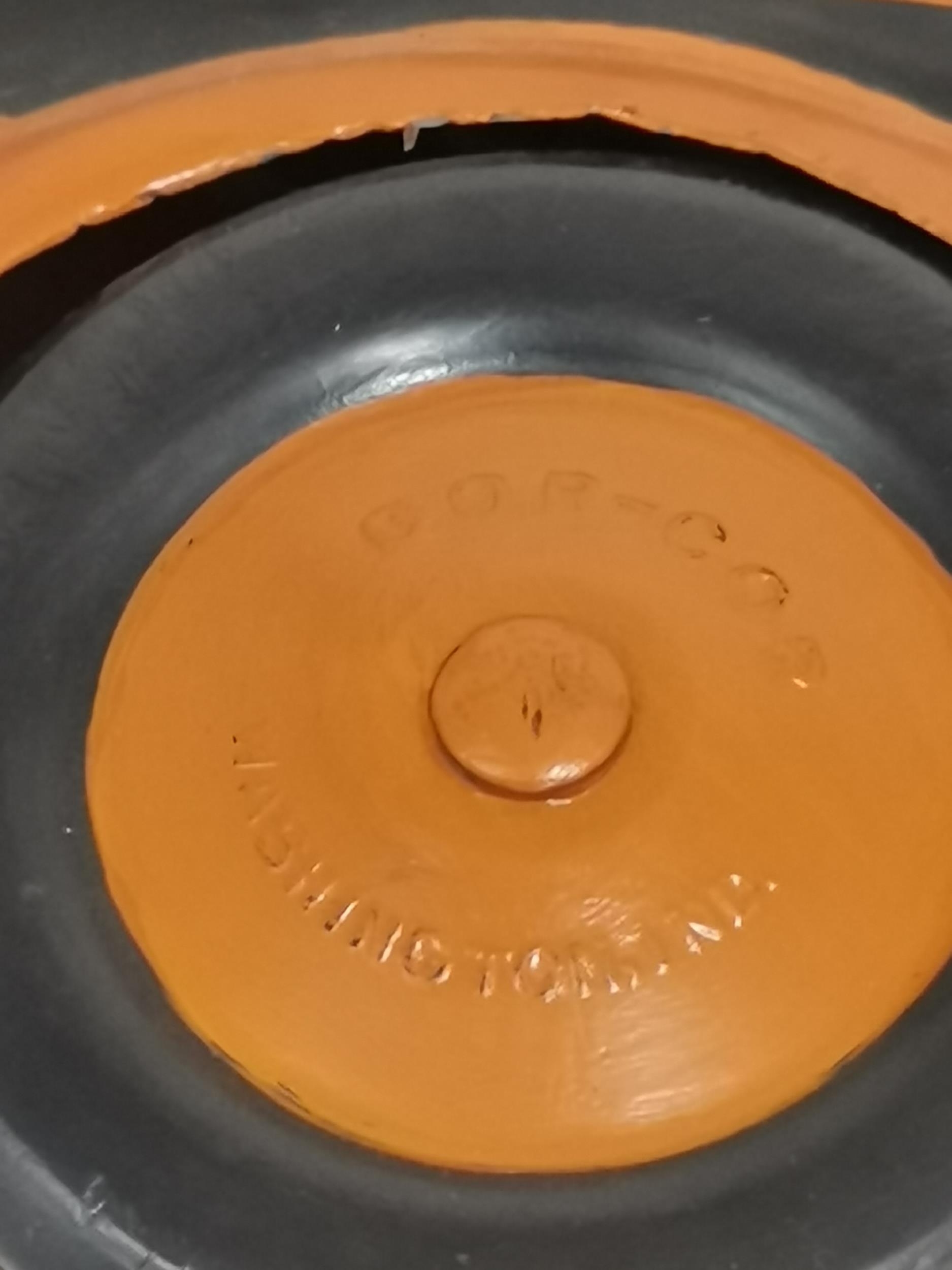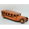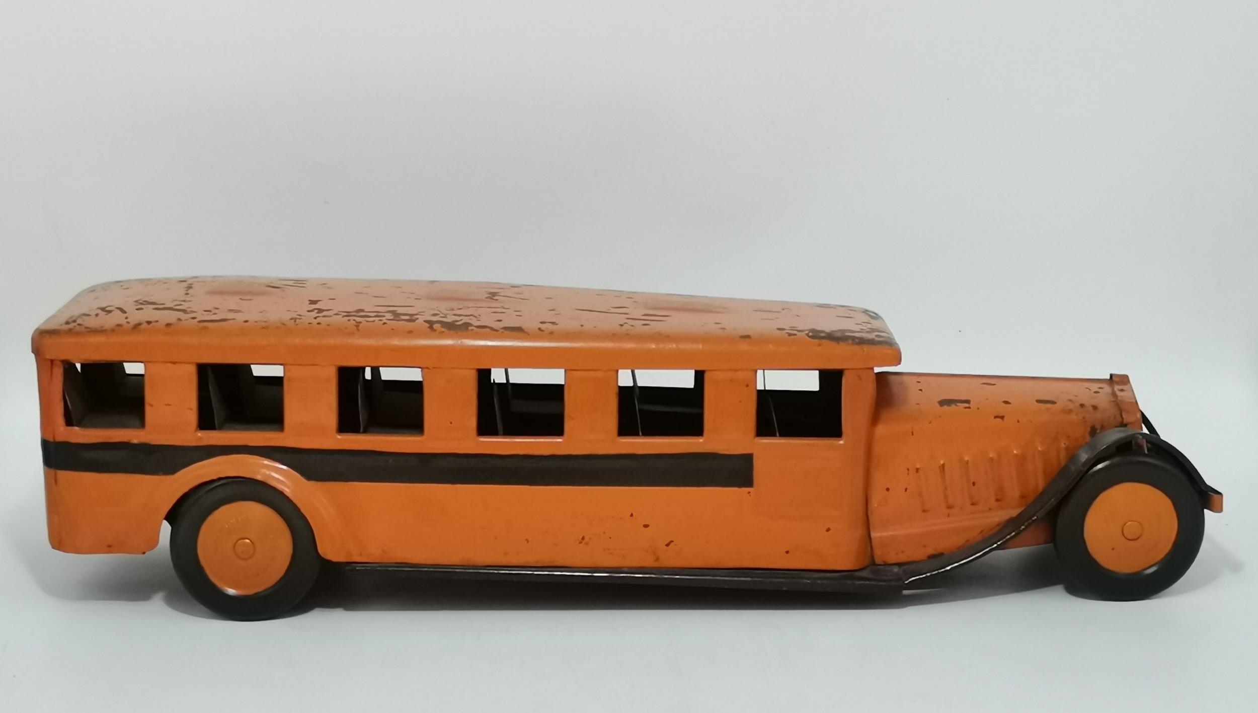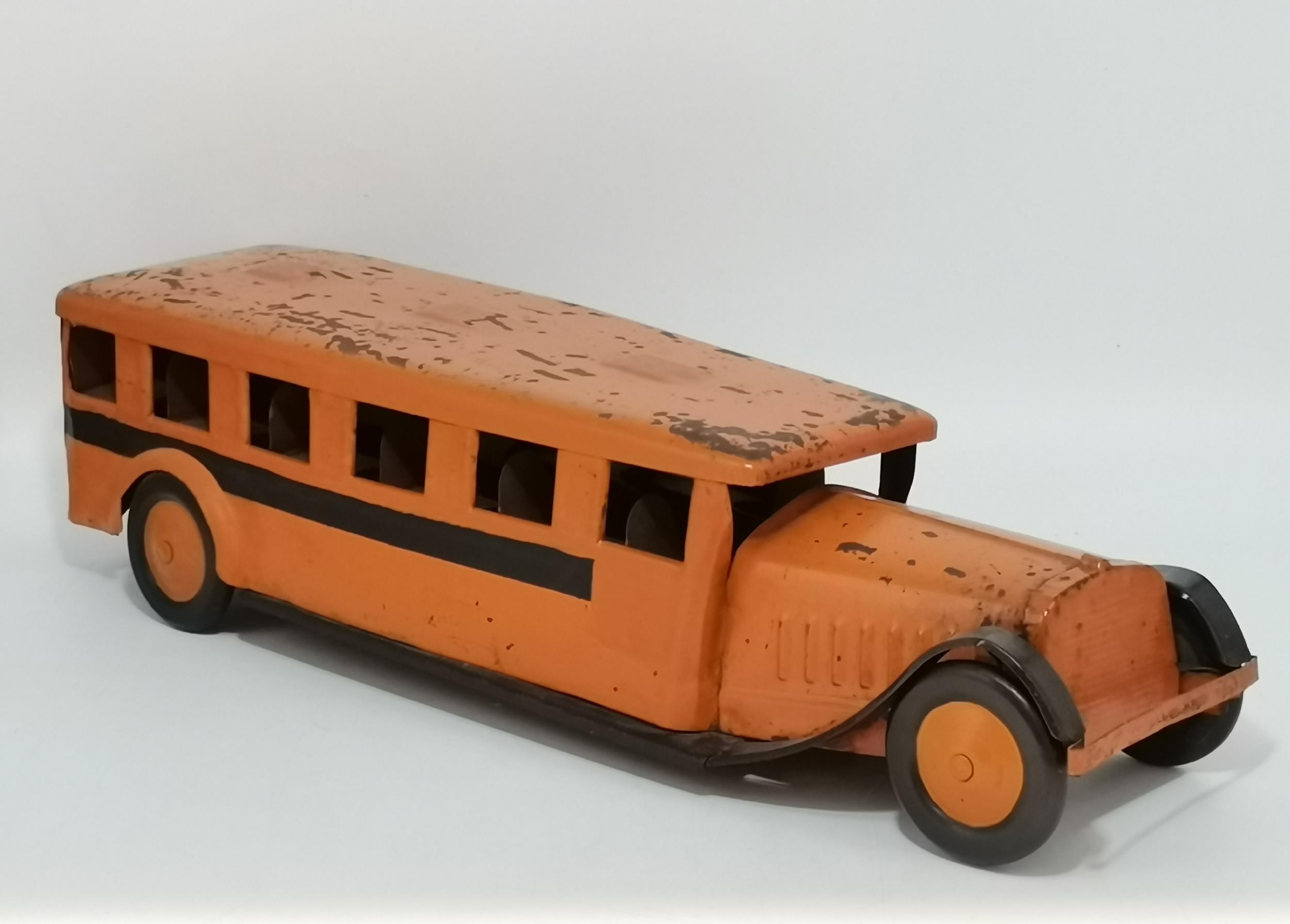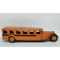A vintage American pressed steel bus model, c.1930s, by COR-COR Toys - Corcoran Metal Products, Washington, Indiana, repainted. 60cm long, 16cm wide