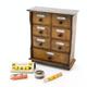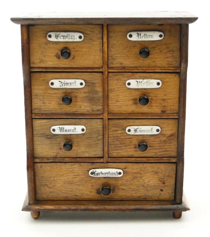 Continental oak spice cabinet with applied ceramic labels to each drawer, 27cm high