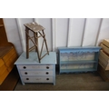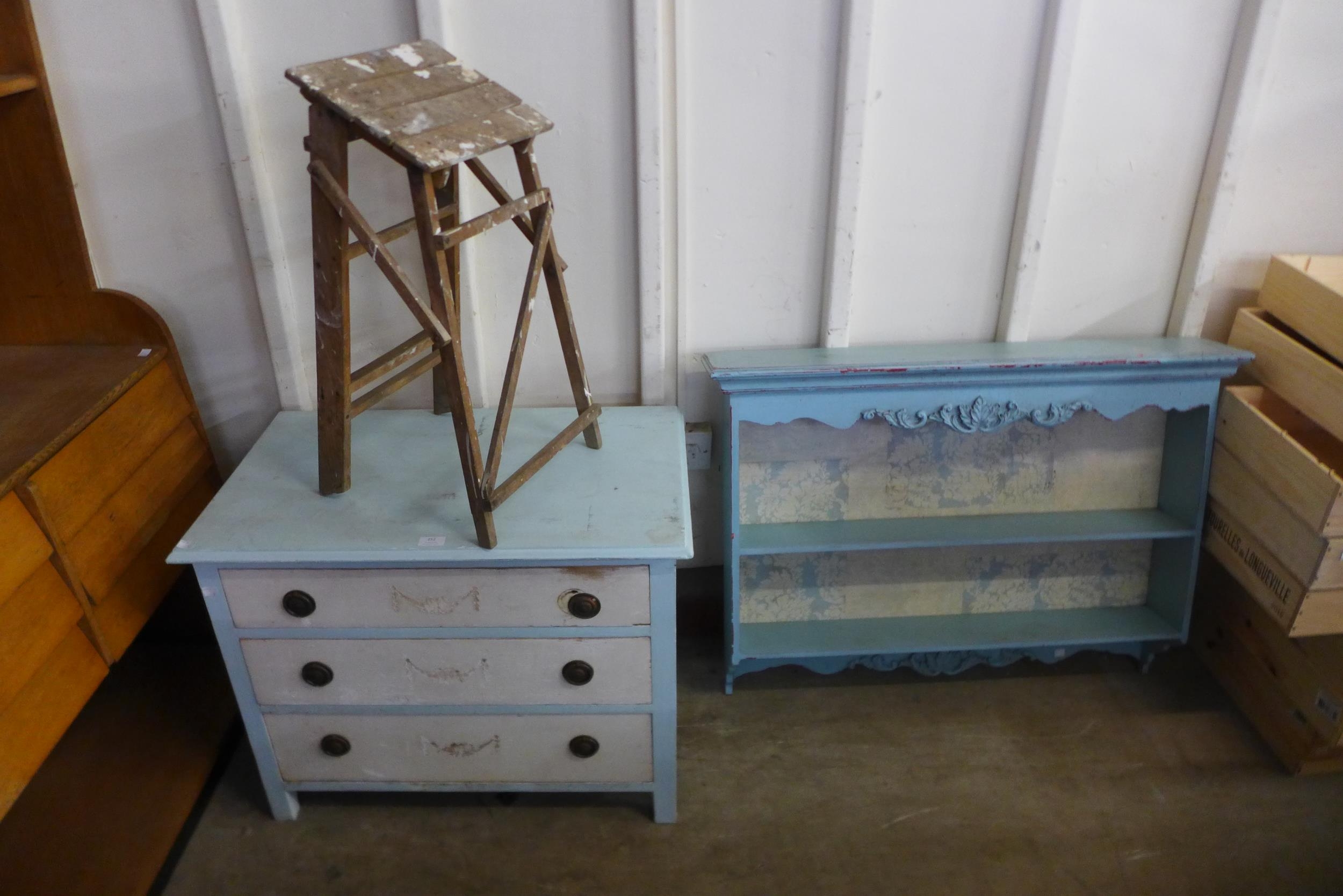 A painted chest of drawers, a painted pine wall rack and a set of small steps