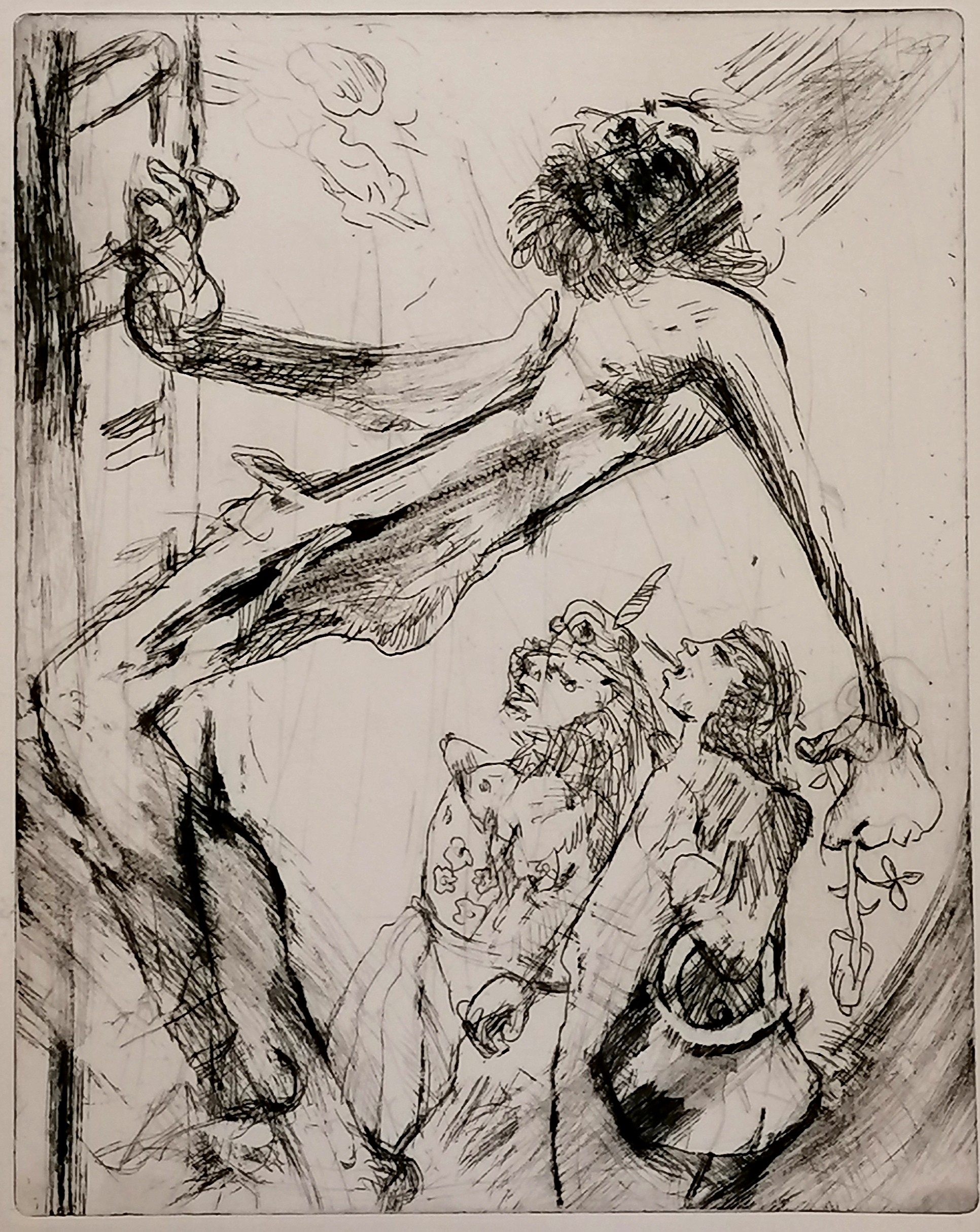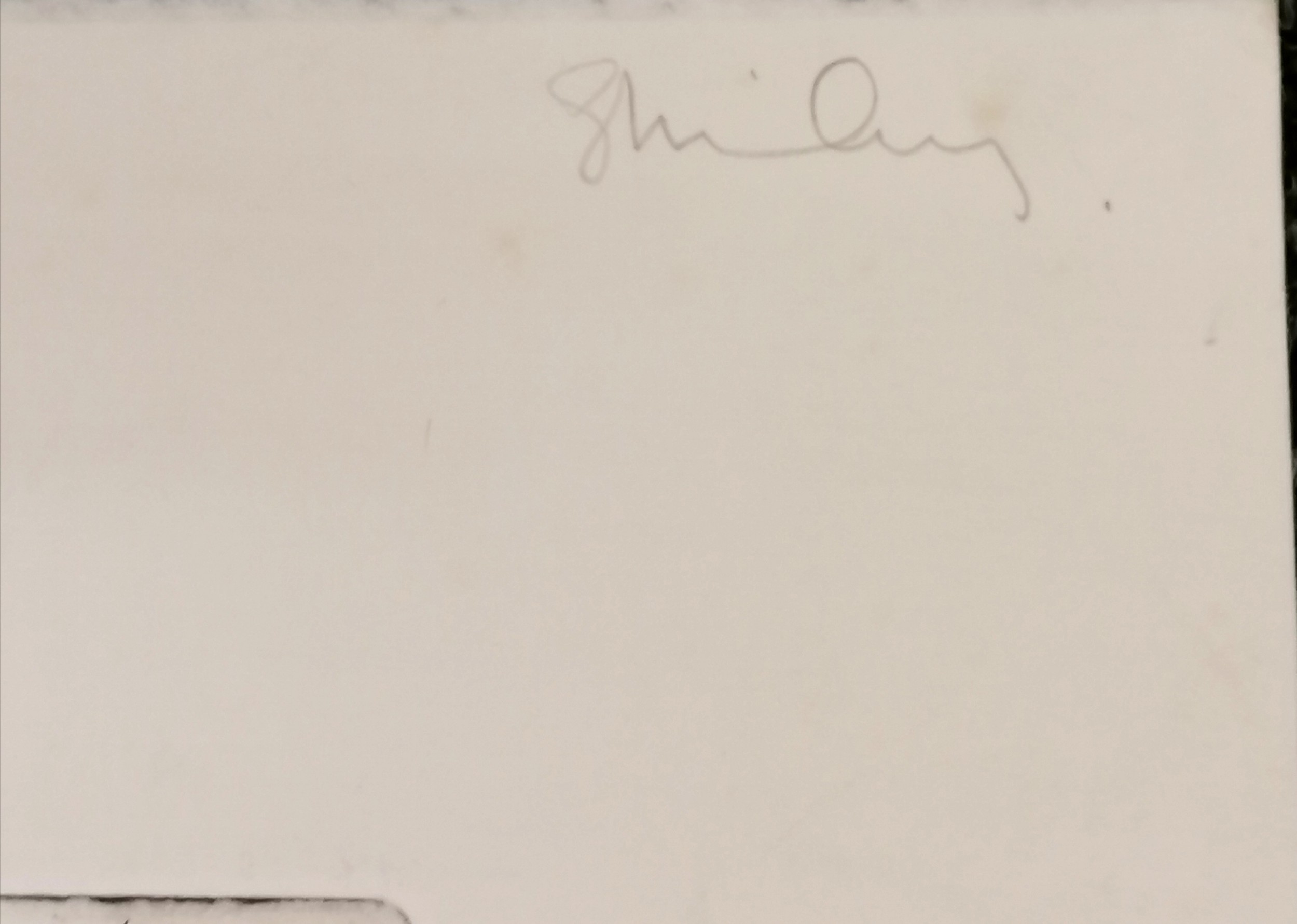 Engraving of nude man climbing ladder with 2 onlookers signed Shirley - 56.5cm x 38cm