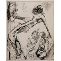 Engraving of nude man climbing ladder with 2 onlookers signe...