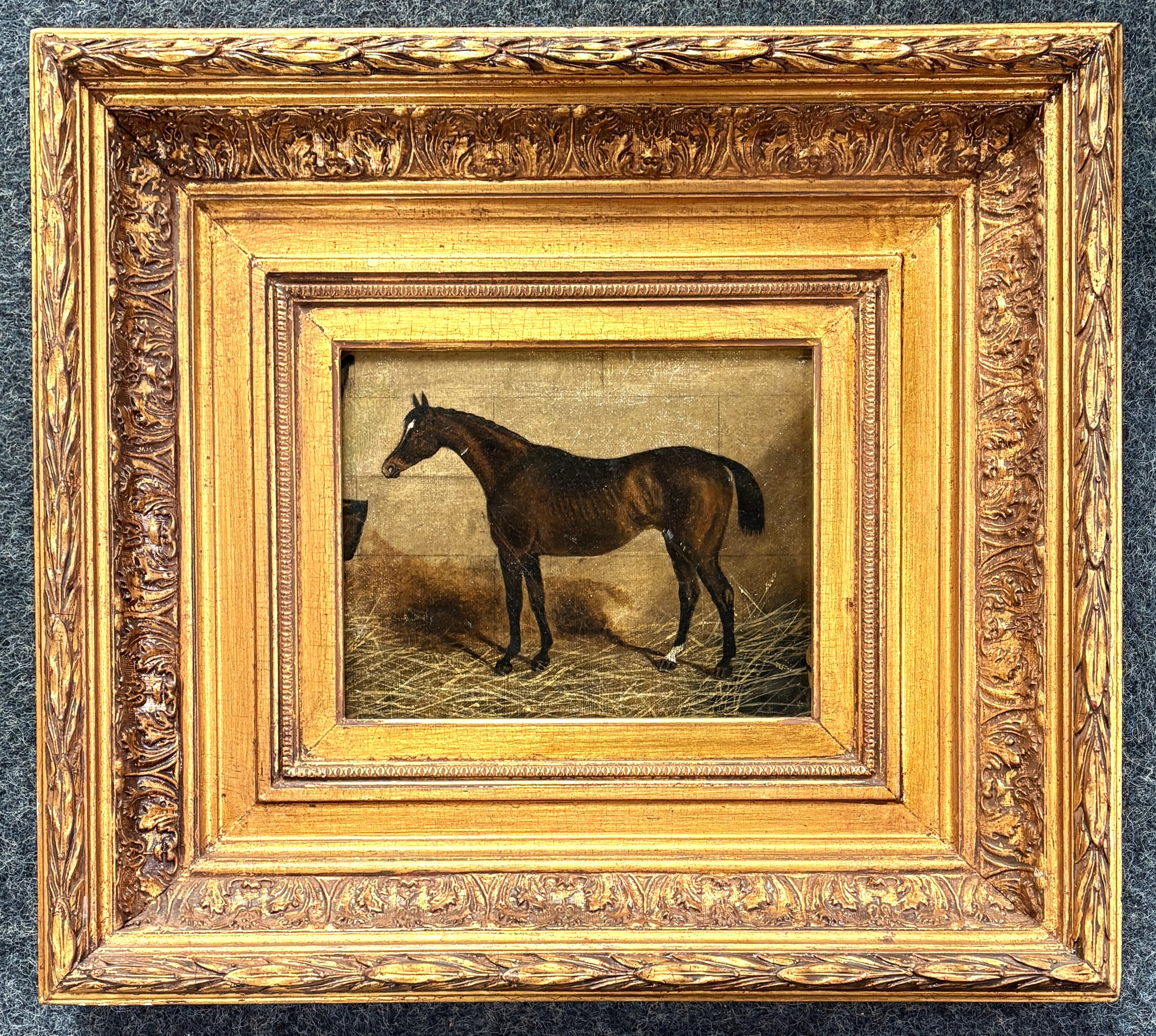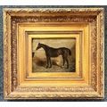 Attributed to John Frederick Herring (Senior) (British, 1795 - 1865), 'Portrait of a horse in a stable', oil on wooden panel, 18cm by 23cm, ornate giltwood frame.