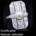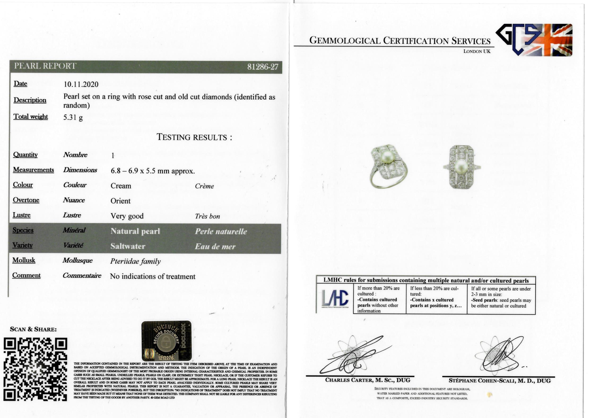 NATURAL SALTWATER PEARL AND DIAMOND RING, set to the center with a natural saltwater pearl of approx. 6.8 -6.9 x 5.5 mm. In openwork head set with diamonds totalling approx. 1.30 ct. Size M 1/2. 5.4 grams. Accompanied by GCS London report No. 81286-27 stating that the pearl is natural, Saltwater, With no indications of treatment.
