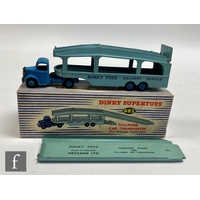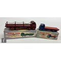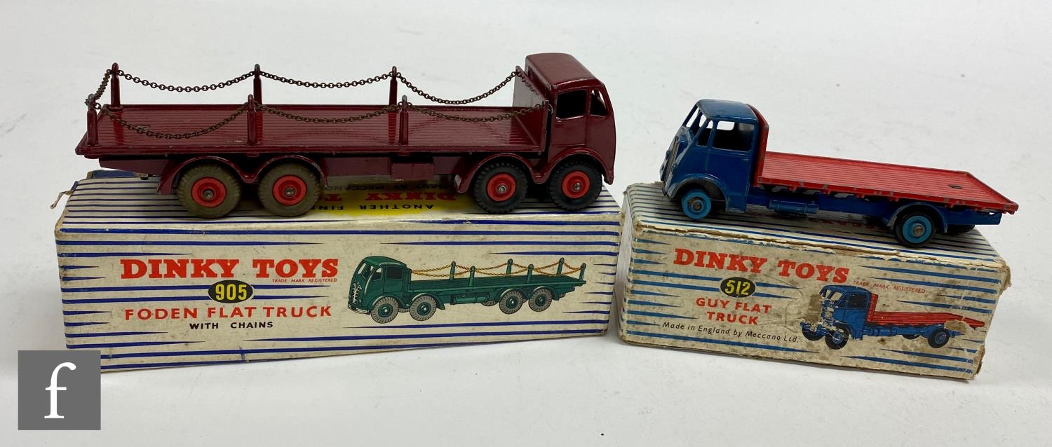Two Dinky Toys diecast models, comprising 905 Foden Flat Truck with chain with maroon cab, flatbed and chassis and red hubs, and a 512 Guy Flat Truck with dark blue cab, red flatbed and mid blue hubs (lacking tyres), both boxed. (2)