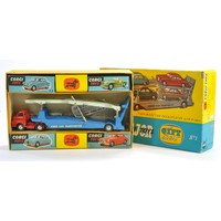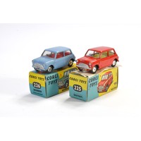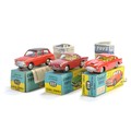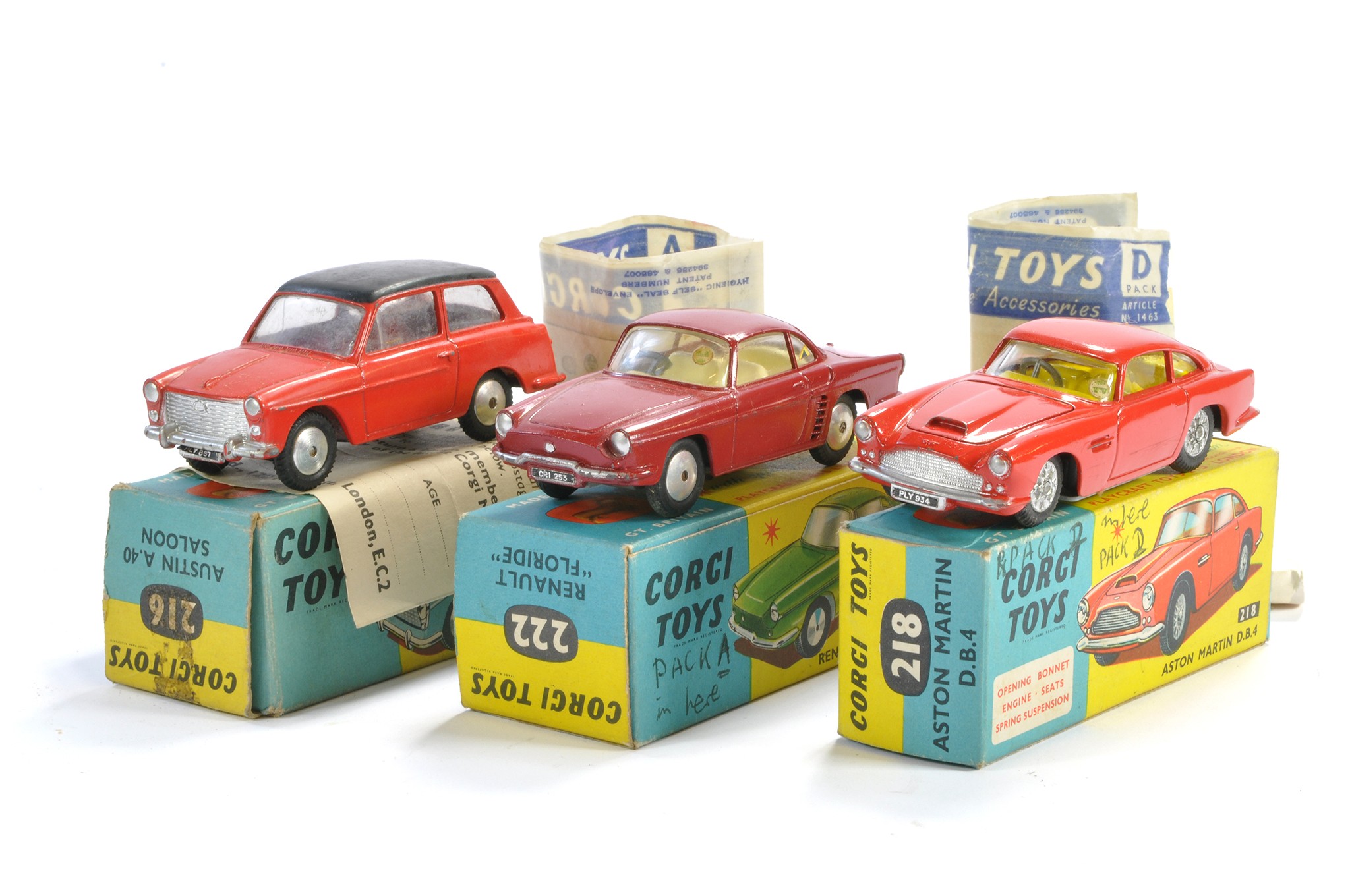 Corgi Trio comprising No. 216 Austin A40 Saloon. Red and Black; Good with some minor playwear plus No. 222 Renault Fluoride. Crimson with off-white interior; very good with minor signs of wear in fair box plus No. 218 Aston Martin DB4. Red with bright lemon interior. Very good, with very minor wear in fair box.