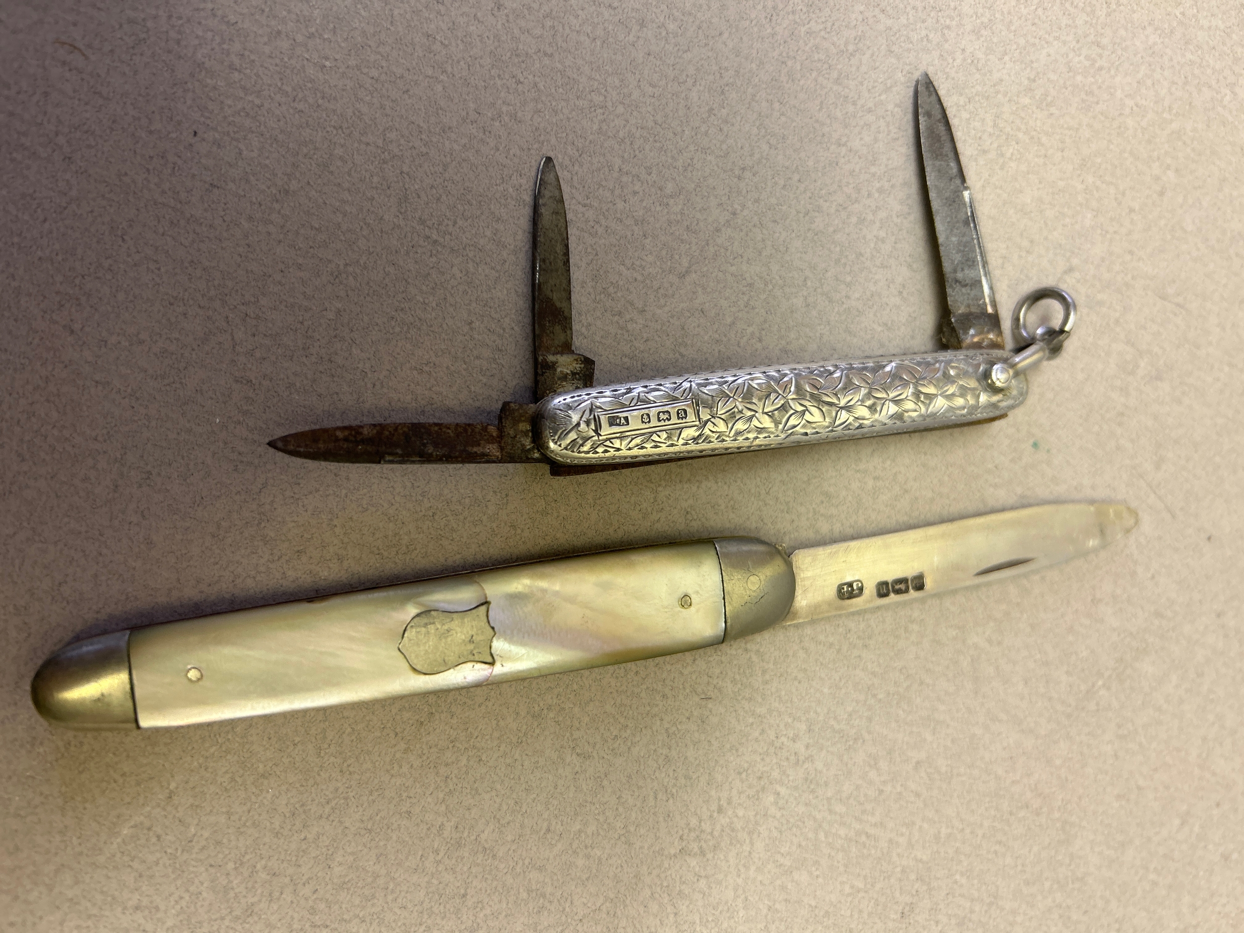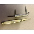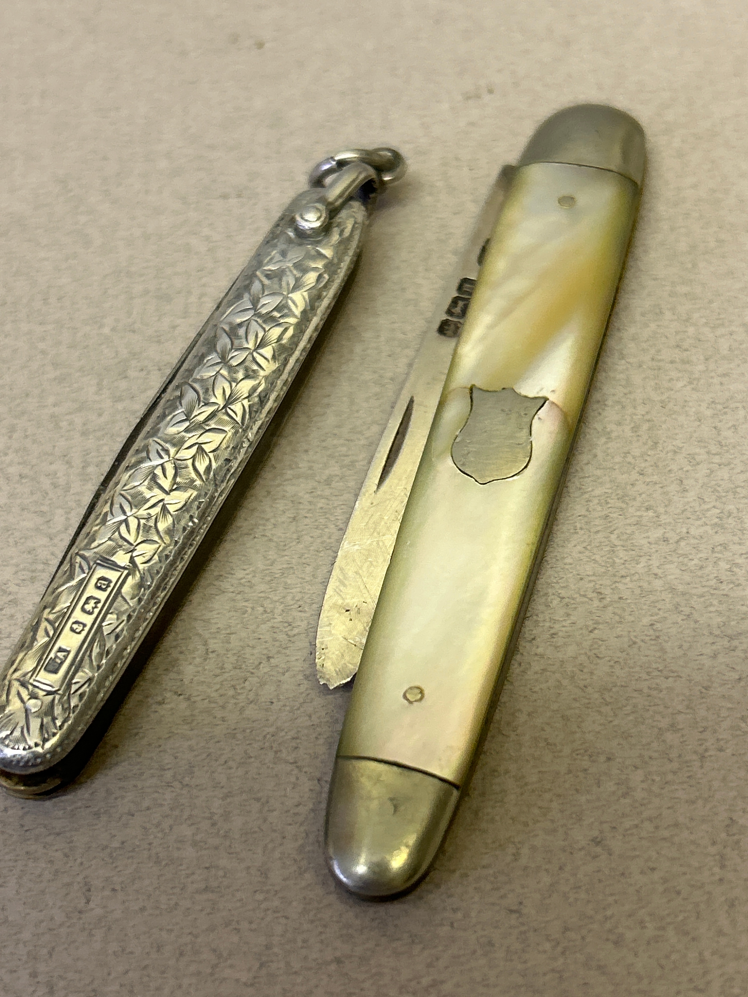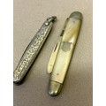 A sterling silver penknife hallmarked Birm 1900 and another fruit knife in Mother of Pearl with silver blade Sheffield 1905 by James Fenton