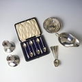 A selection of silver, including a set of three George III teaspoons, possibly Richard Crossley, London 1802, 14cm long, a George V silver sauce boat, Birmingham 1928, 7cm high, with further silver and silver mounted pieces, gross weight 8ozt (qty) (at fault)