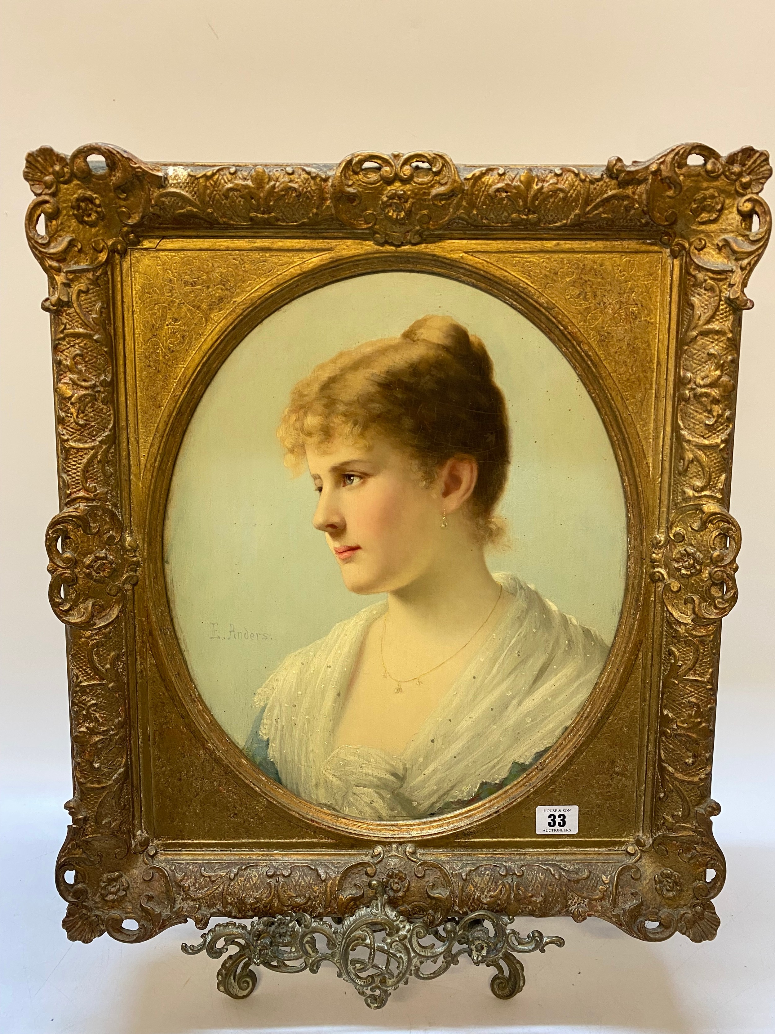 Ernst Anders. A signed oils on panel in an oval - Head of a girl, framed - 15 1/2in. x 13in.