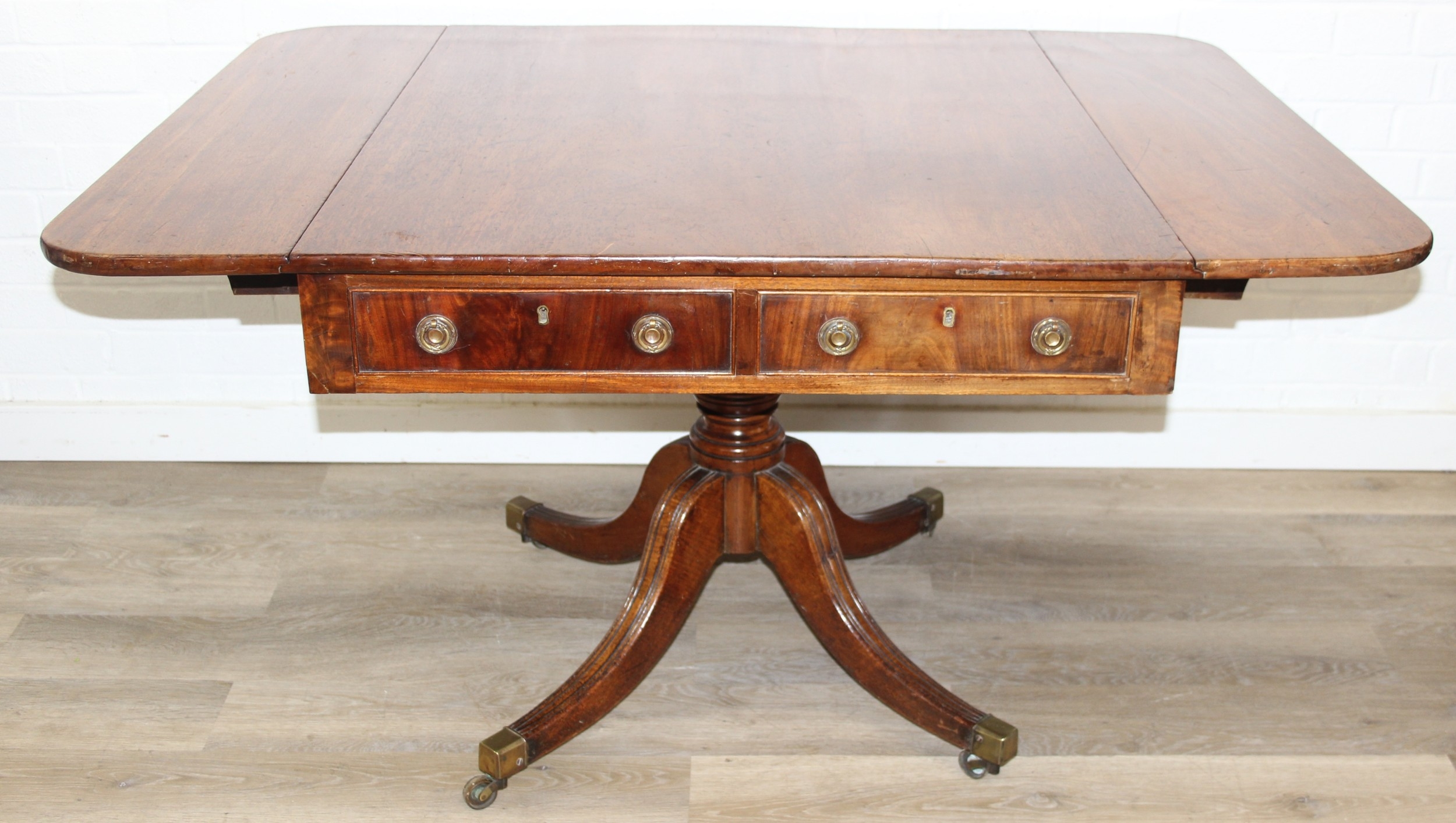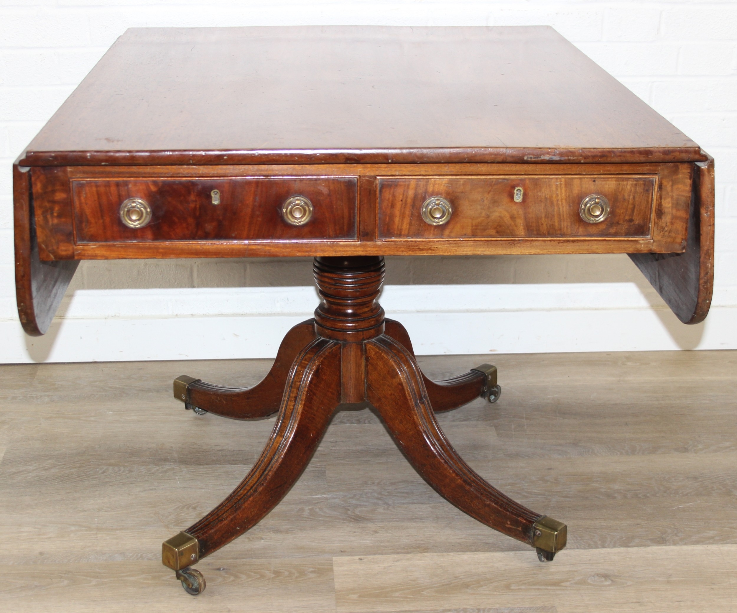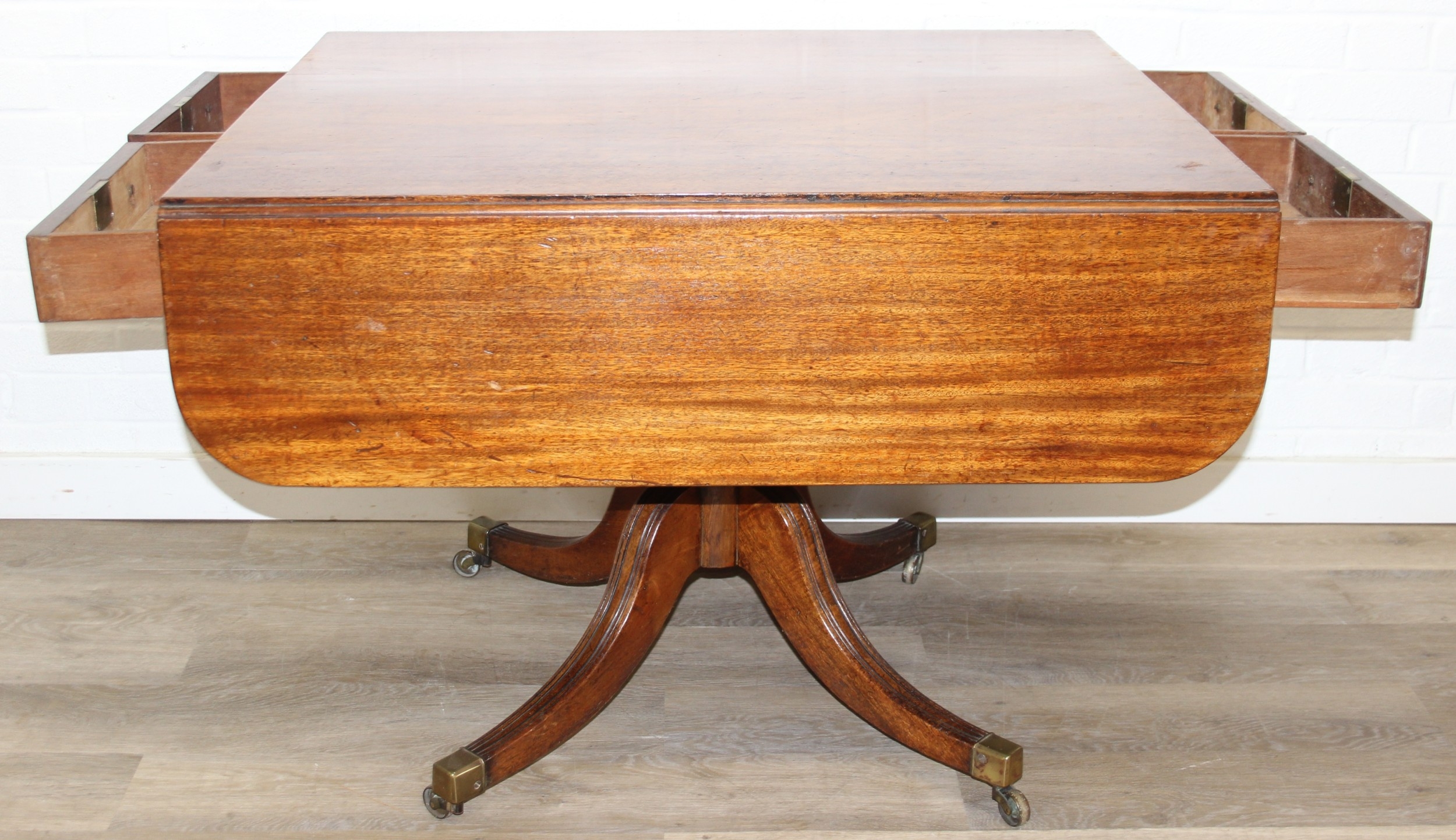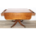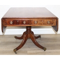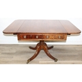 Regency period mahogany drop leaf table with pedestal, splayed base and 4 drawers, 81cm (136cm extended) x 99cm x 72cm