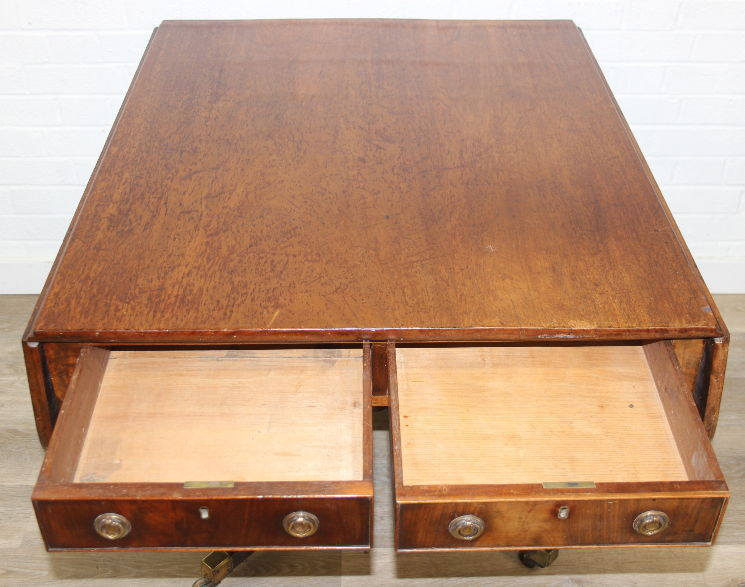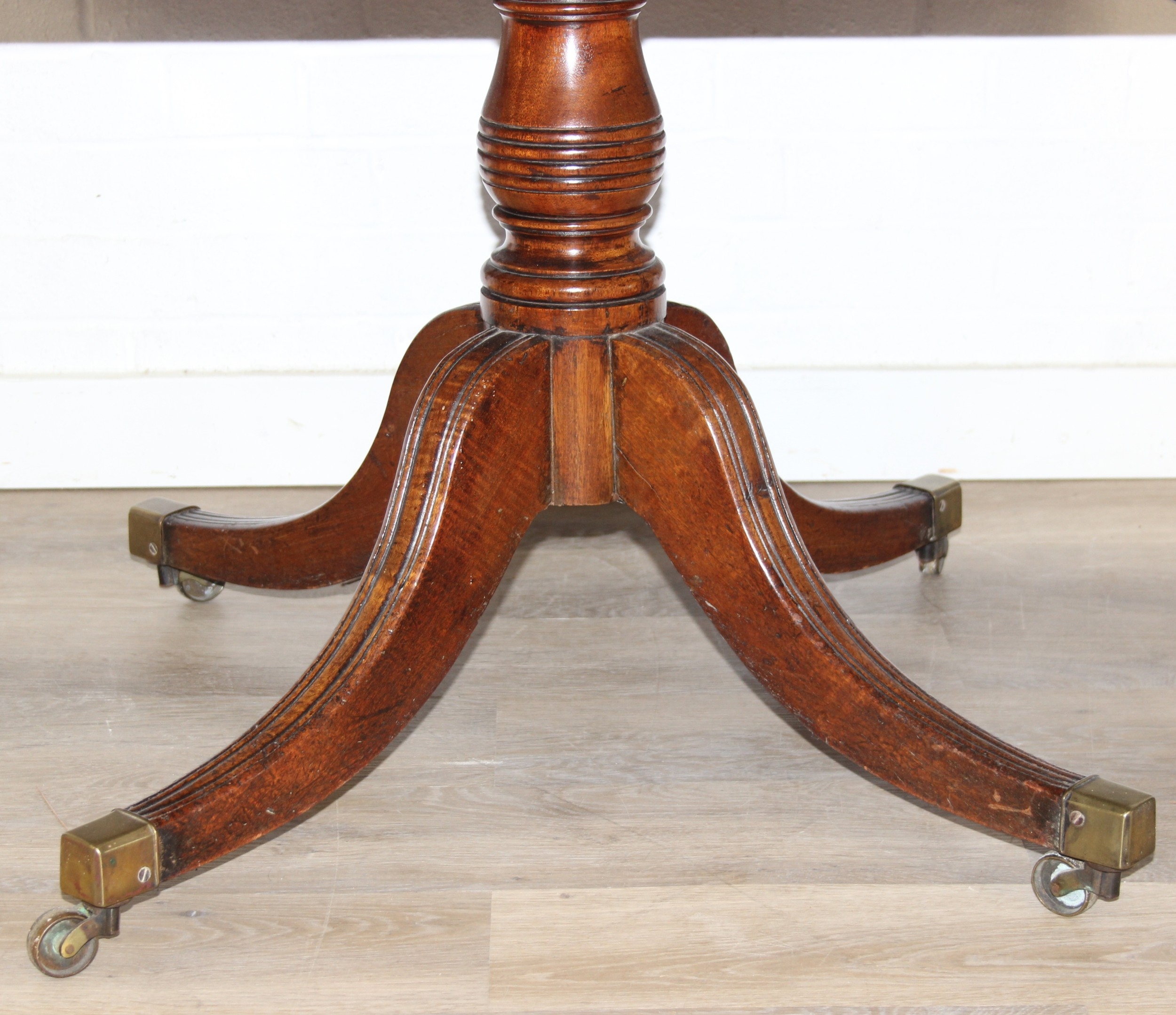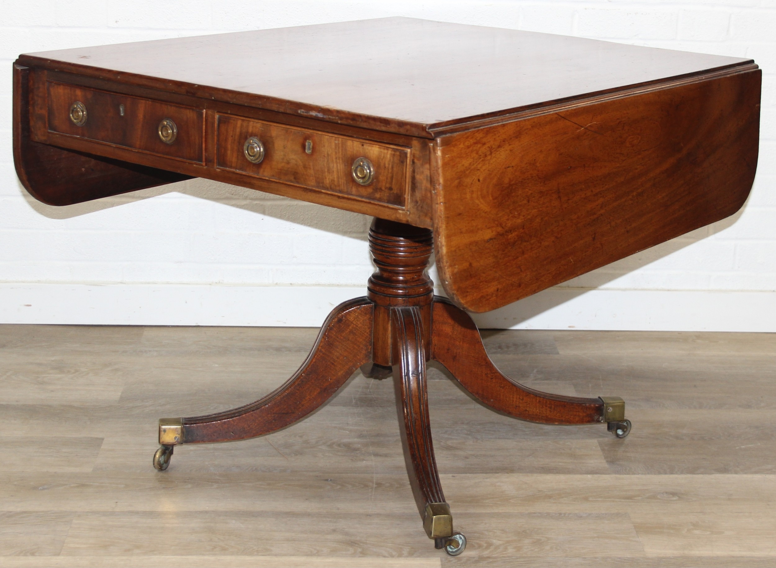 Regency period mahogany drop leaf table with pedestal, splayed base and 4 drawers, 81cm (136cm extended) x 99cm x 72cm
