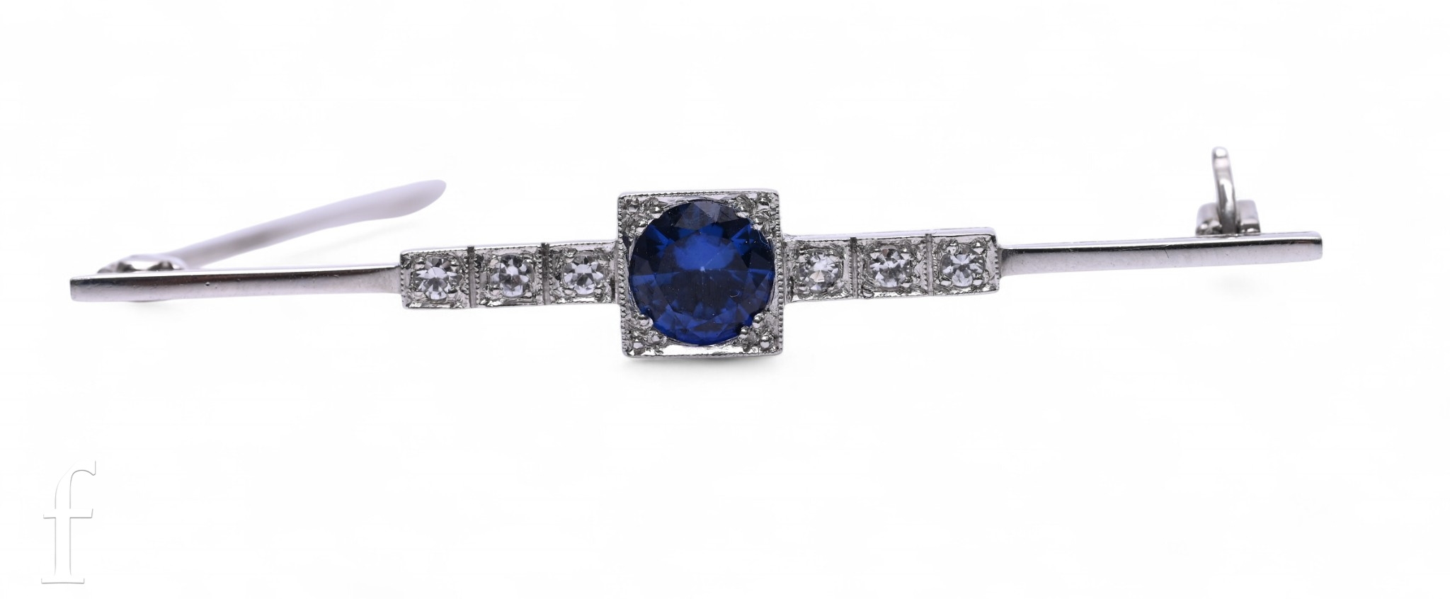 A sapphire and diamond brooch, the circular mixed-cut sapphire claw set within a square mount with millegrain edge, set between six brilliant-cut diamonds similarly set above knife edge bar, total weight 5.2g, 5cm x 1.2cm.