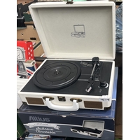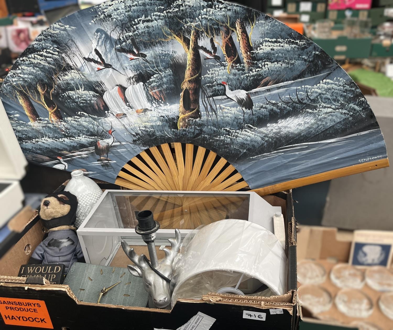 Box containing a quantity of home decor items and a large 'crane' hand fan