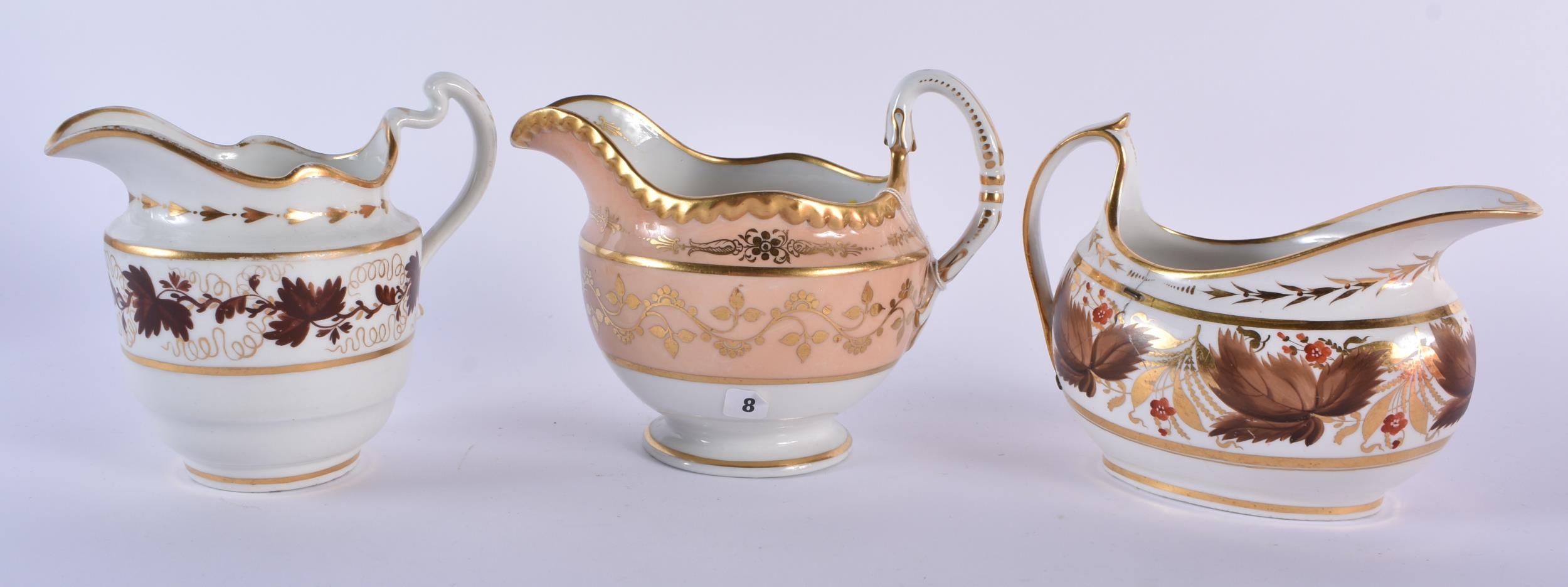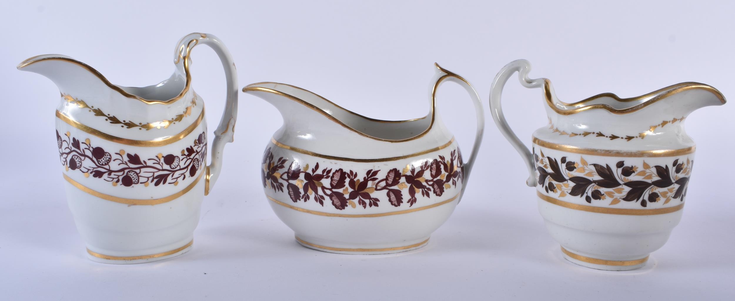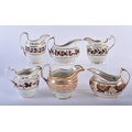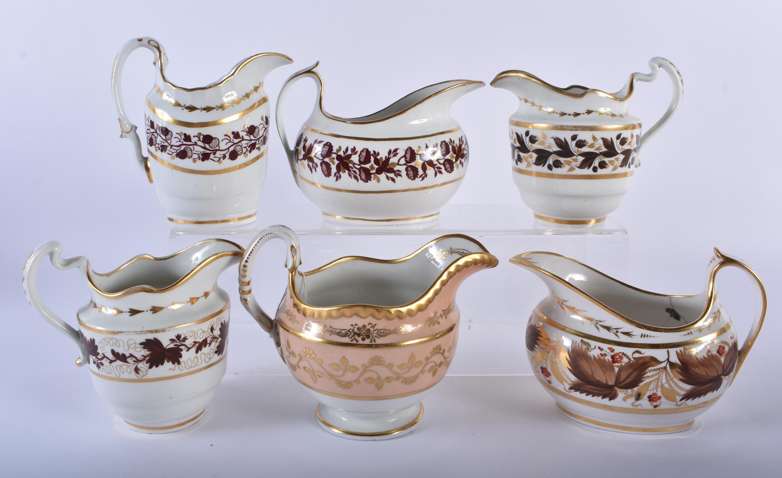 A SET OF SIX EARLY 19TH CENTURY FLIGHT BARR AND BARR CREAM JUGS in various forms and sizes. Largest 12.5cm wide. (6)