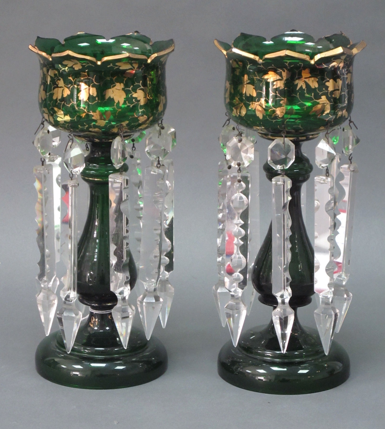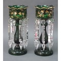 A Pair of Late XIX Century Green Glass Table Lustres, with gilt leaf decoration, each hung with prismatic drops, 29cm high. (2)