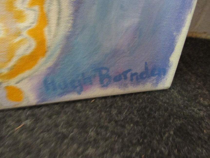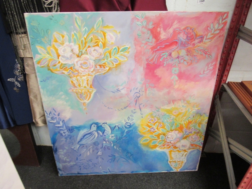 HUGH BARNDEN (b.1946): An unframed oil on canvas titled "Two Doves No.3". Signed bottom right. Overall size 101cm x 96cm (E) £30-40