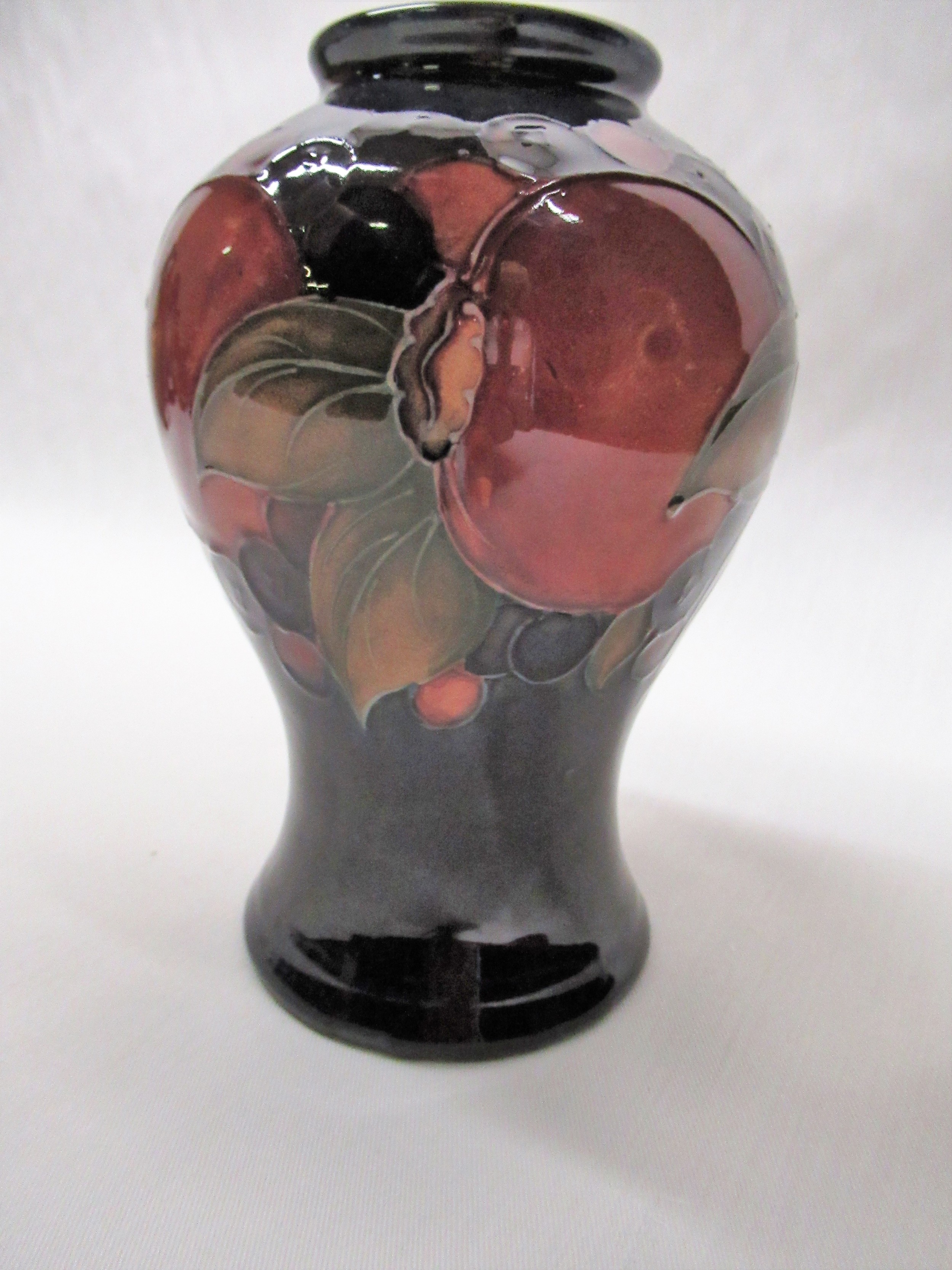 Moorcroft baluster vase decorated in Pomegranate pattern on a blue ground, impressed marks and green signature to base, H16cm