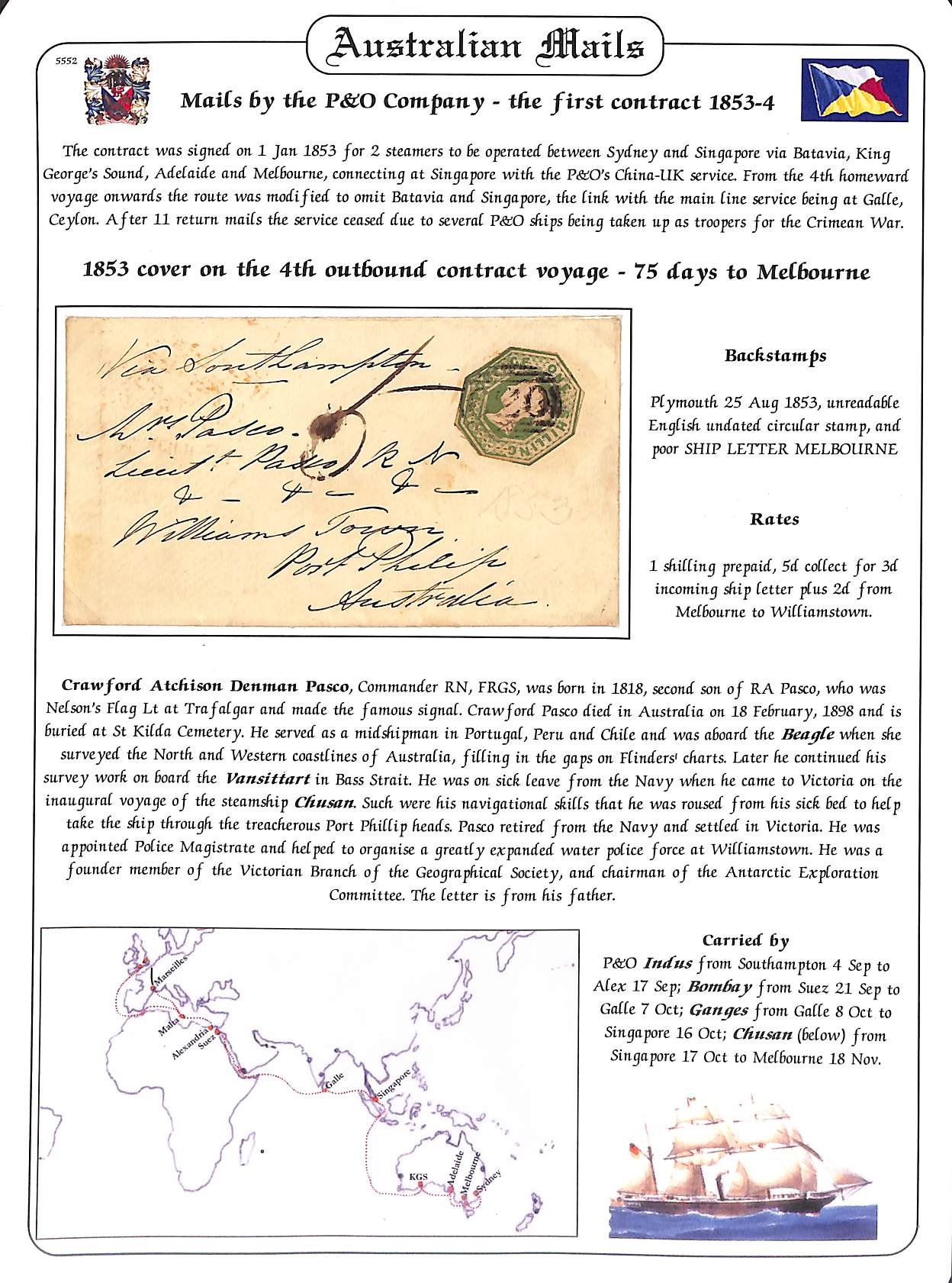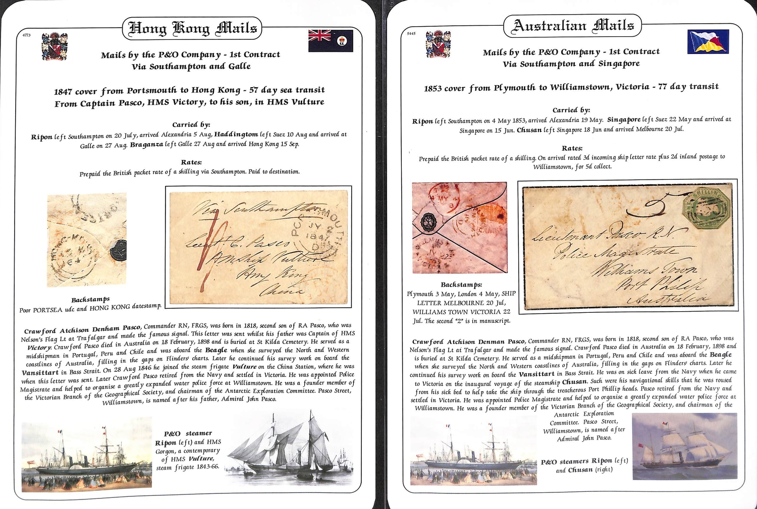 1847-53 Covers from G.B to Lieut. C.A Pascoe (son of Nelsons Flag Lt. at Trafalgar), comprising stampless 1847 cover from his father at Portsea prepaid 1/- in cash to H.M.S "Vulture", Hong Kong with double arc arrival backstamp; and two 1853 covers from Plymouth franked embossed 1/- (cut to shape) sent to Pascoe as Police Magistrate at Williams Town, Victoria. Pascoe served on H.M.S "Beagle" on a survey of north Australia in 1839, retiring from the navy in 1851 and moving to Victoria. (3).