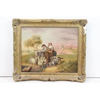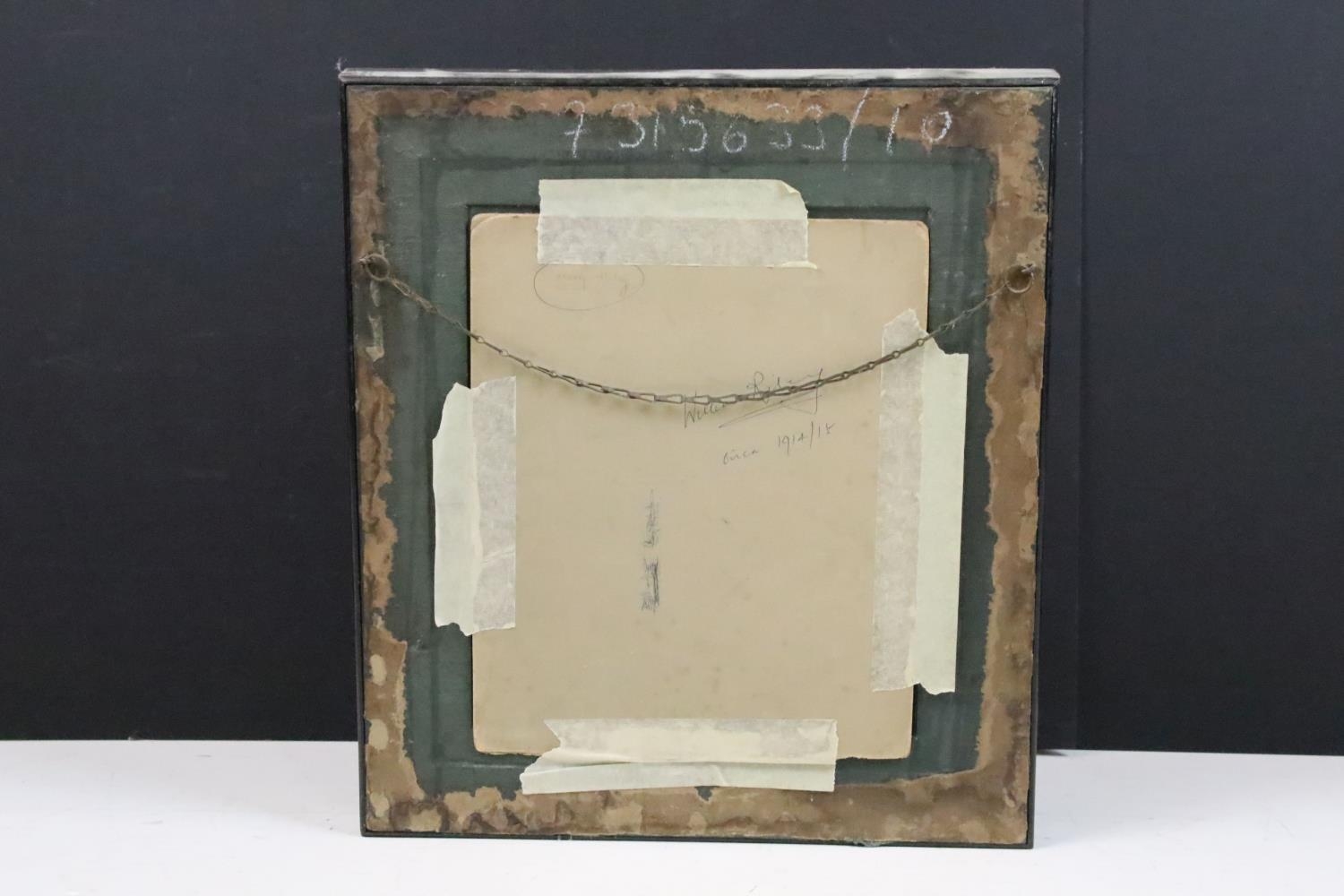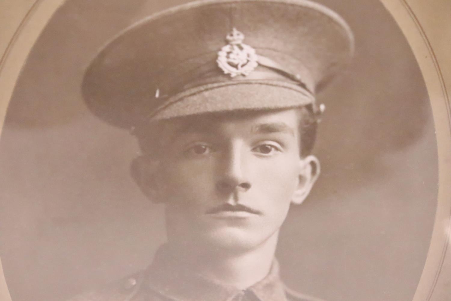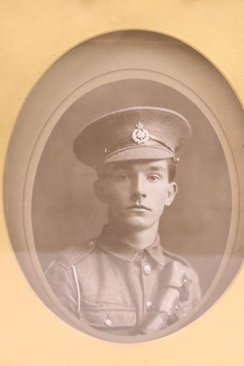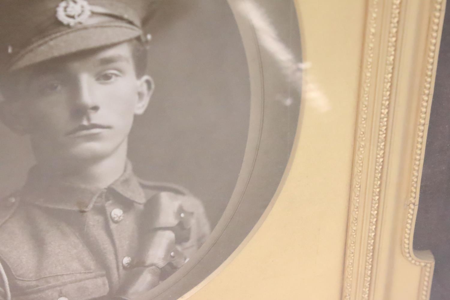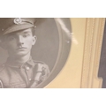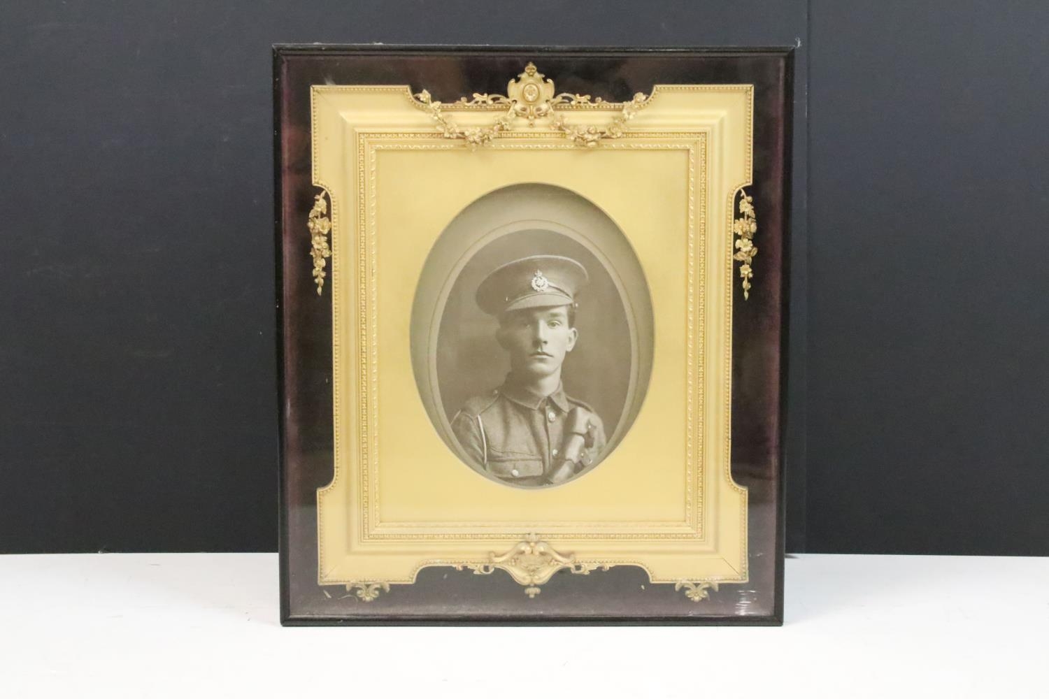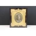 A late 19th century picture frame, the stained rosewood outer case with glazed panel enclosing an ornate giltwood and gesso frame with floral swag decoration and oval slip, containing a military photograph, ' a portrait by Horace Dudley ', inscribed verso ' William Riley circa 1914/15 ', 45 x 39cm overall
