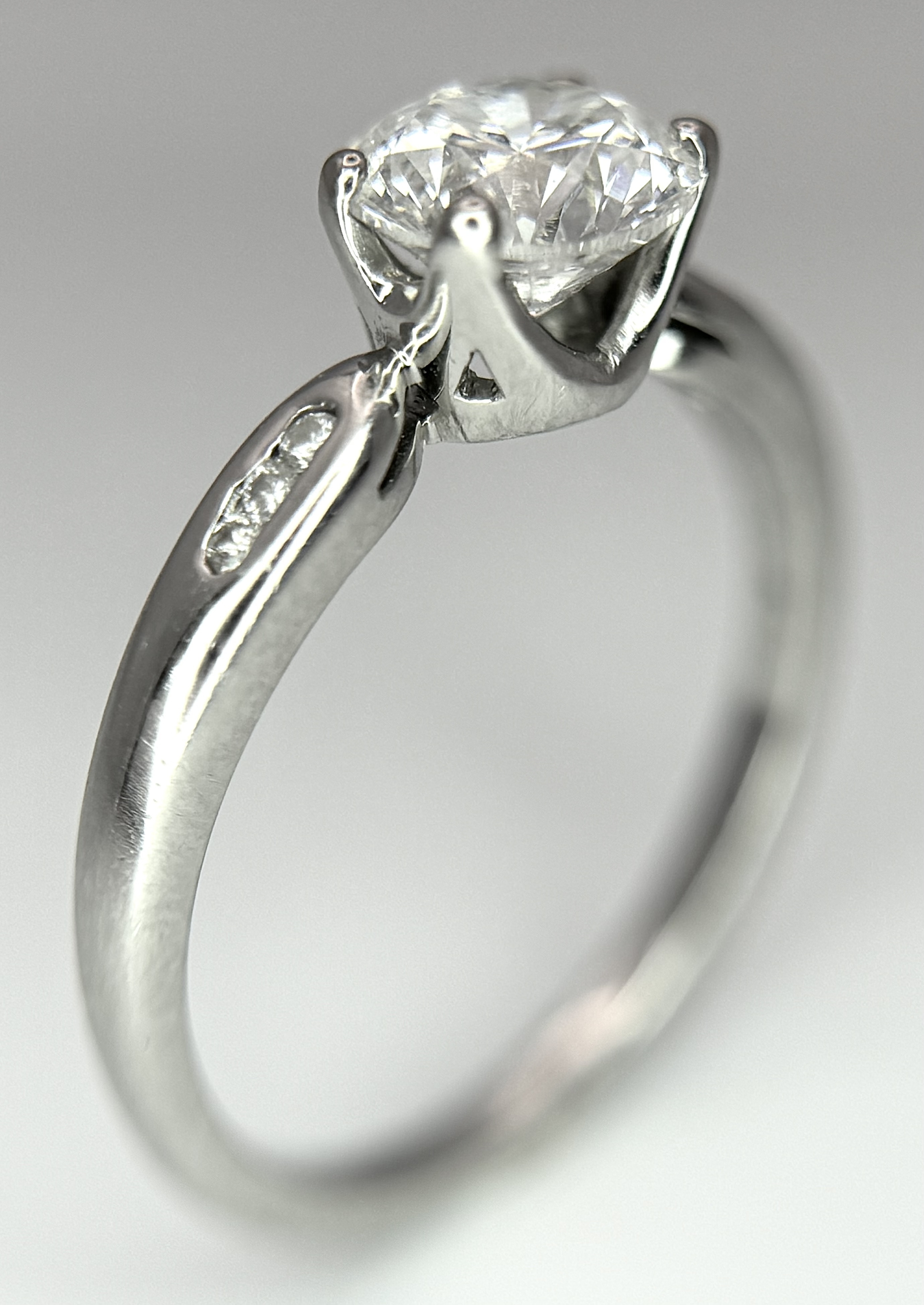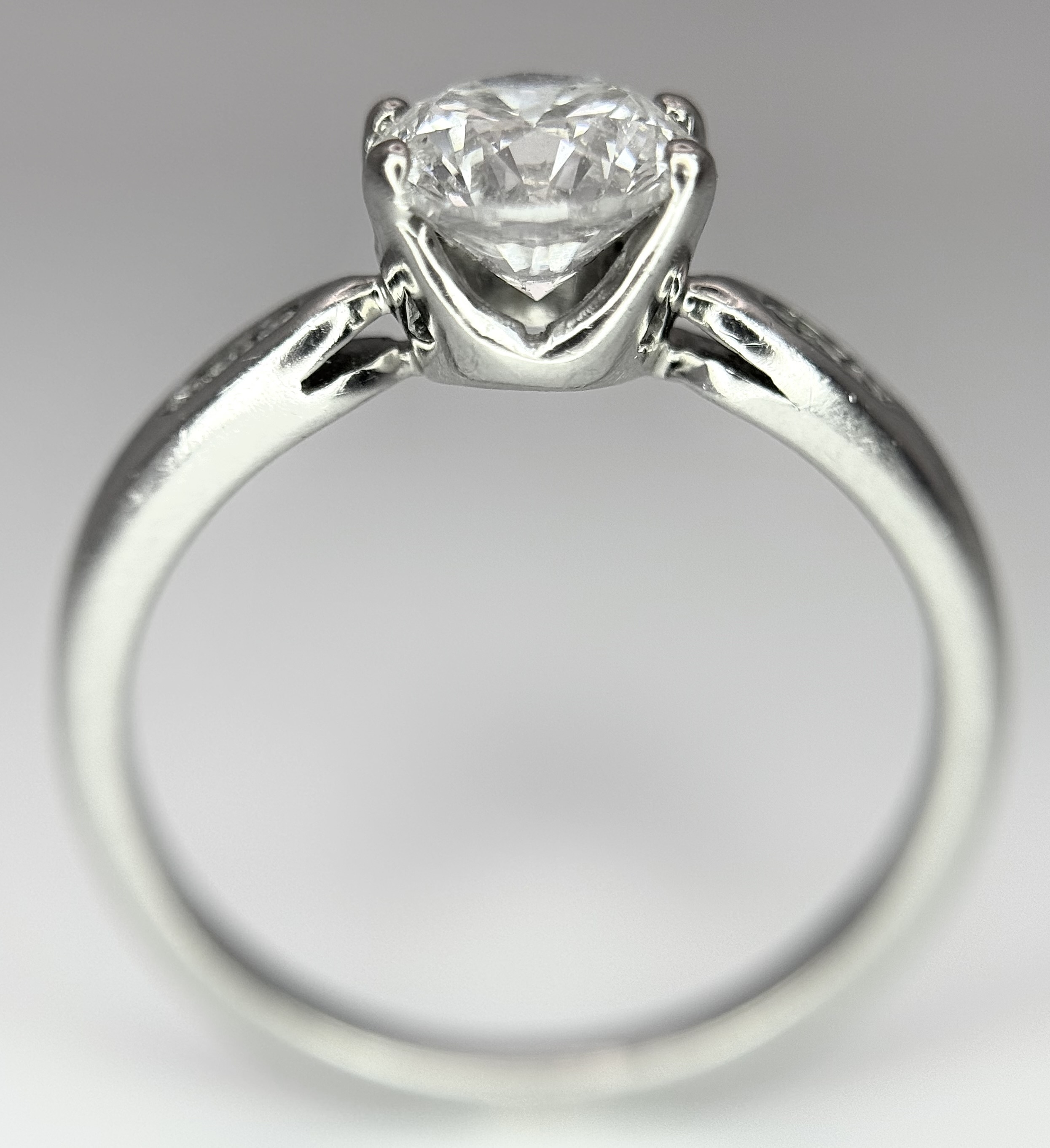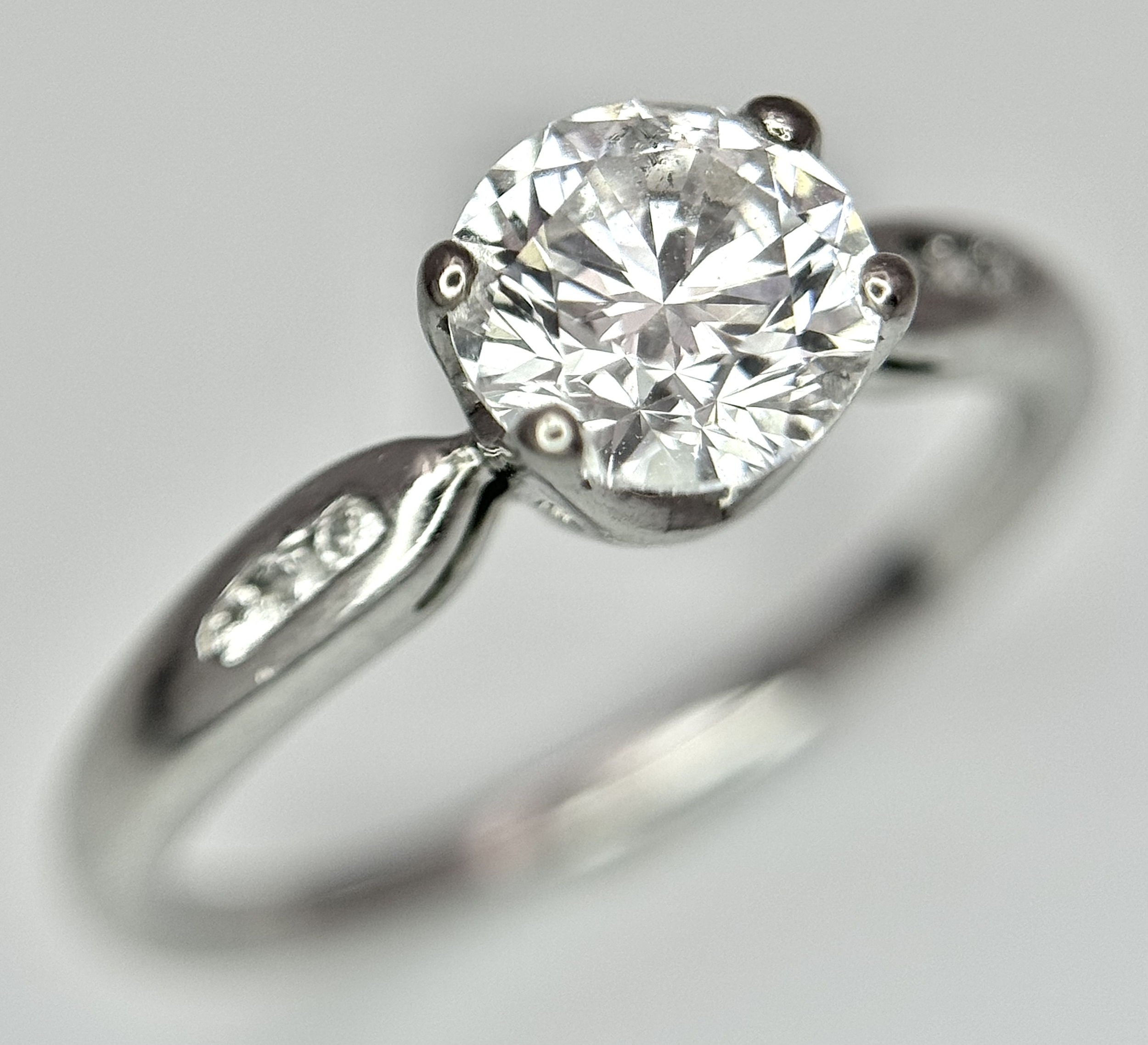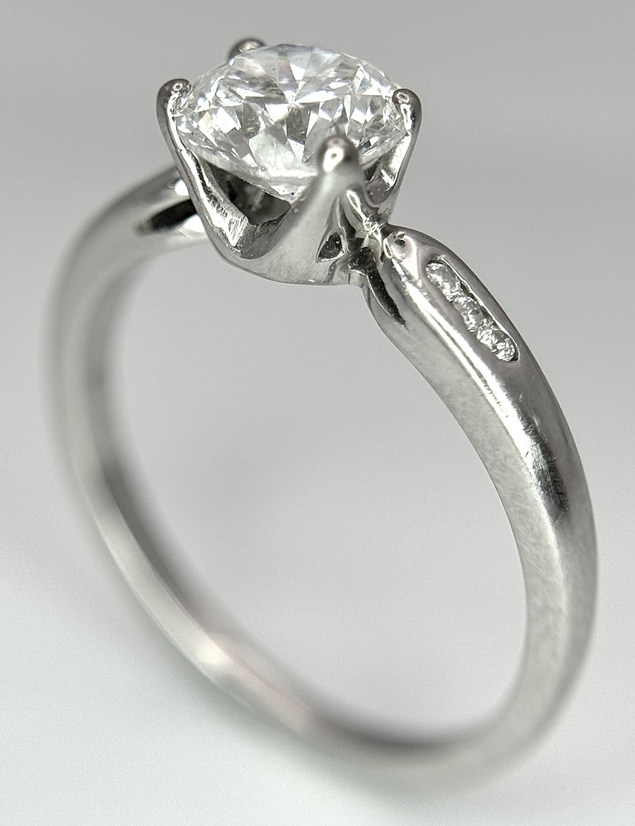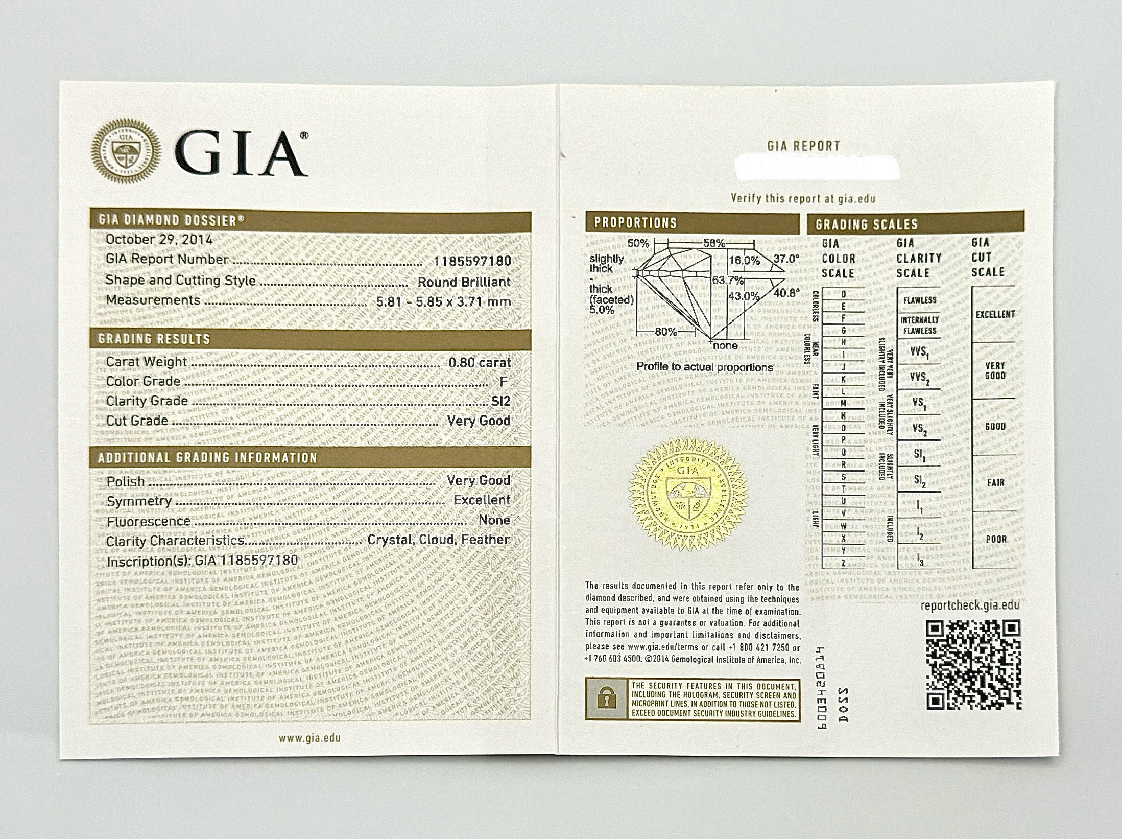 A GIA Certified Diamond Solitaire Ring. 0.80ct round brilliant cut diamond - SI2. F colour. Size I 1/2. 2.7g total weight. Ref: STK005736